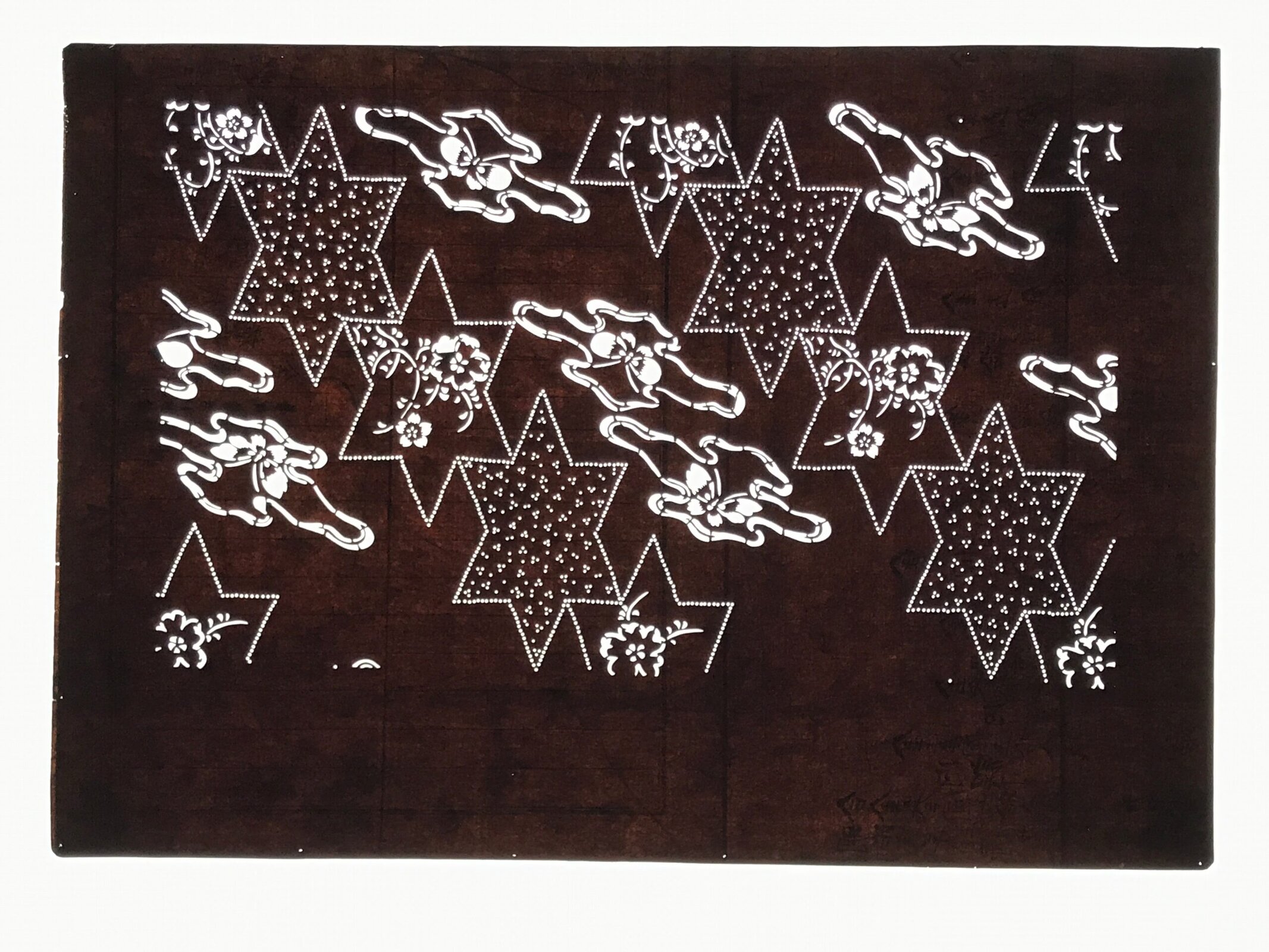 This antique Katagami was designed during the mid or late Edo period (1860) to early Meiji (1900) in Central Japan. It is made of two or more layers of handmade mulberry washi paper laminated together and waterproofed with persimmon tannin. Katagami printing uses a technique called resist dye where a paste is applied to the fabric with the katagami before dipping in ink. The open space on the katagami will be a negative space in the printed design.