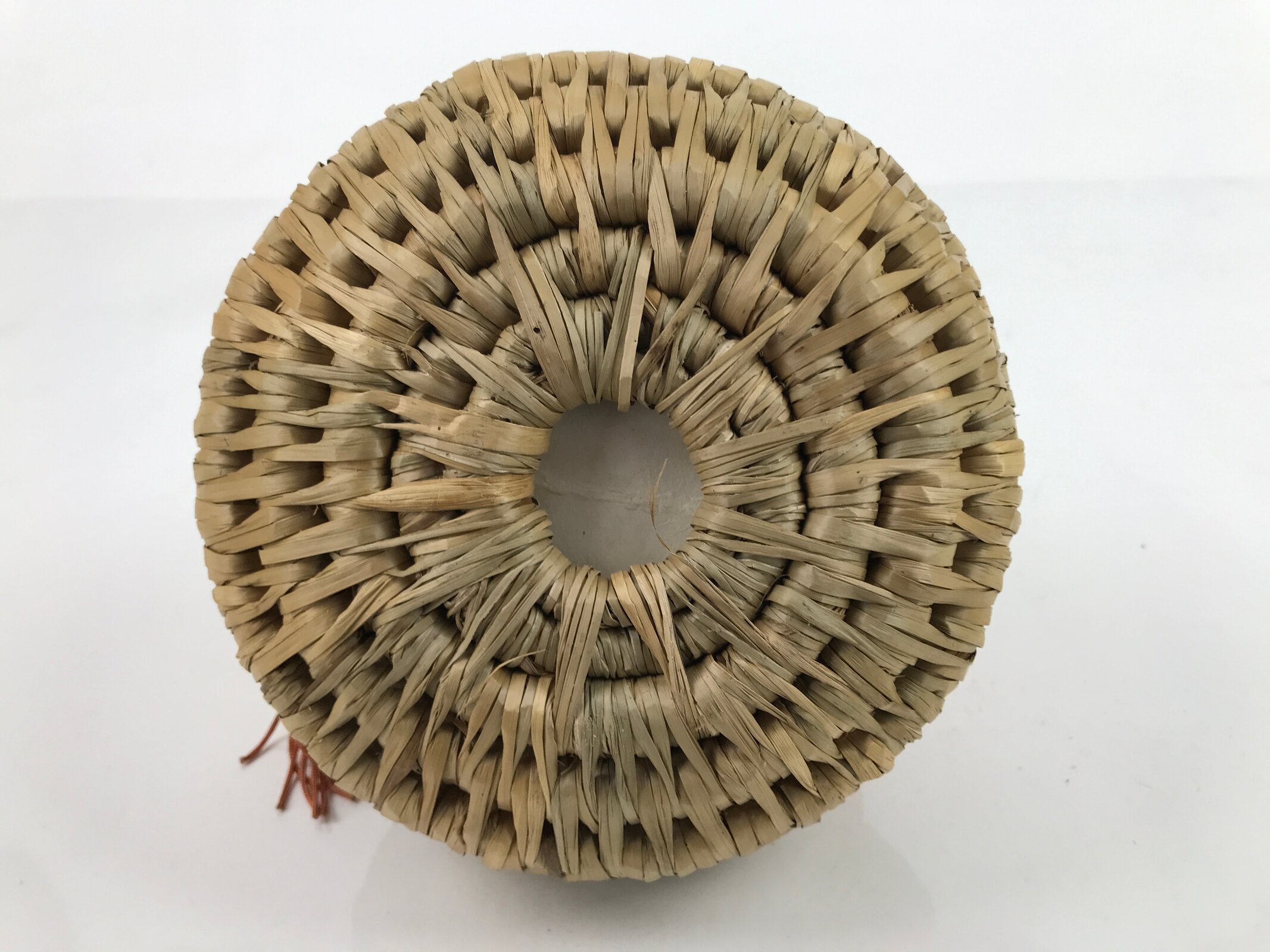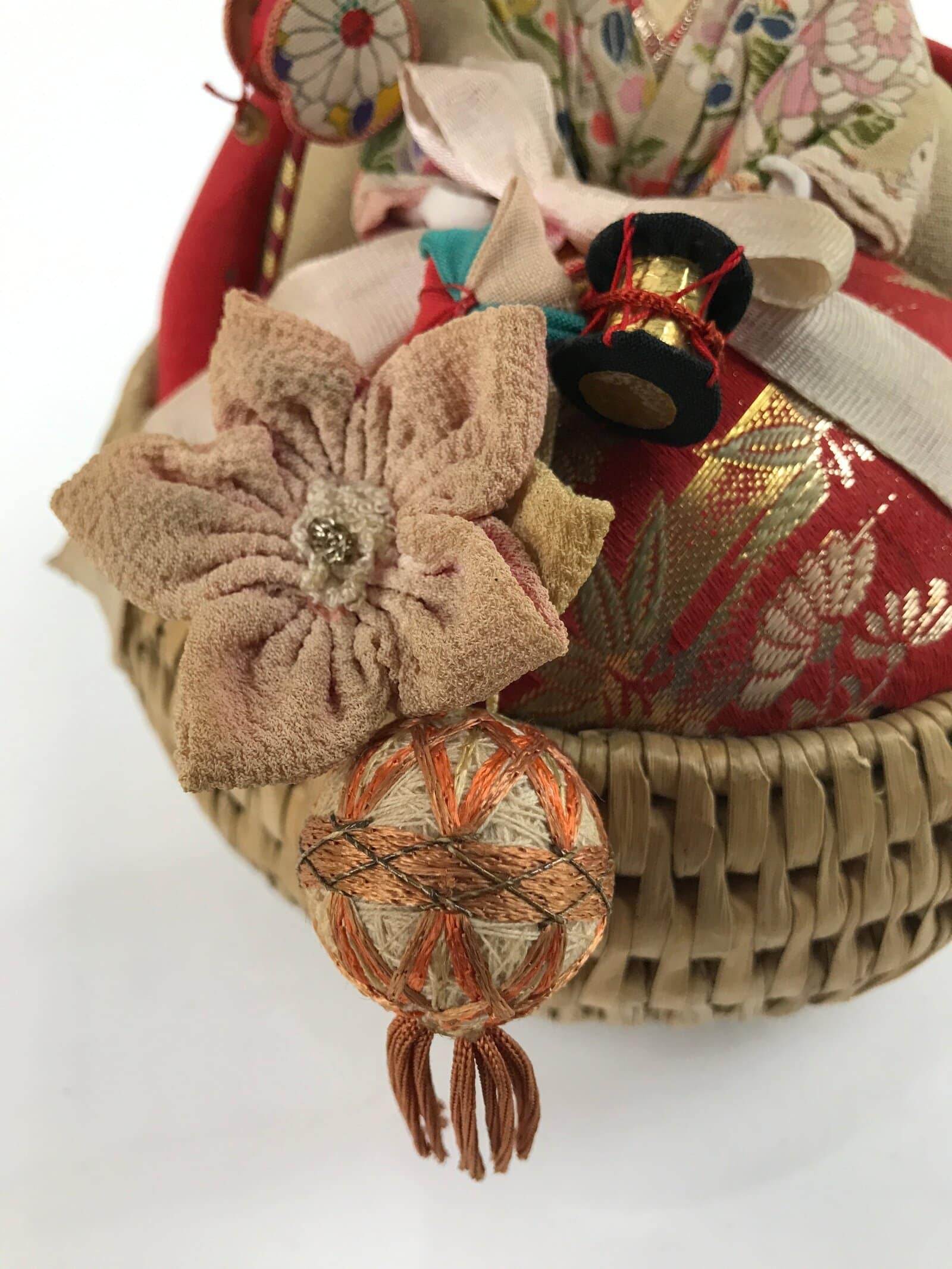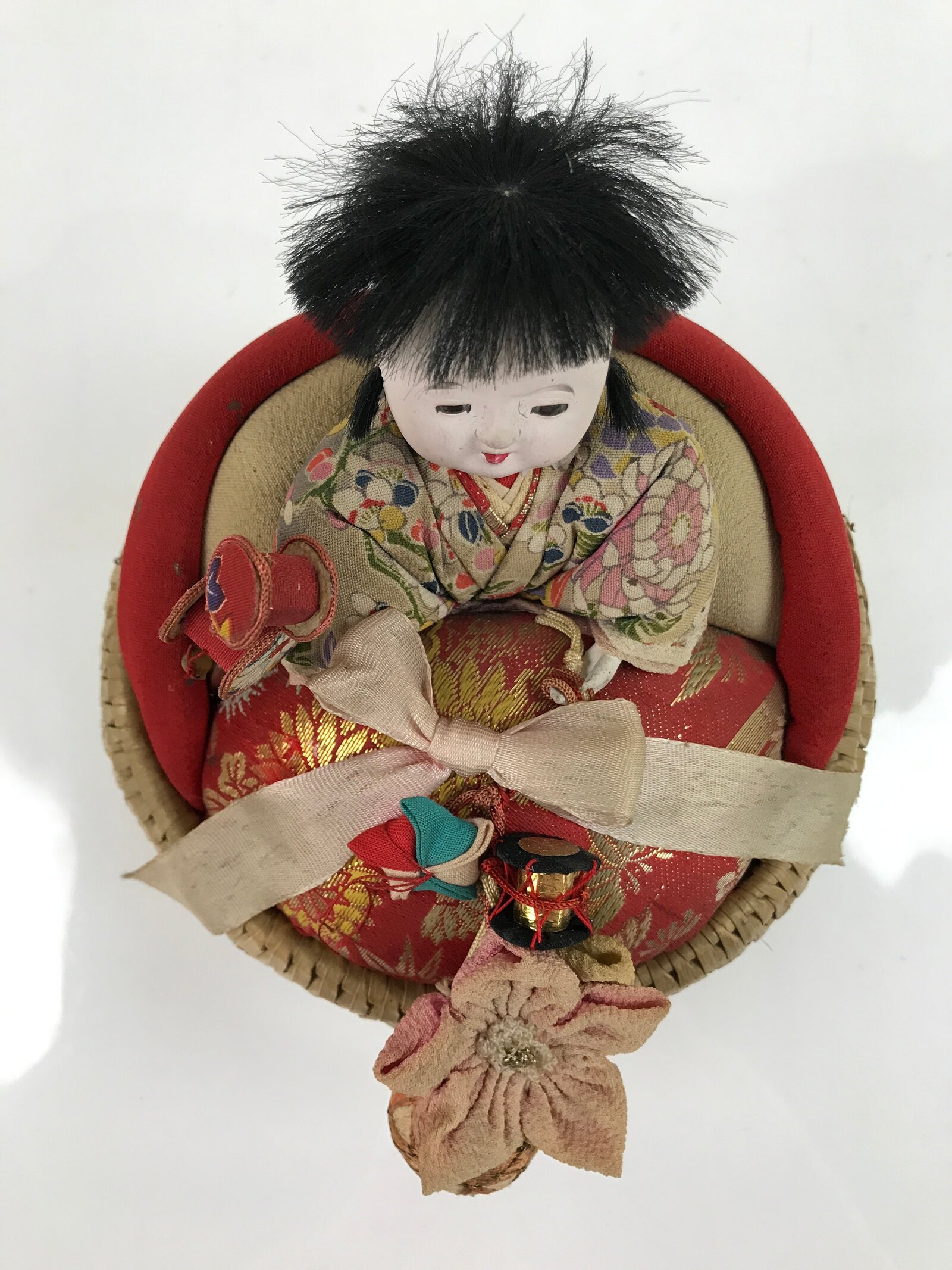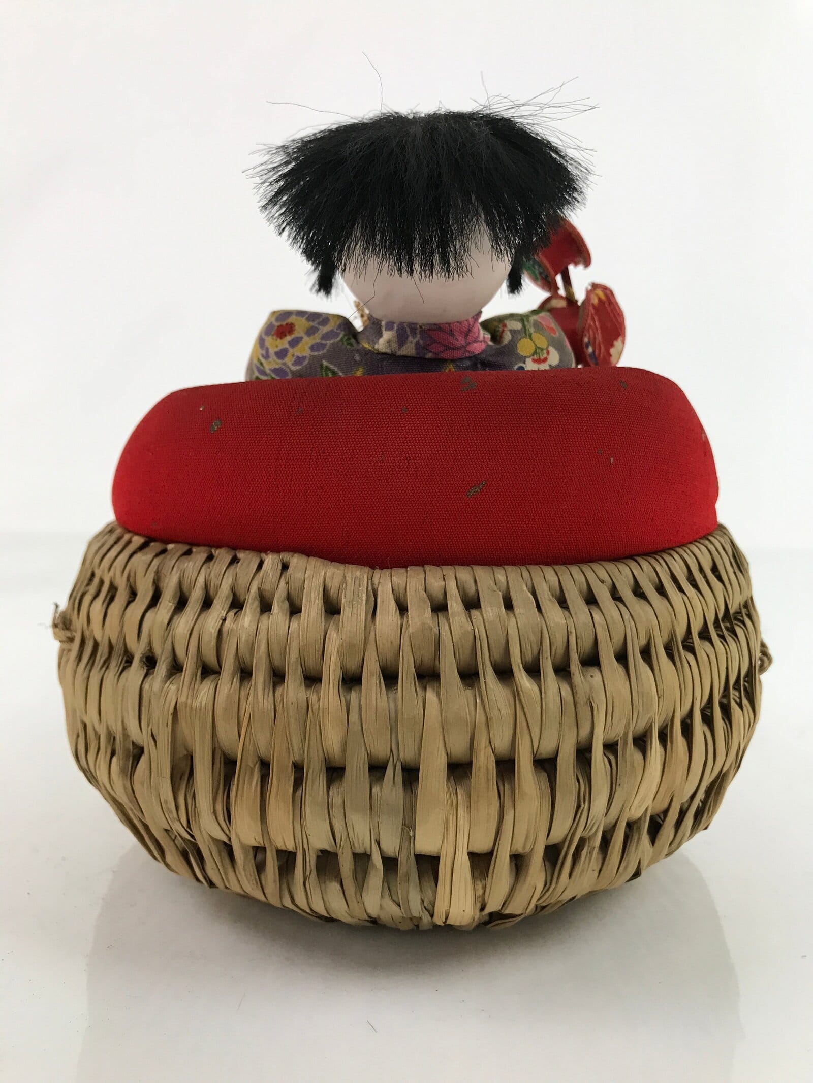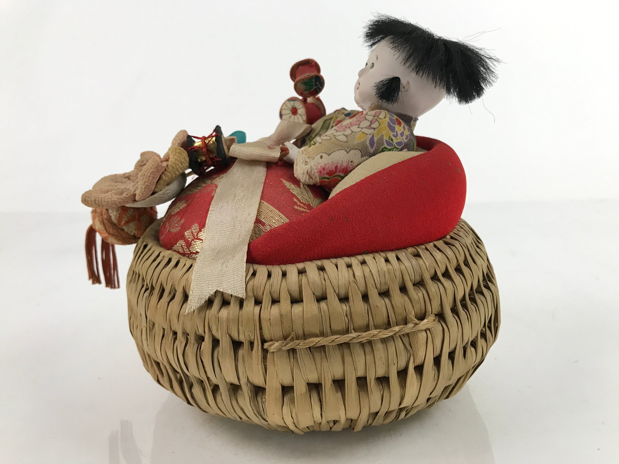 This is a vintage Japanese basket baby doll called izumeko. It is a traditional handicraft from Yamagata Prefecture that features a baby swaddled in a straw or rush basket with small toys. These dolls were modeled after the method of carrying and keeping babies pre-war in the Tohoku region. Mothers packed their babies into small baskets to keep them near, but still allow them to do farming work during the day.