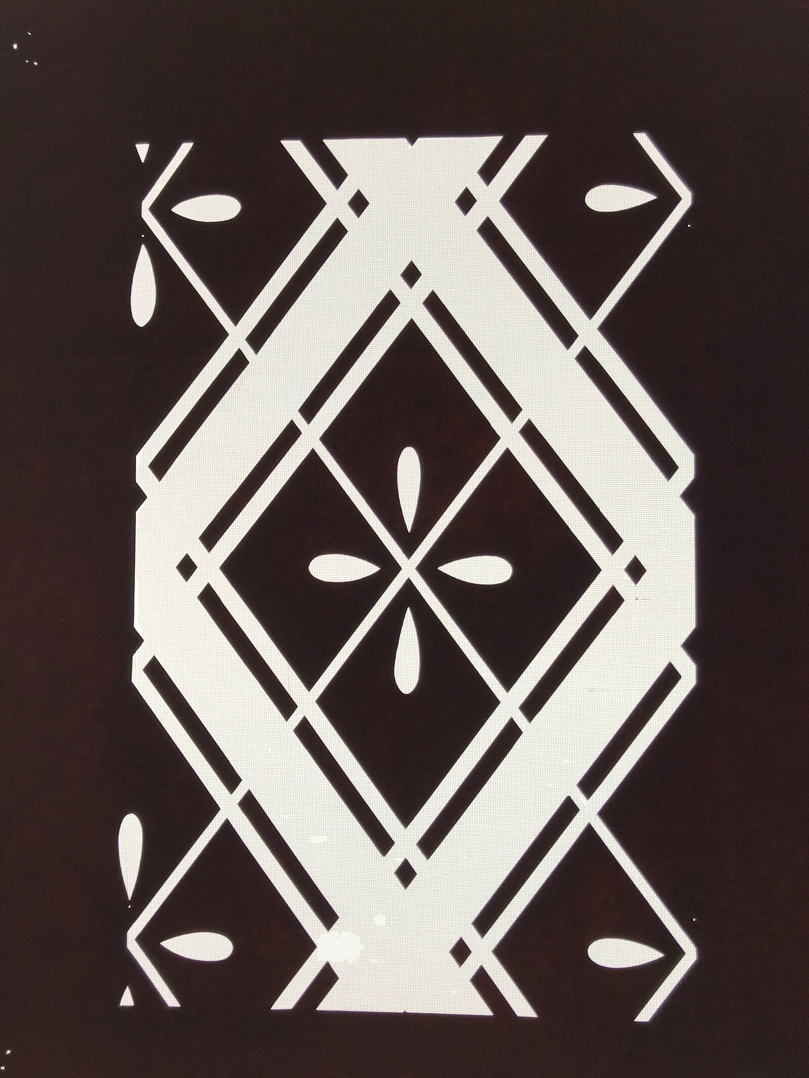 This antique Katagami was designed during the mid or late Edo period (1860) to early Meiji (1900) in Central Japan. It is made of two or more layers of handmade mulberry paper laminated together and waterproofed with persimmon tannin. Katagami printing uses a technique called resist dye where a paste is applied to the fabric with the katagami before dipping in ink. The open space on the katagami will be a negative space in the printed design.