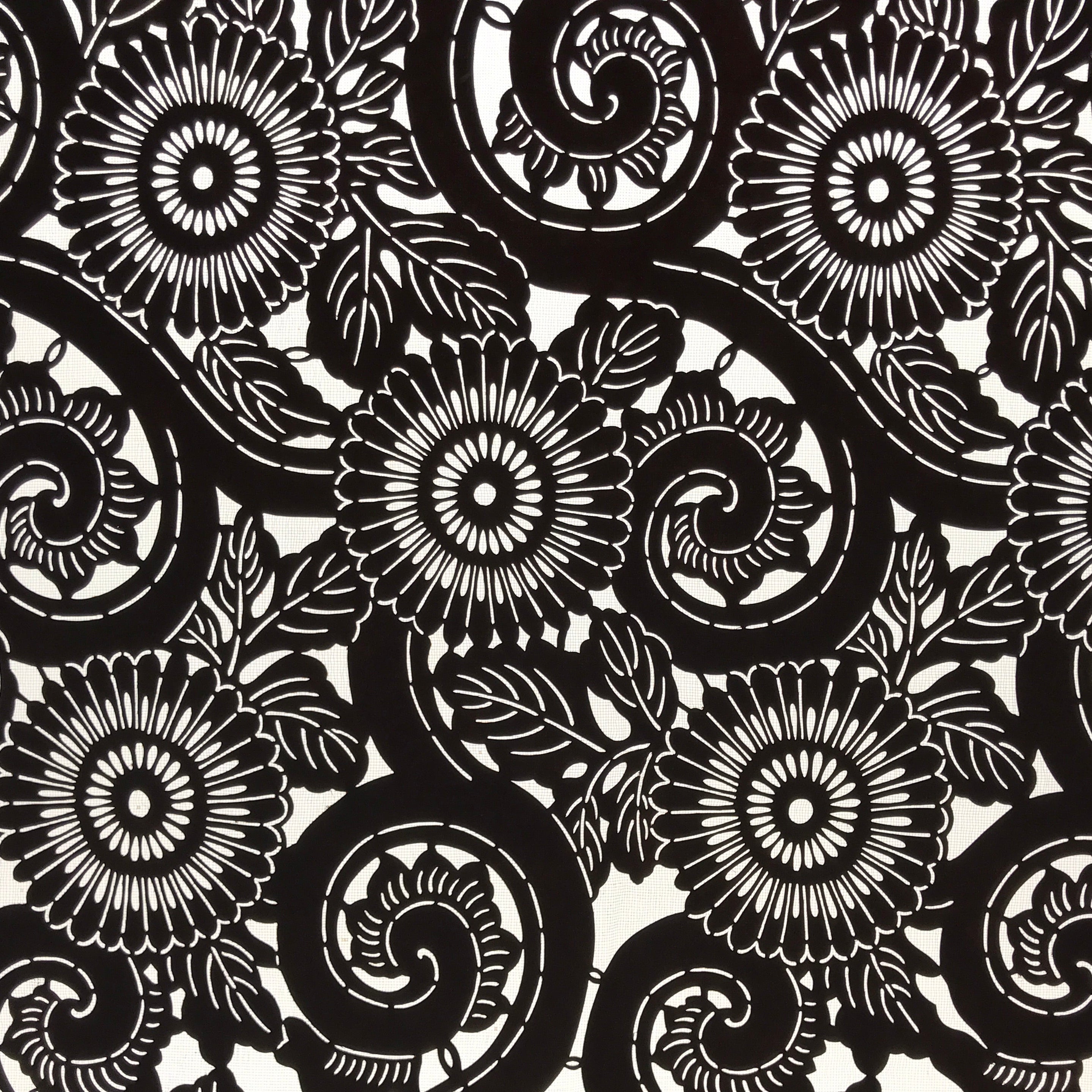 Using traditional mulberry paper, this katagami stencil with silk mesh backing features large, round chrysanthemums (kiku) among leaves and karakusa vines.