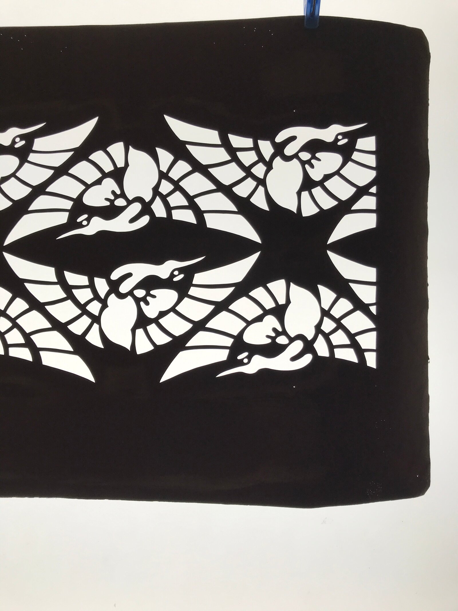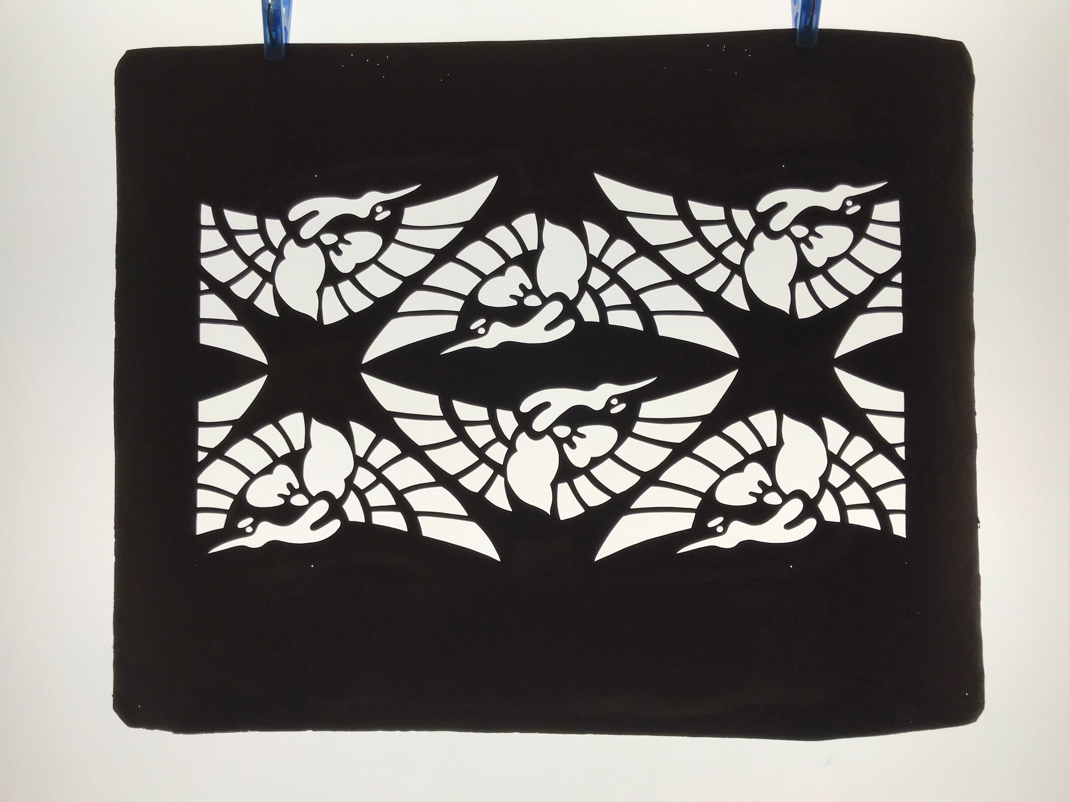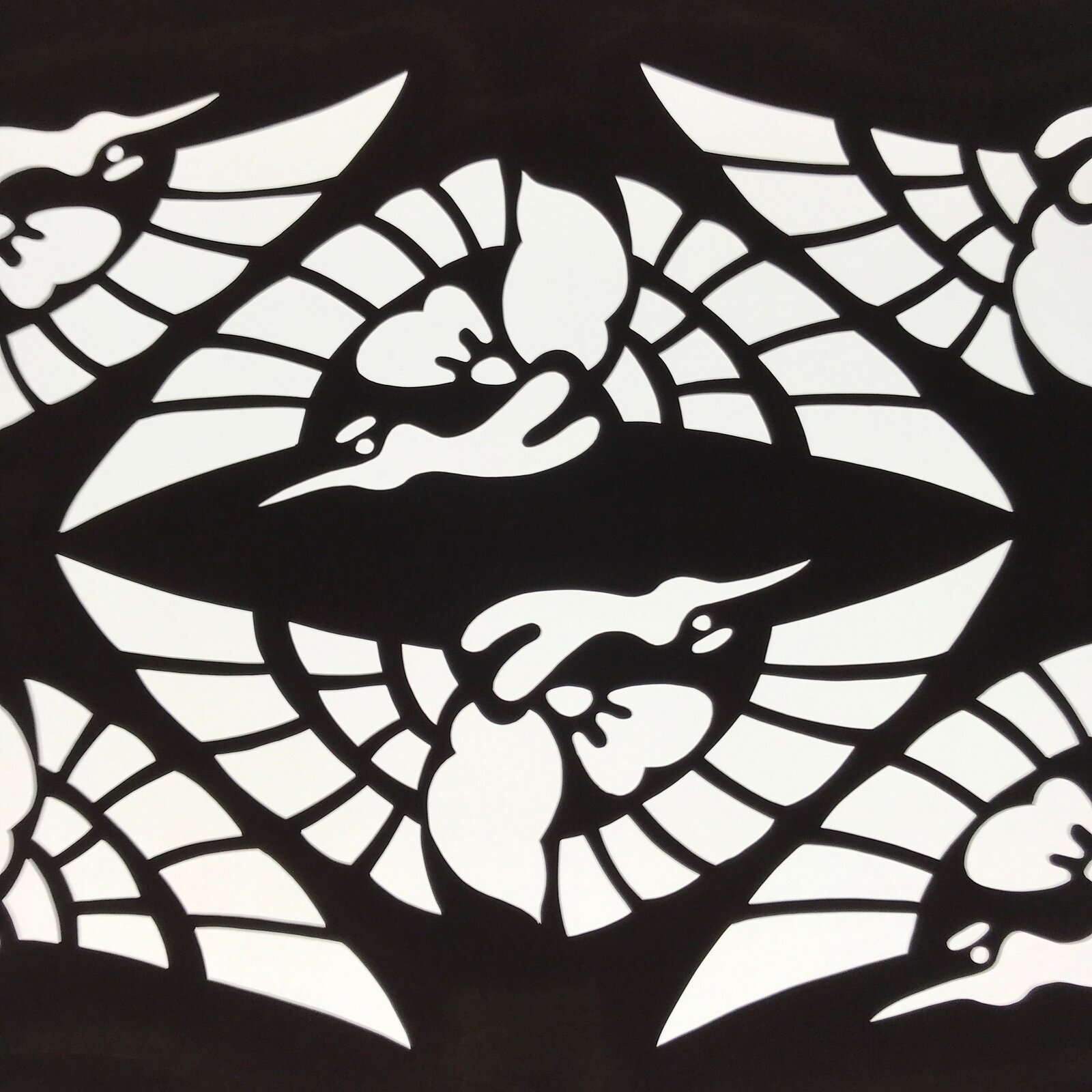 Using traditional mulberry paper, this katagami stencil with no silk mesh backing features a design with large depictions of cranes (tsuru).