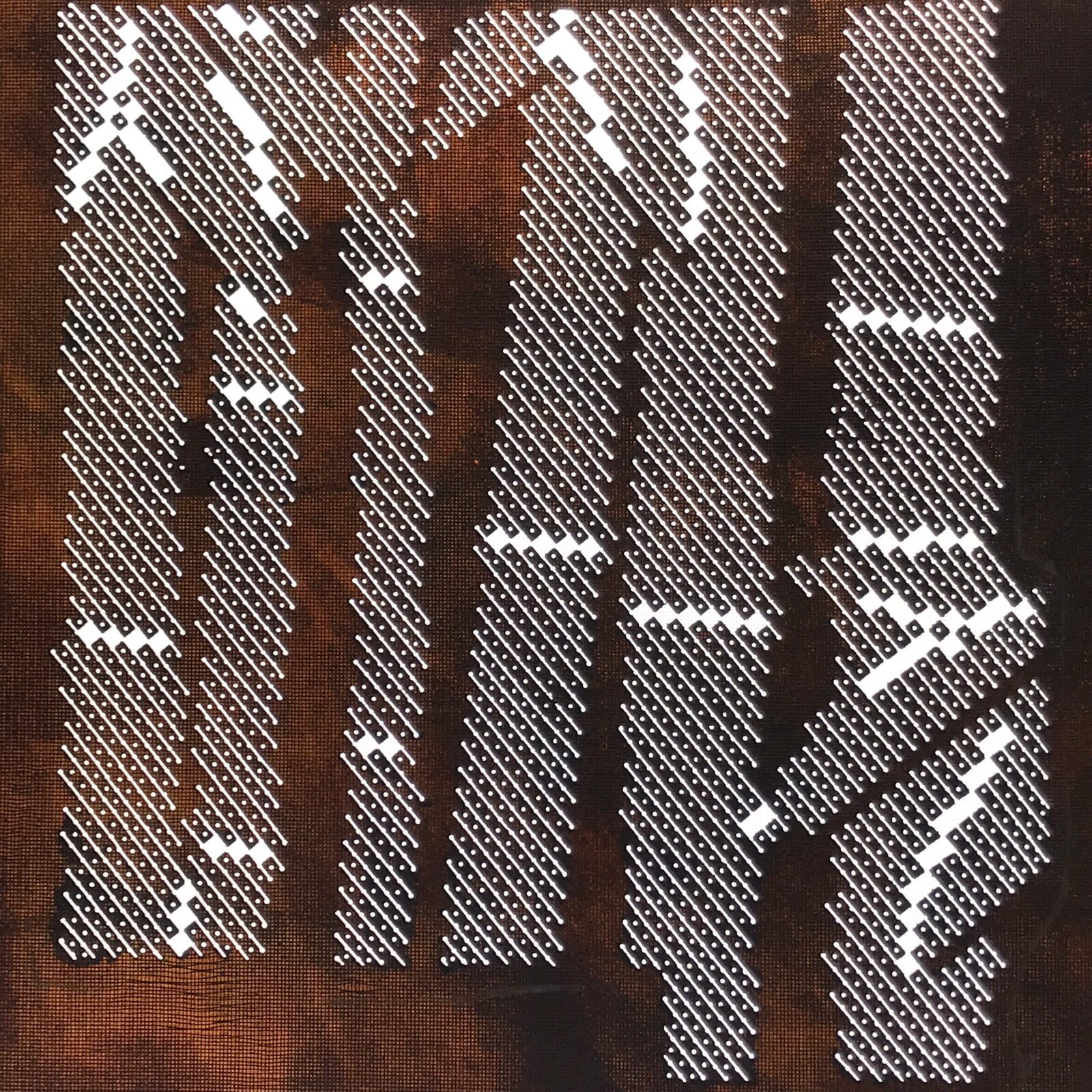 Using traditional mulberry washi paper, this katagami stencil with silk backing features a unique pixel-like dot pattern depicting stalks of bamboo with leaves. This is part of a larger set that is shochikubai (bamboo, pine, plum seasonal) themed. **The front side of this katagami is a light tan color