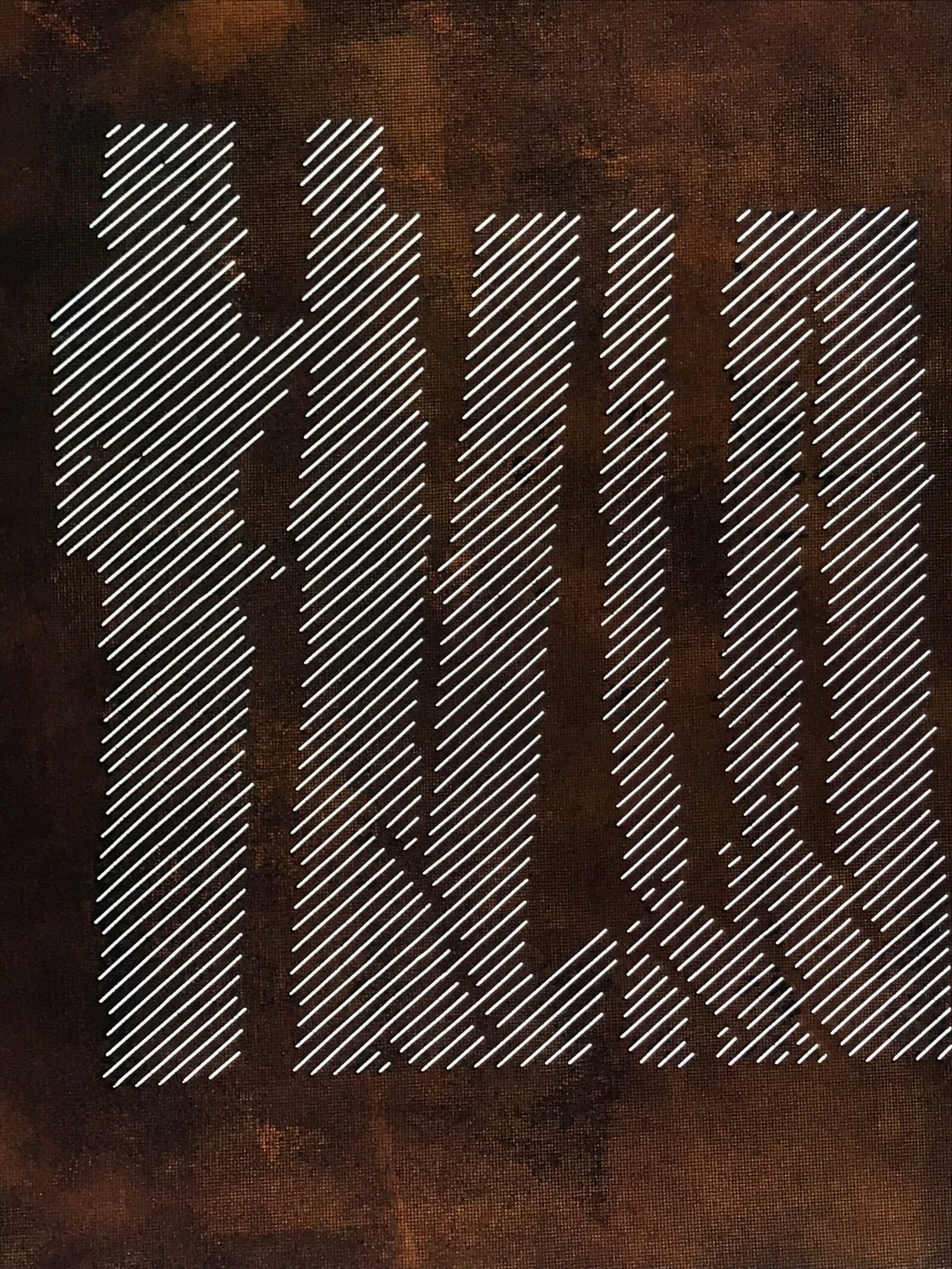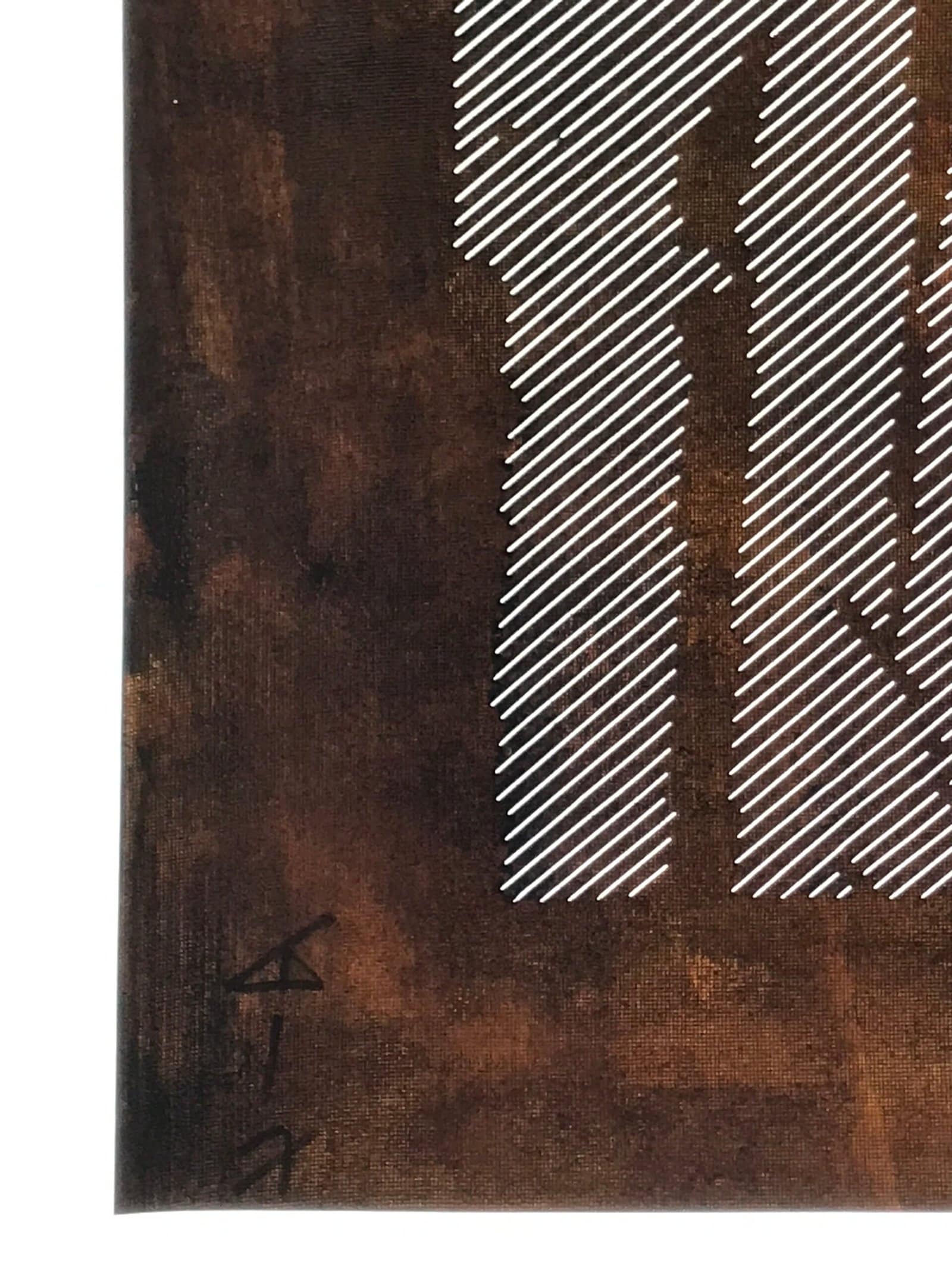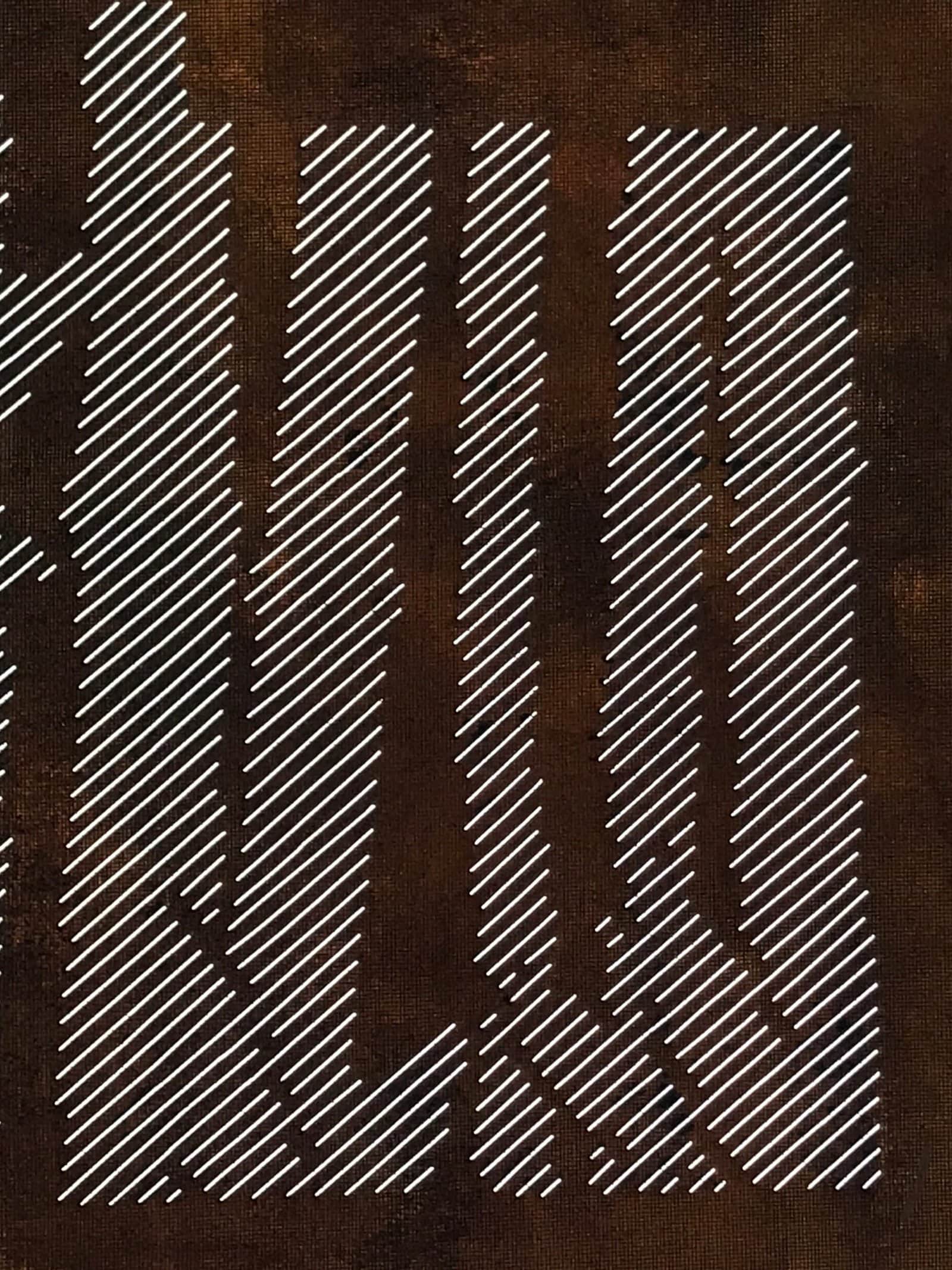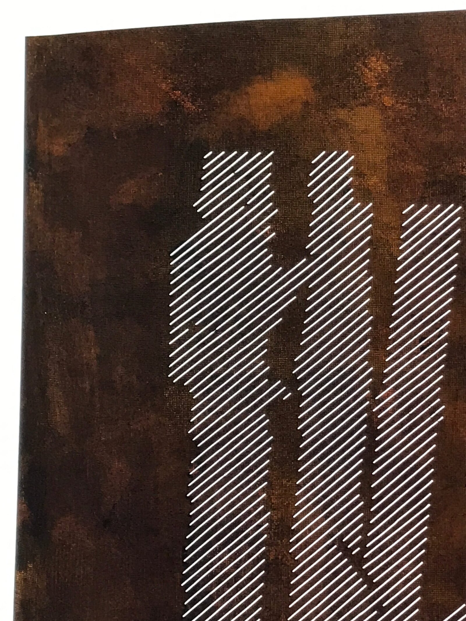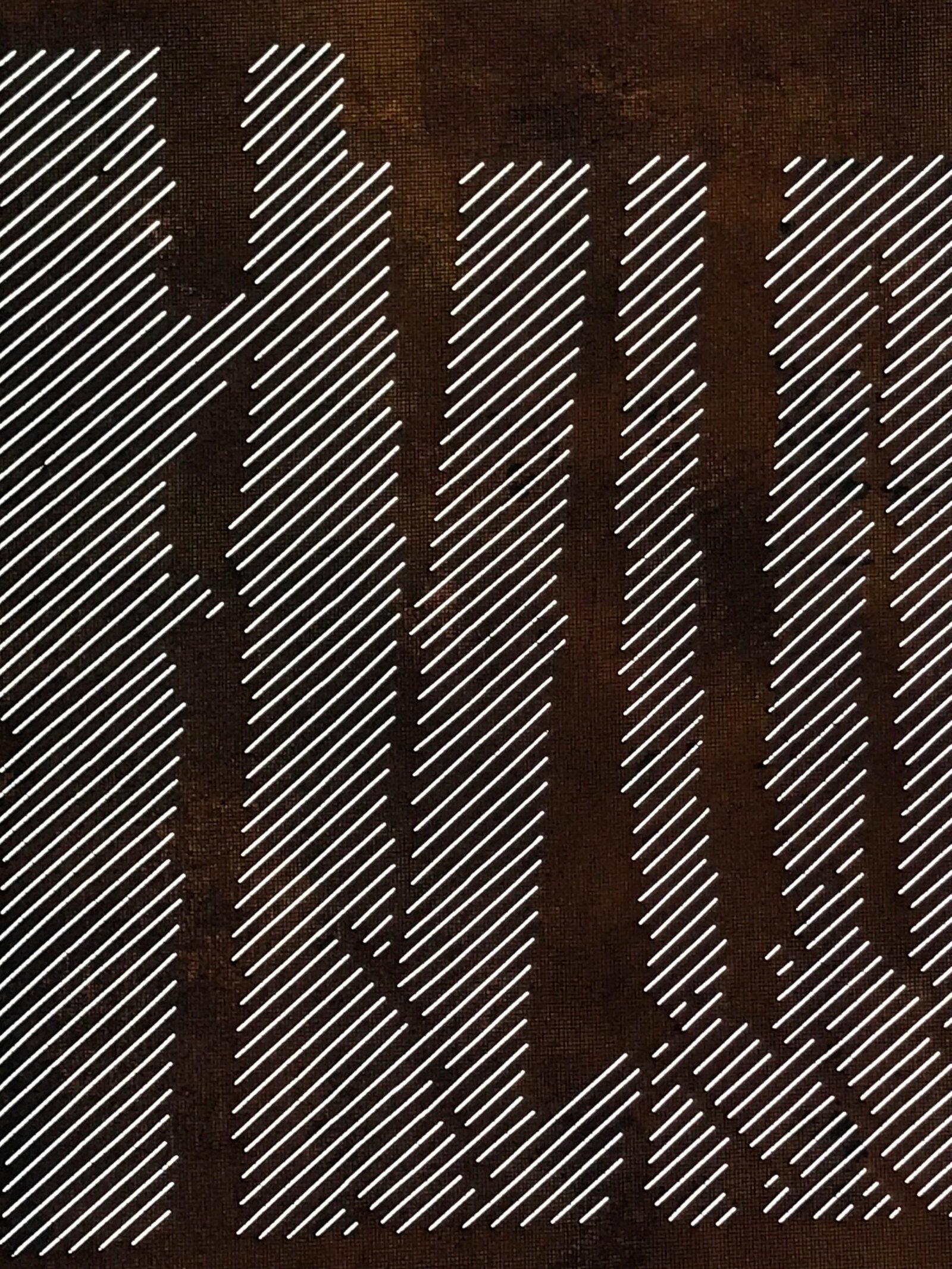 Using traditional mulberry washi paper, this katagami stencil with silk backing features a unique diagonal line pattern depicting stalks of bamboo with leaves. This is part of a larger set that is shochikubai (bamboo, pine, plum seasonal) themed. **The front side of this katagami is a light tan color