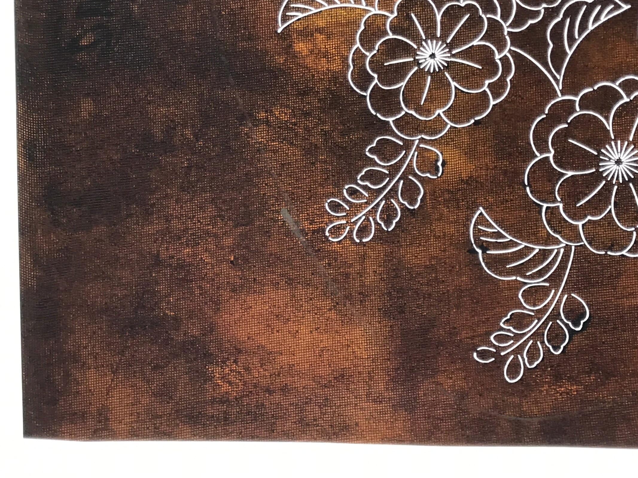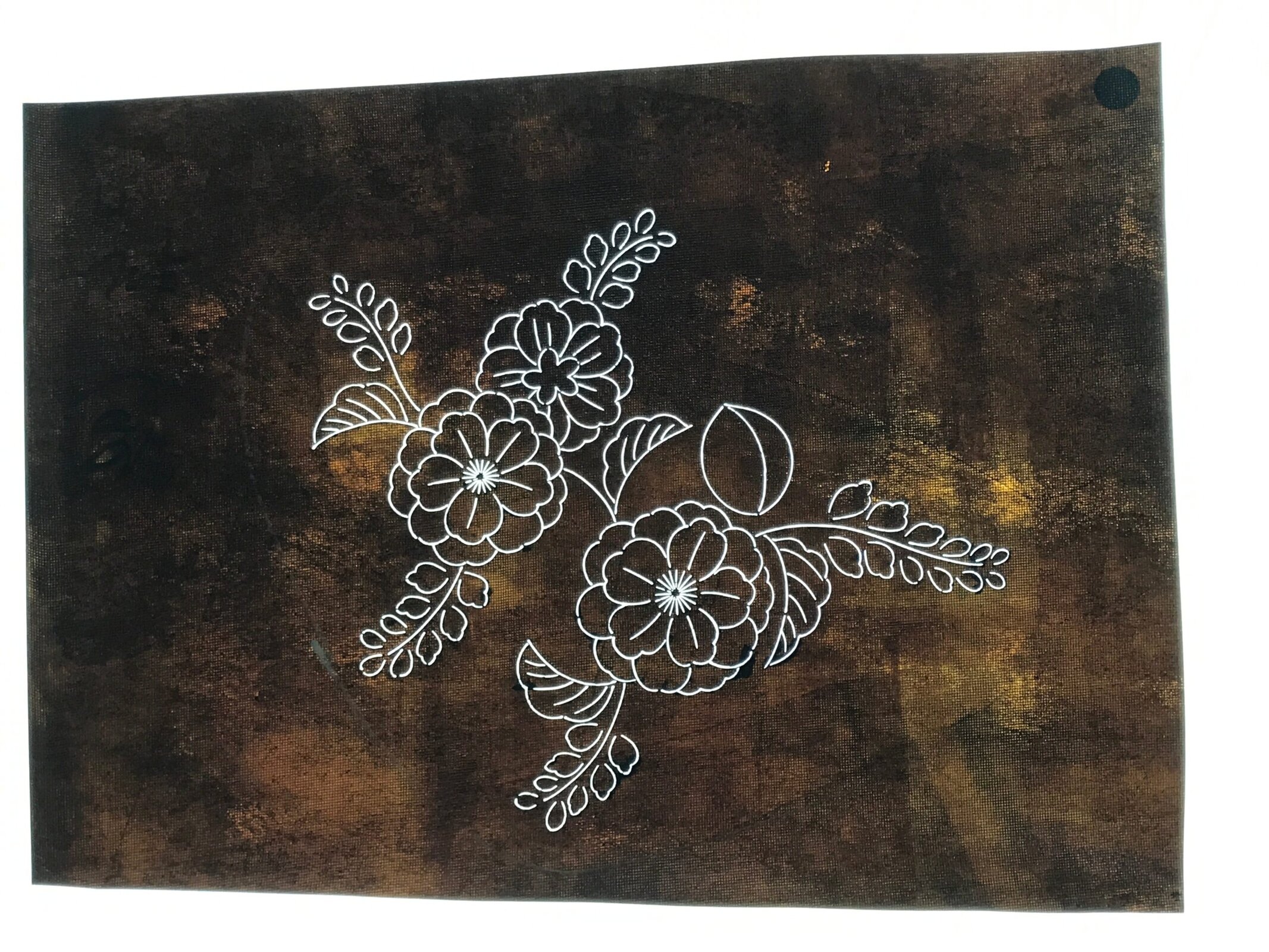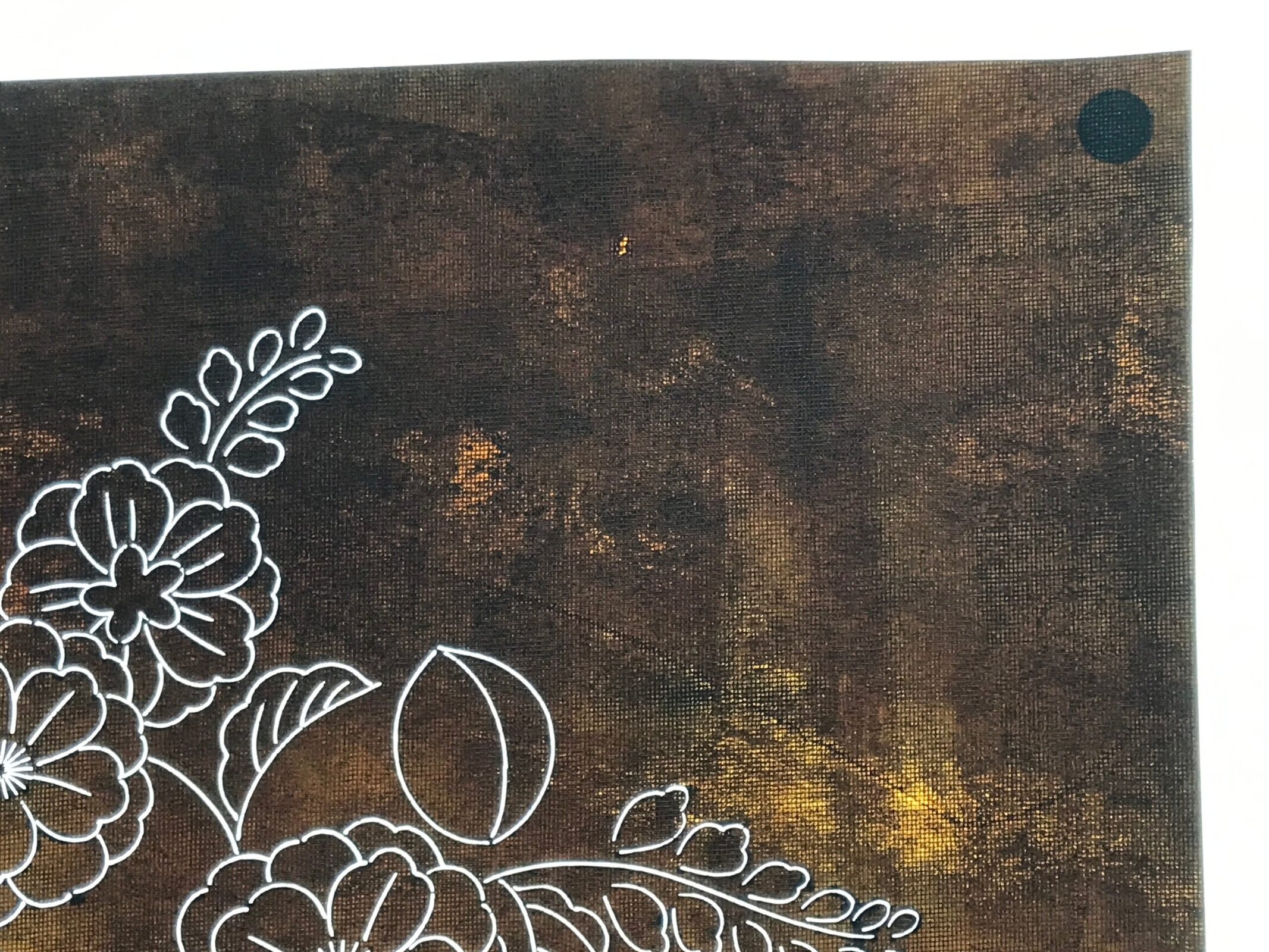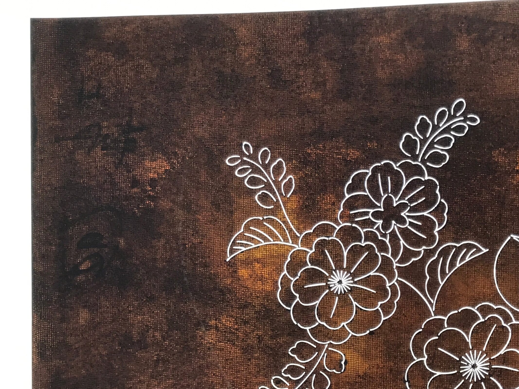 Using traditional mulberry washi paper, this katagami stencil with silk backing features a pair of full-bloom camellia flowers (tsubaki). **The front side of this katagami is a light tan color.