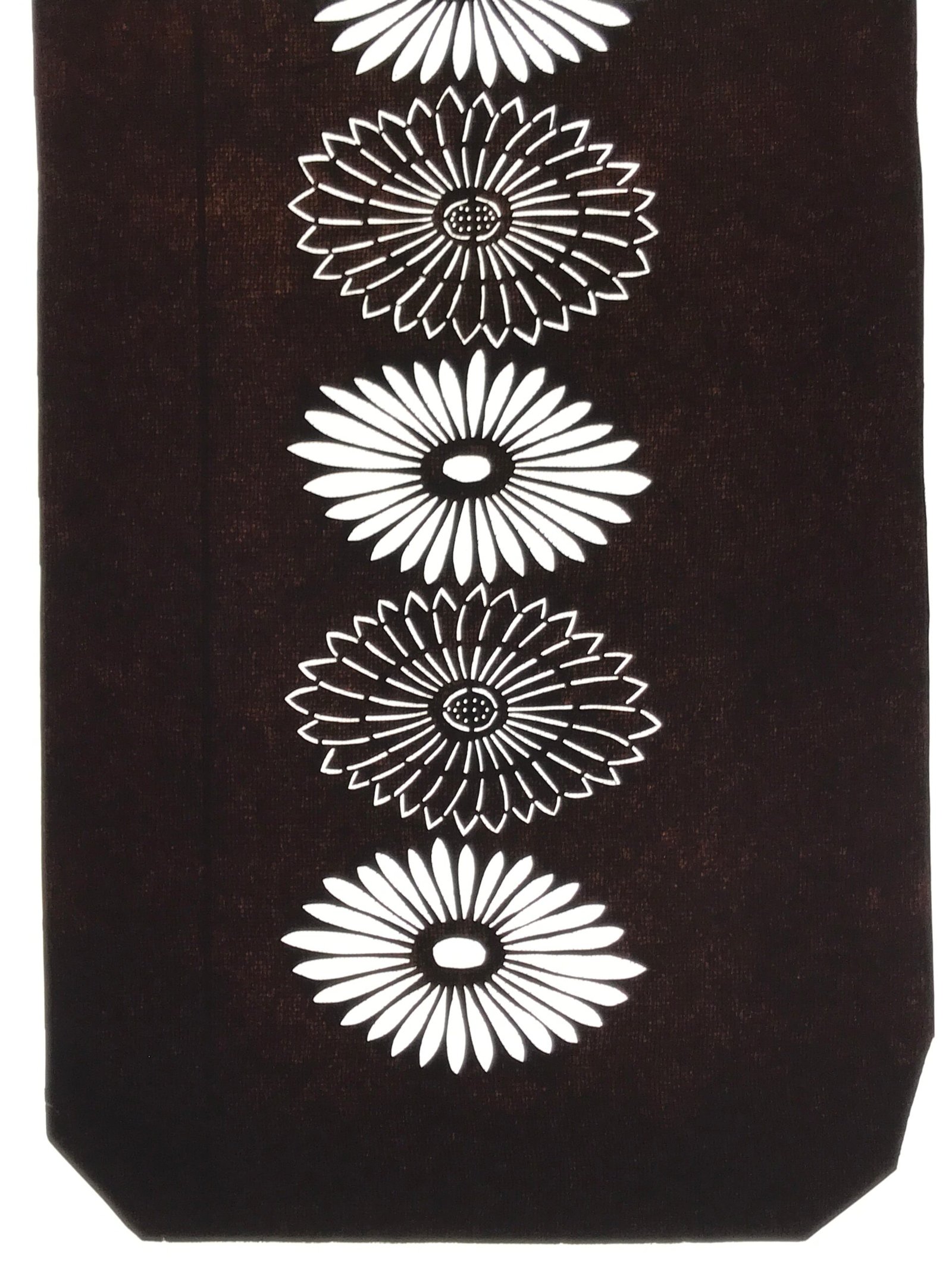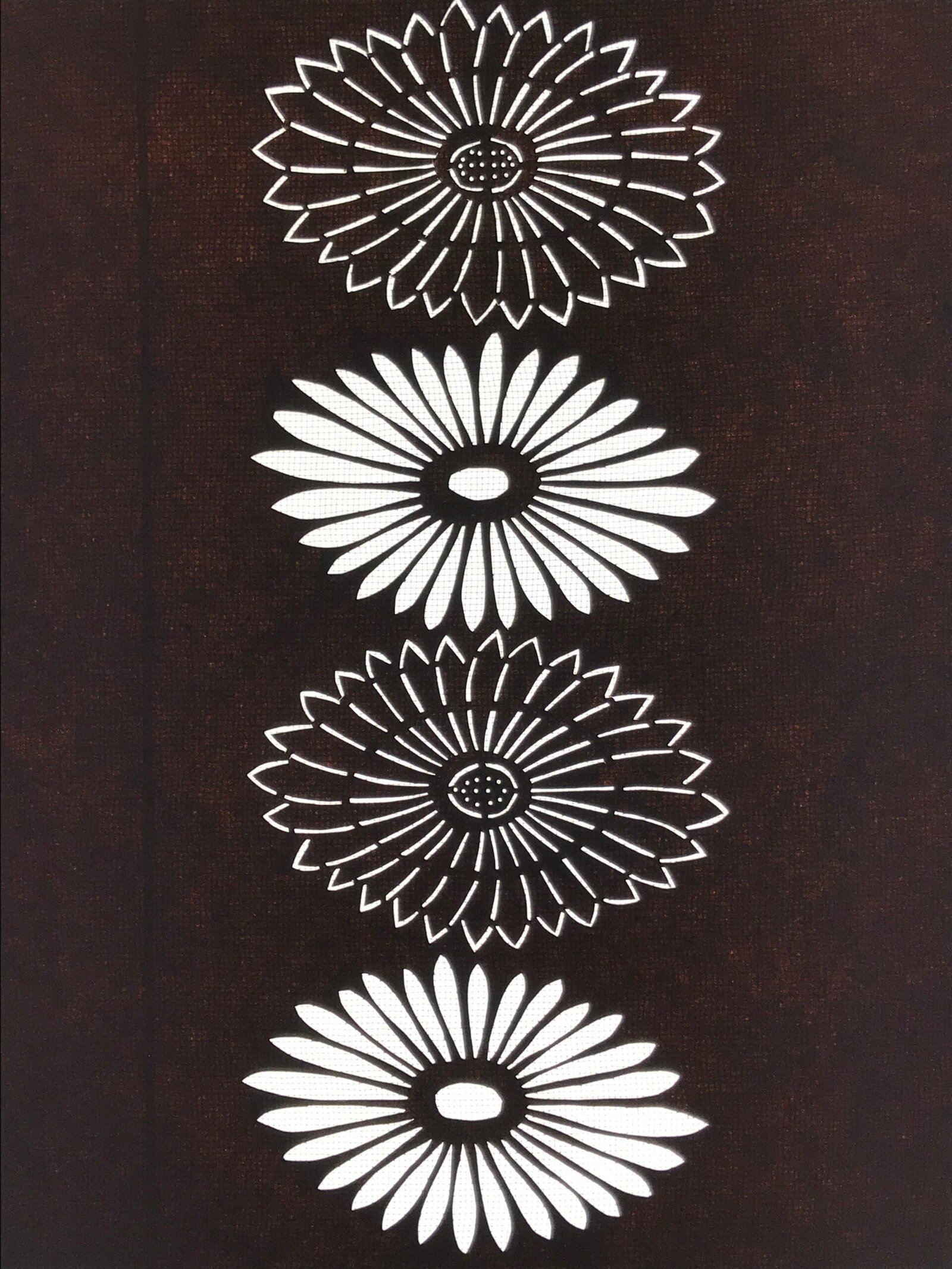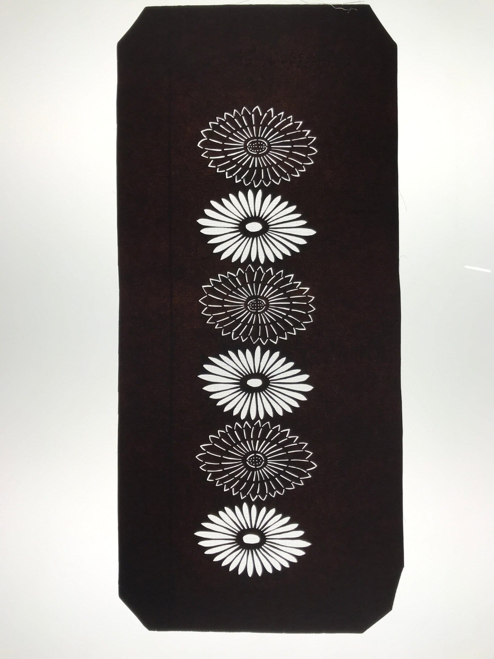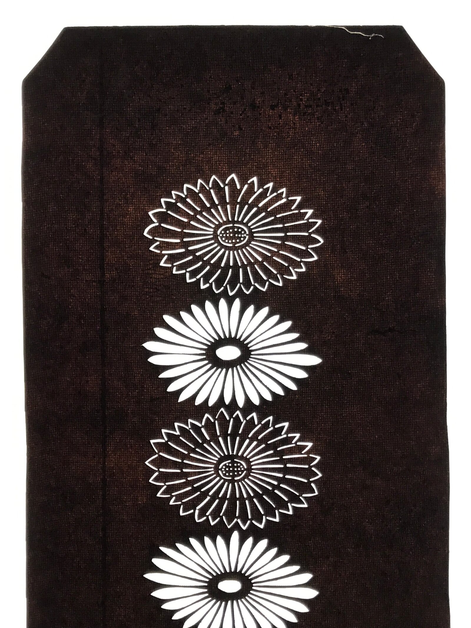 Using traditional mulberry washi paper, this katagami stencil with silk backing features a line of six chrysanthemums (kiku).