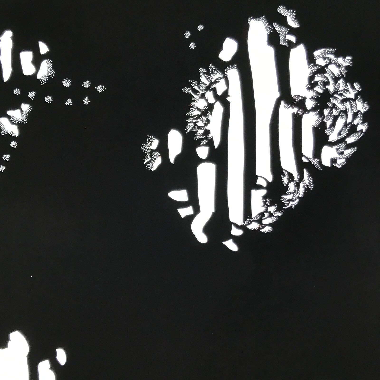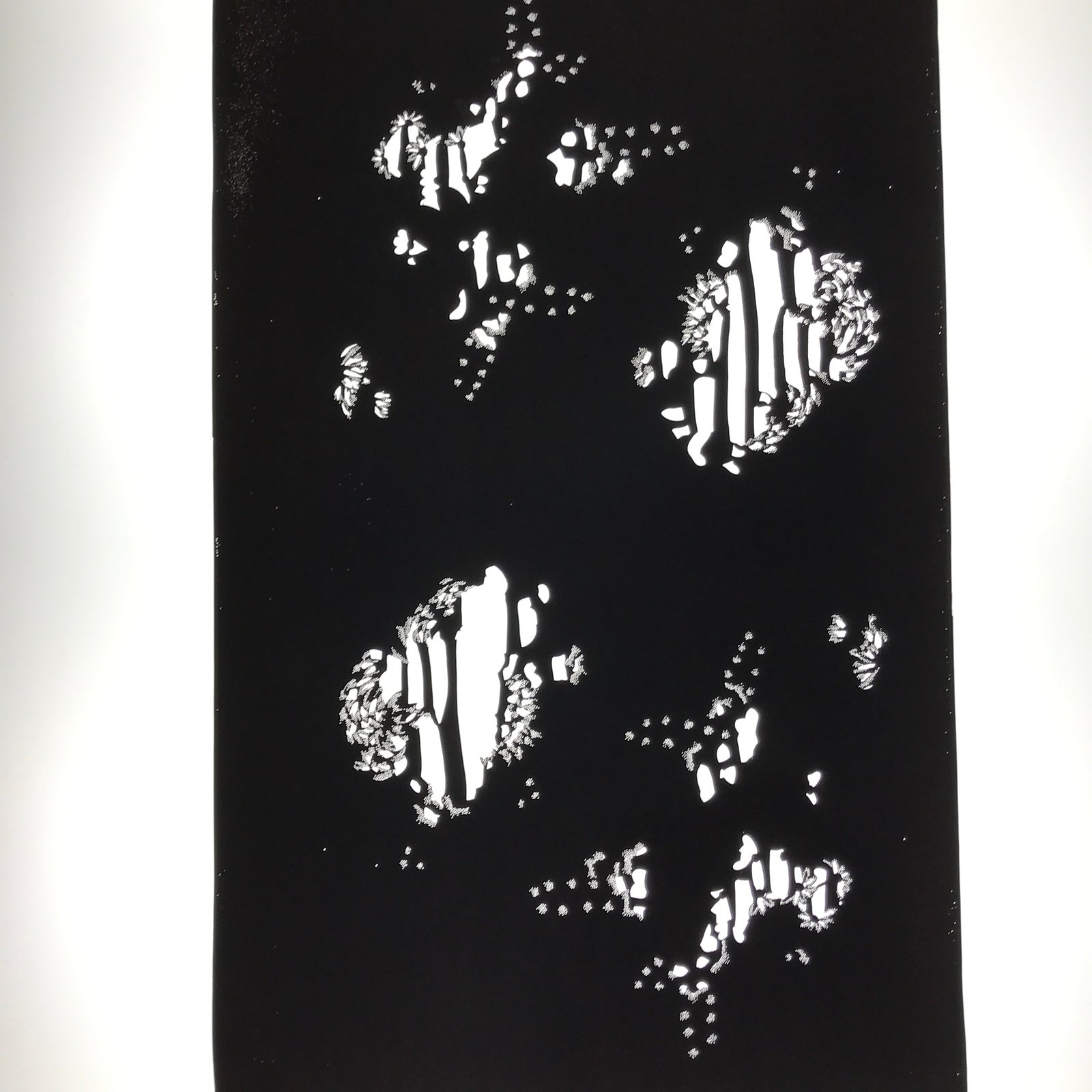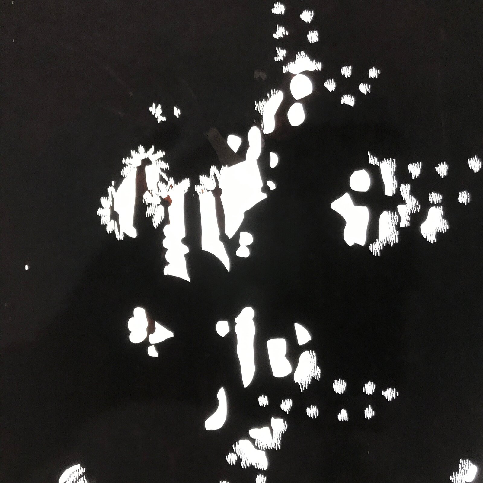 Using traditional mulberry paper, this katagami stencil with no silk mesh backing features a background for a lush floral design and is part of a much larger set of katagami. Unfortunately, these sets often get separated or mixed up over time. Some of the petals of the flowers are shown.