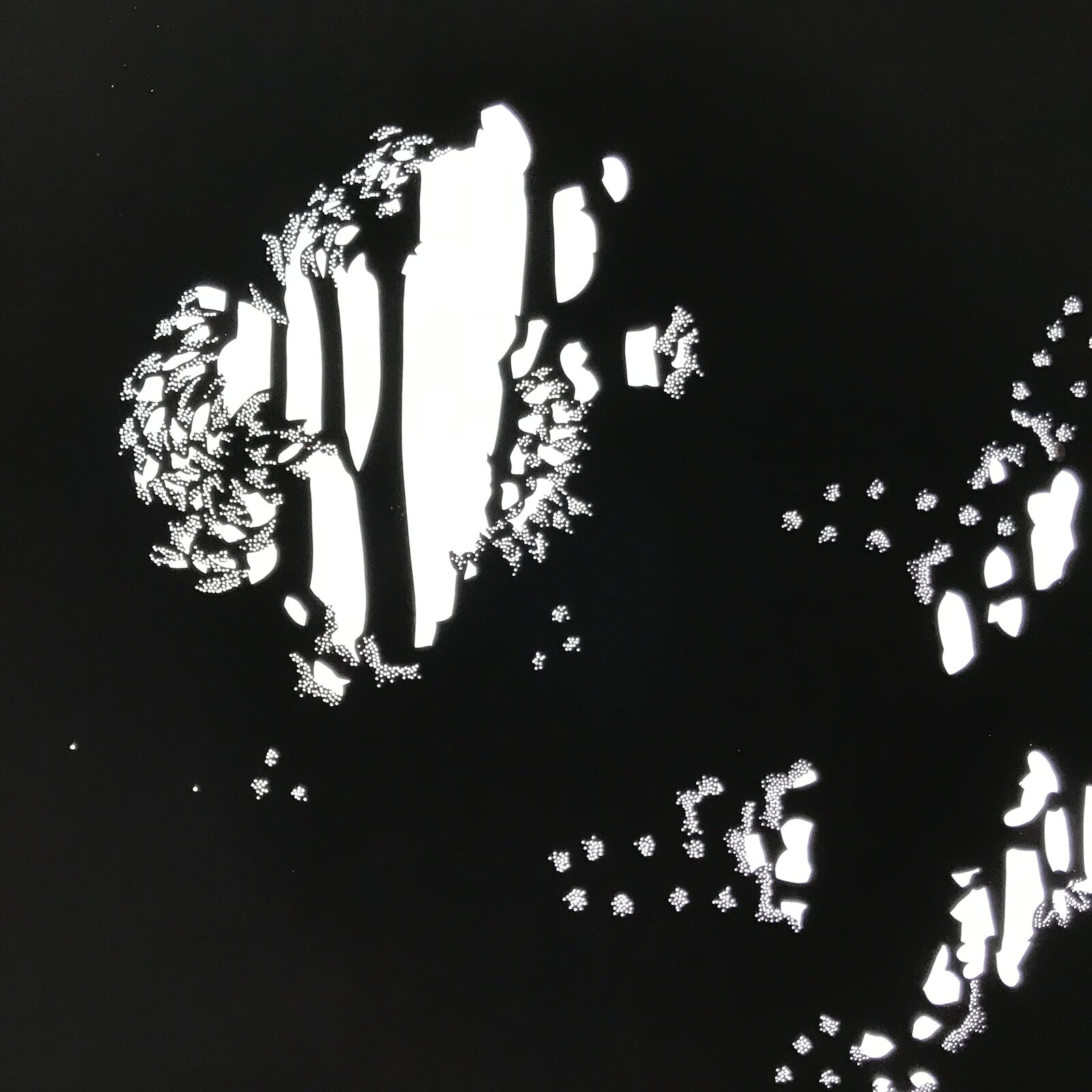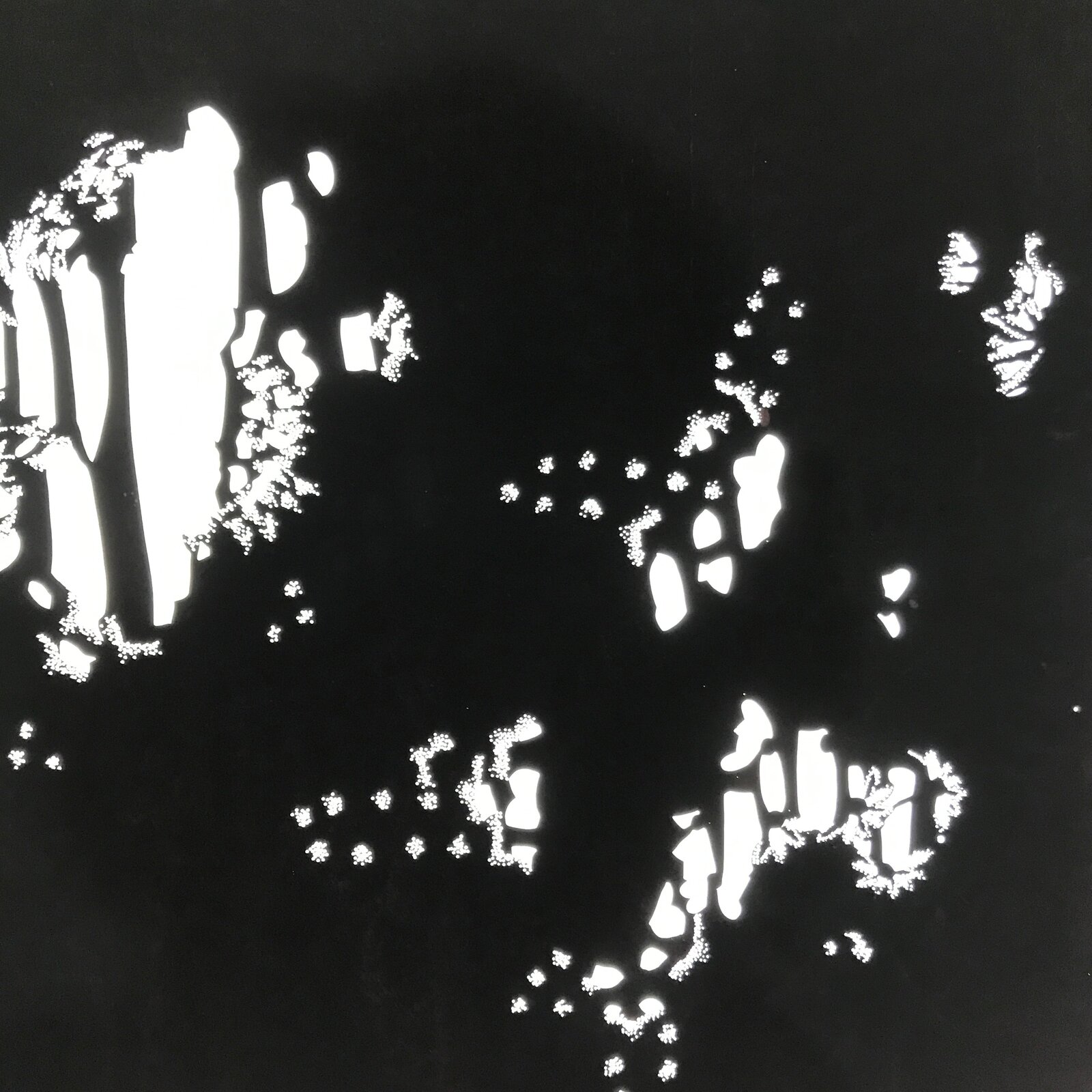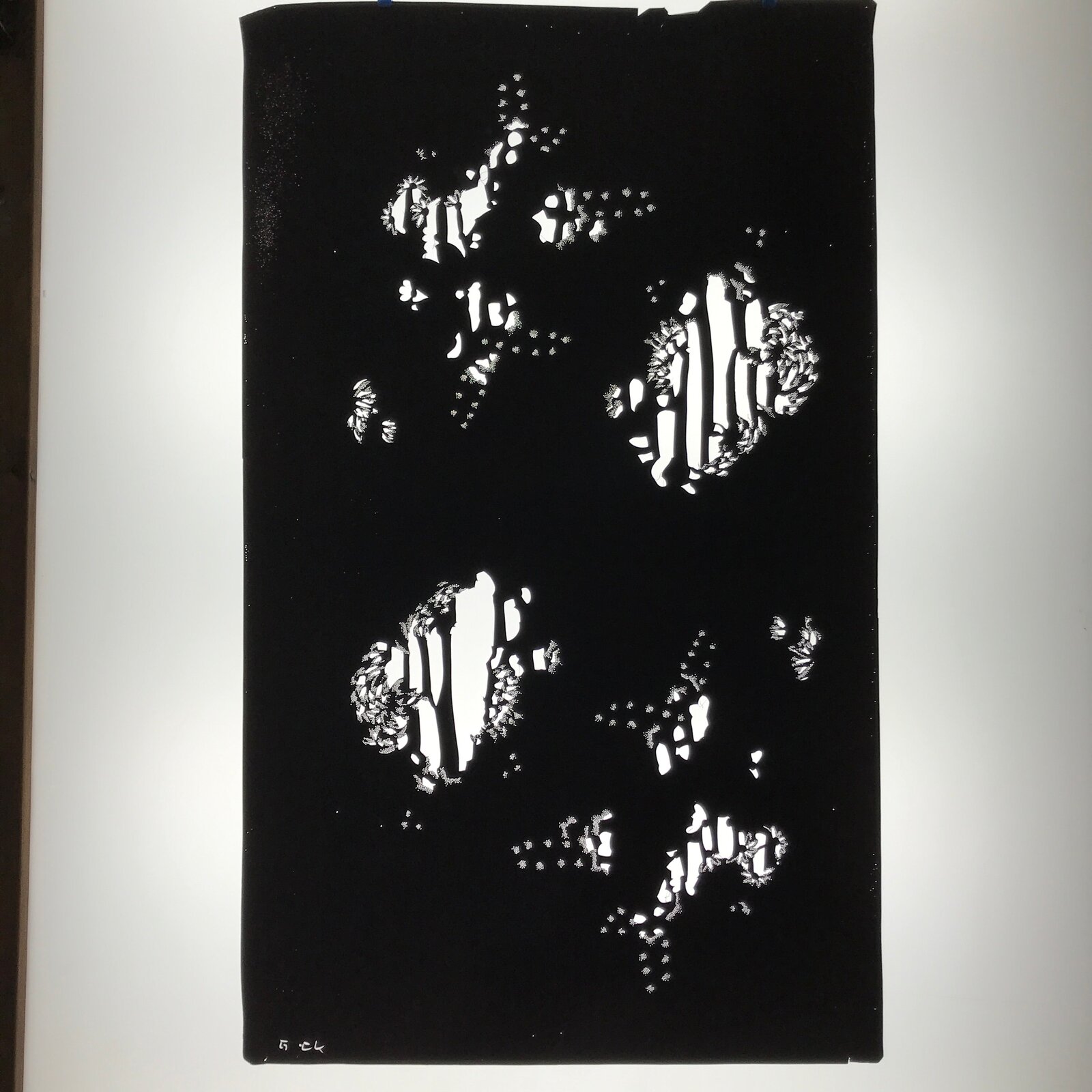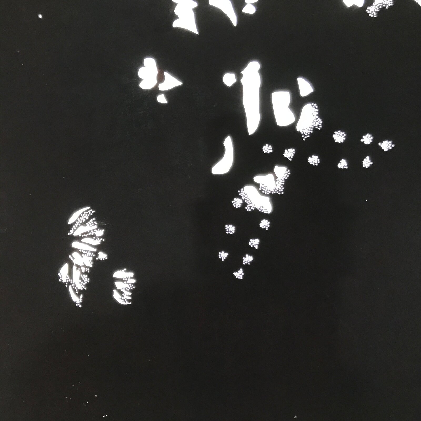 Using traditional mulberry paper, this katagami stencil with no silk mesh backing features a background for a lush floral design and is part of a much larger set of katagami. Unfortunately, these sets often get separated or mixed up over time. Some of the petals of the flowers are shown.