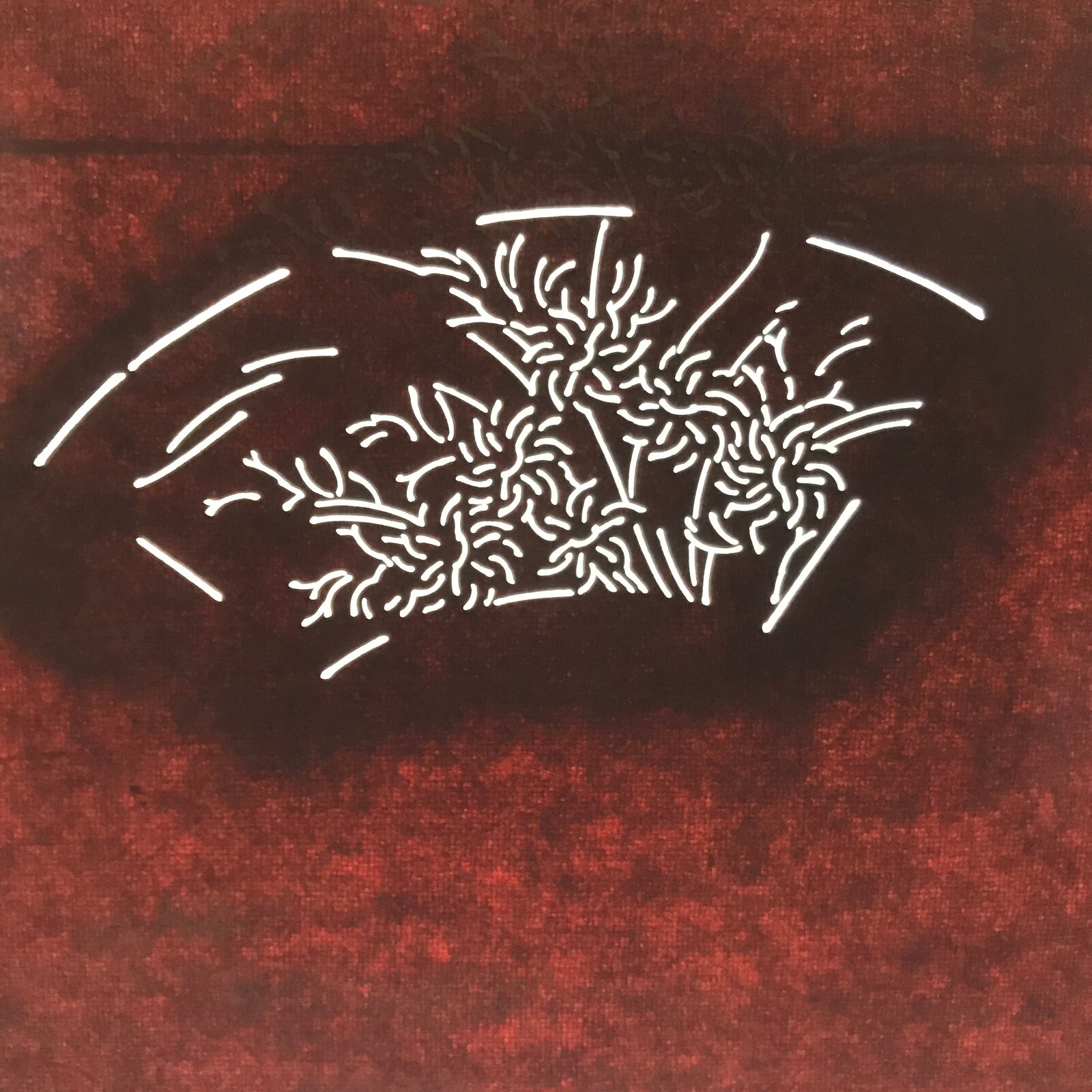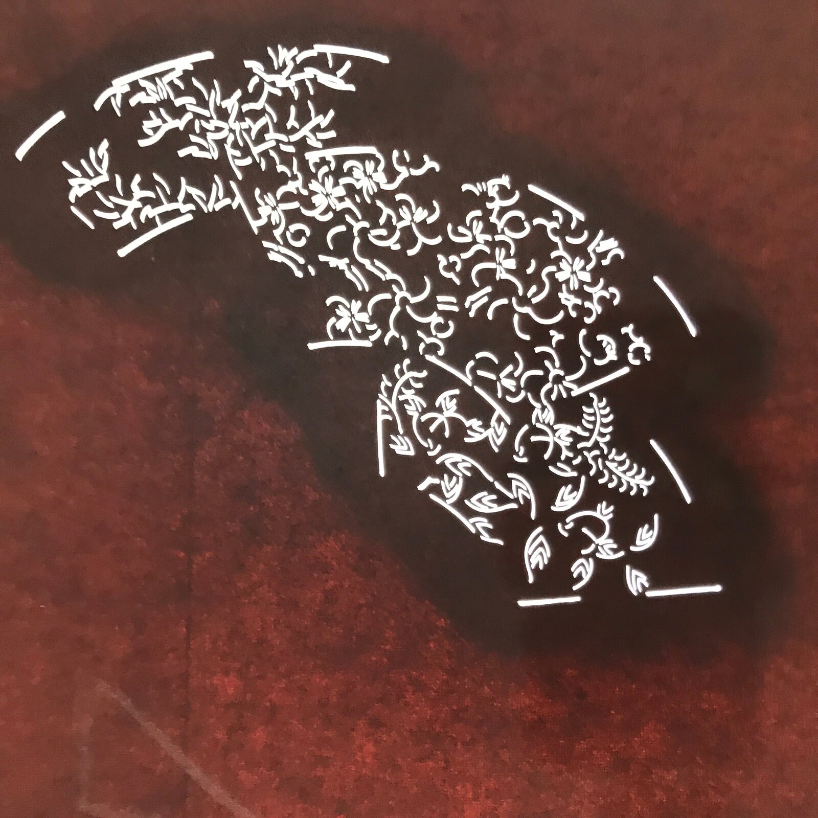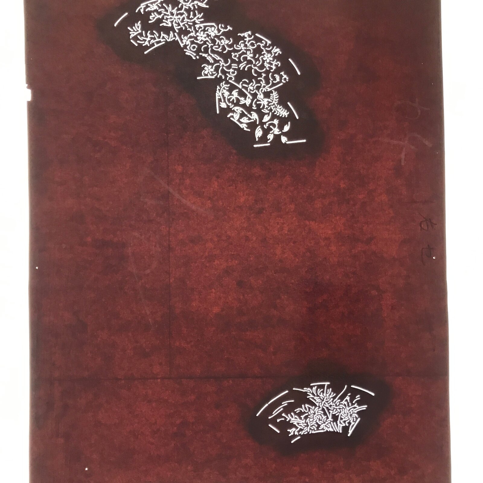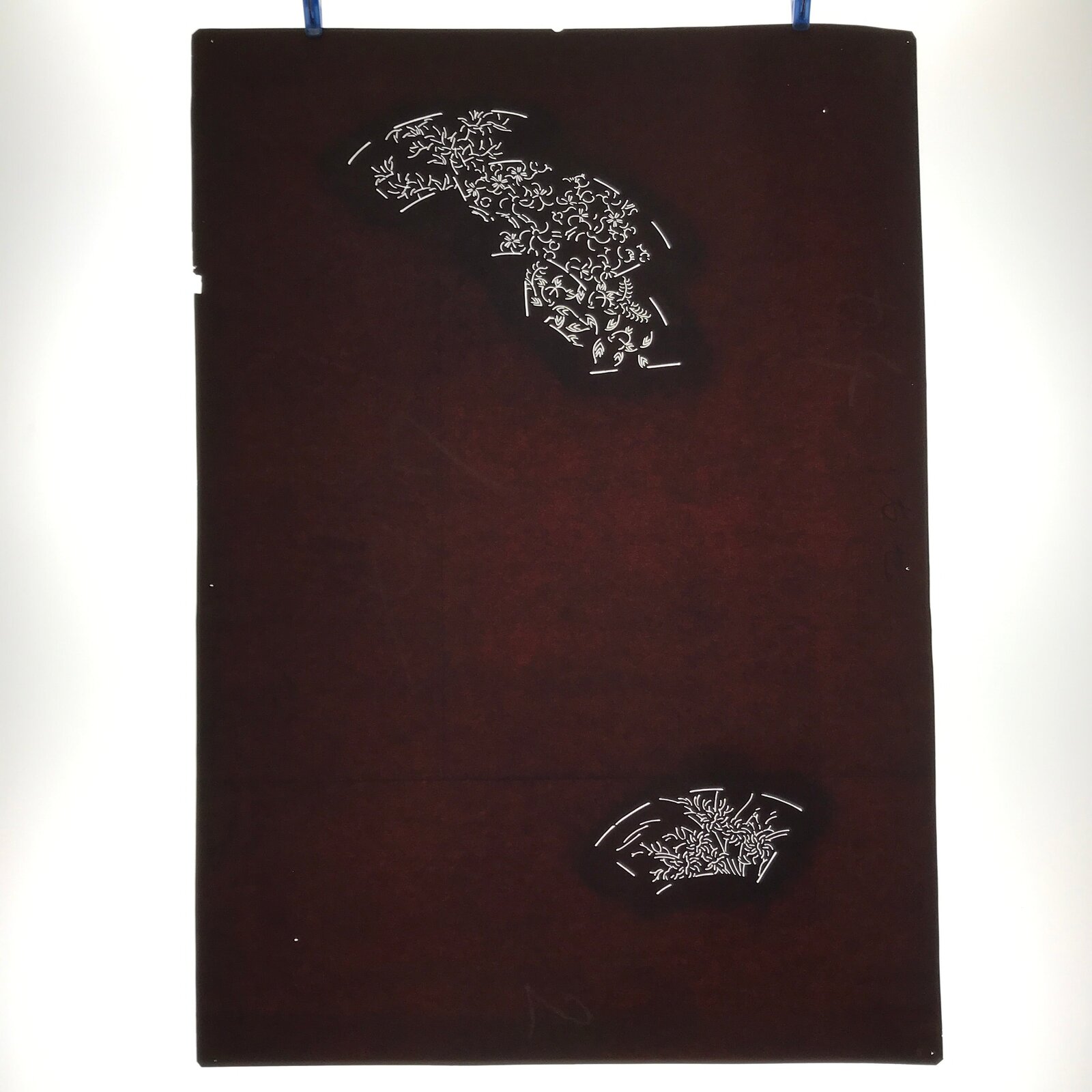 This antique Katagami was designed during the mid or late Edo period (1860) to early Meiji (1900) in Central Japan. It is made of two or more layers of handmade mulberry paper laminated together and waterproofed with persimmon tannin. Katagami printing uses a technique called resist dye where a paste is applied to the fabric with the katagami before dipping in ink. The open space on the katagami will be a negative space in the printed design.