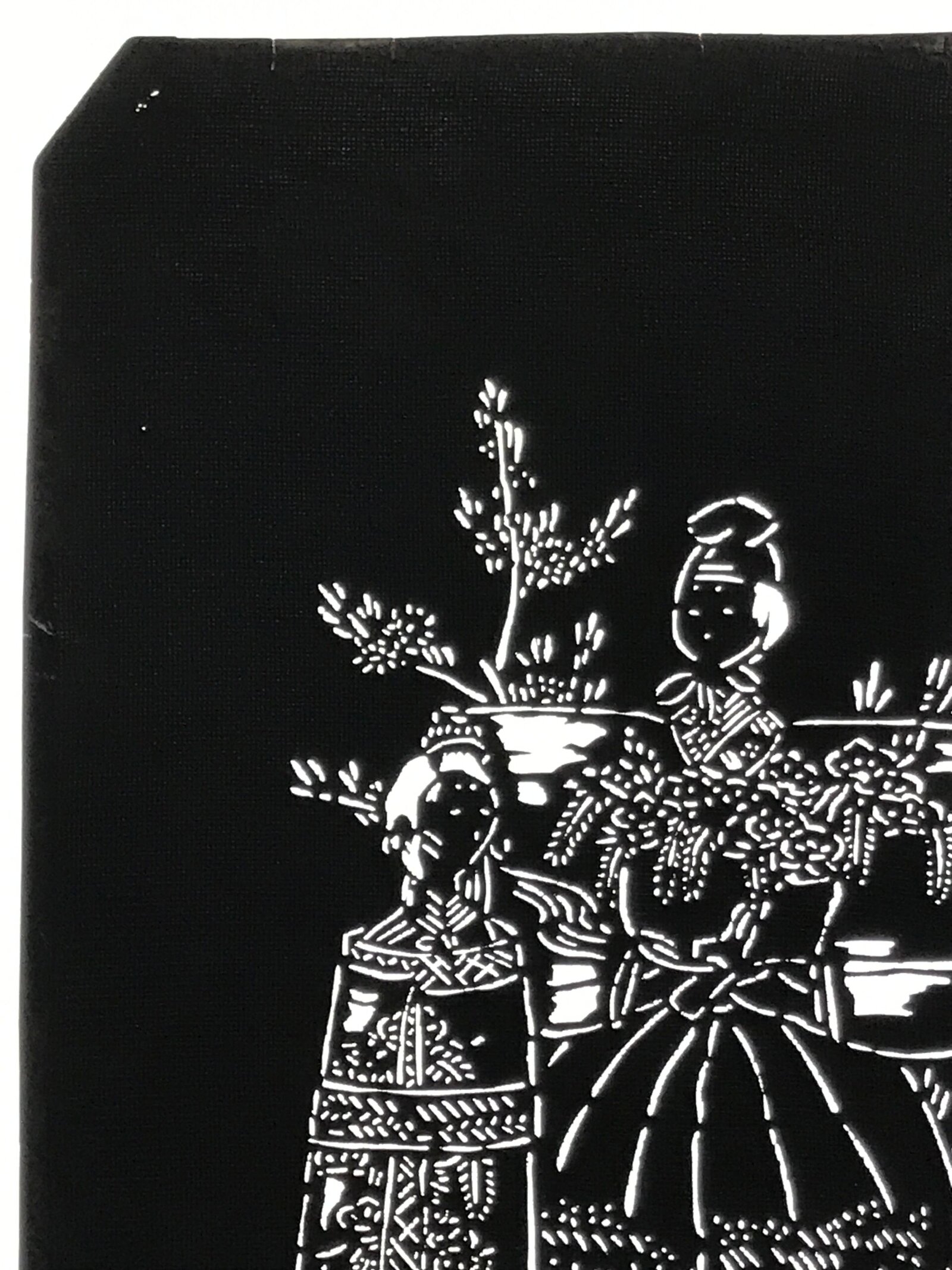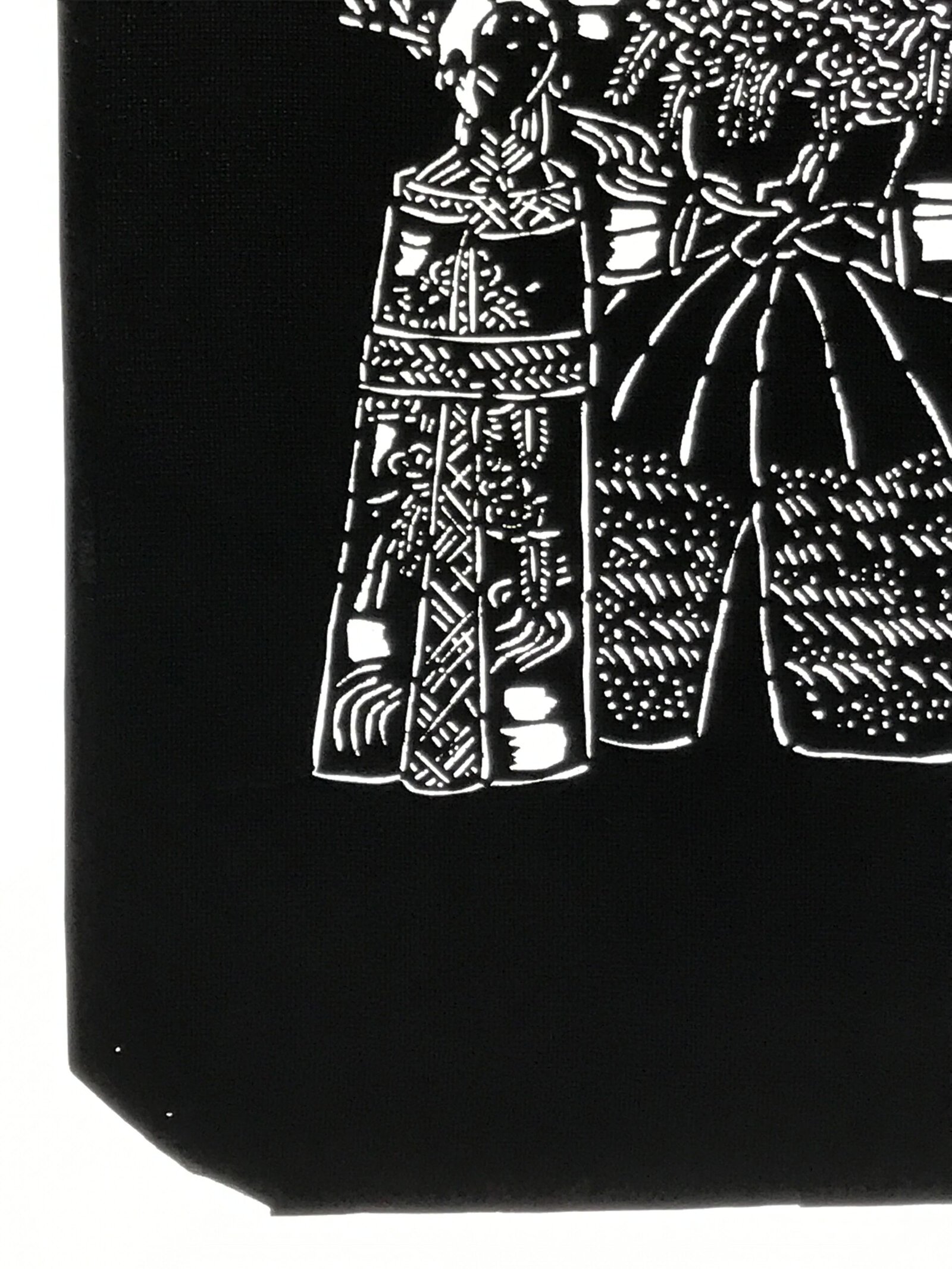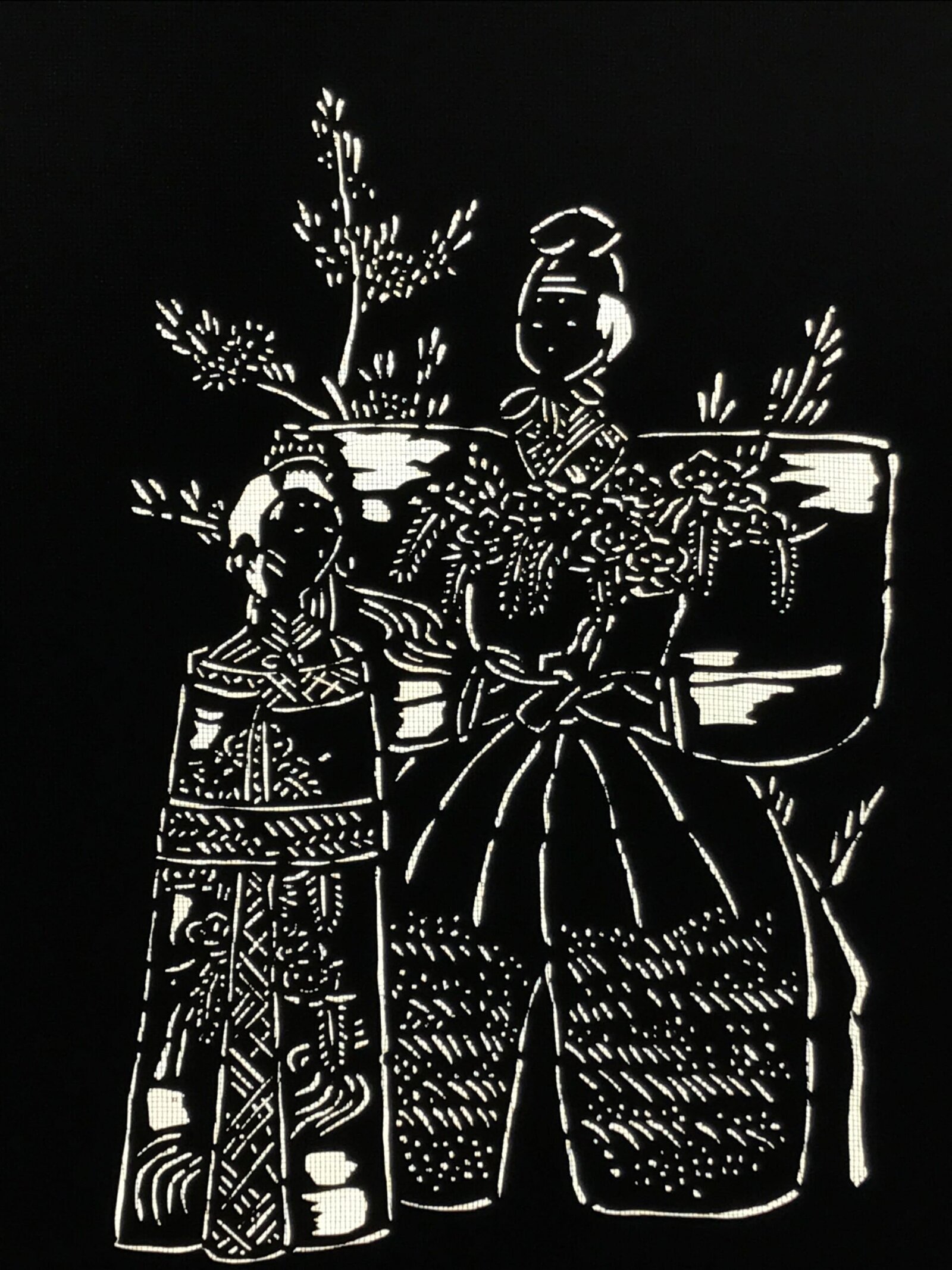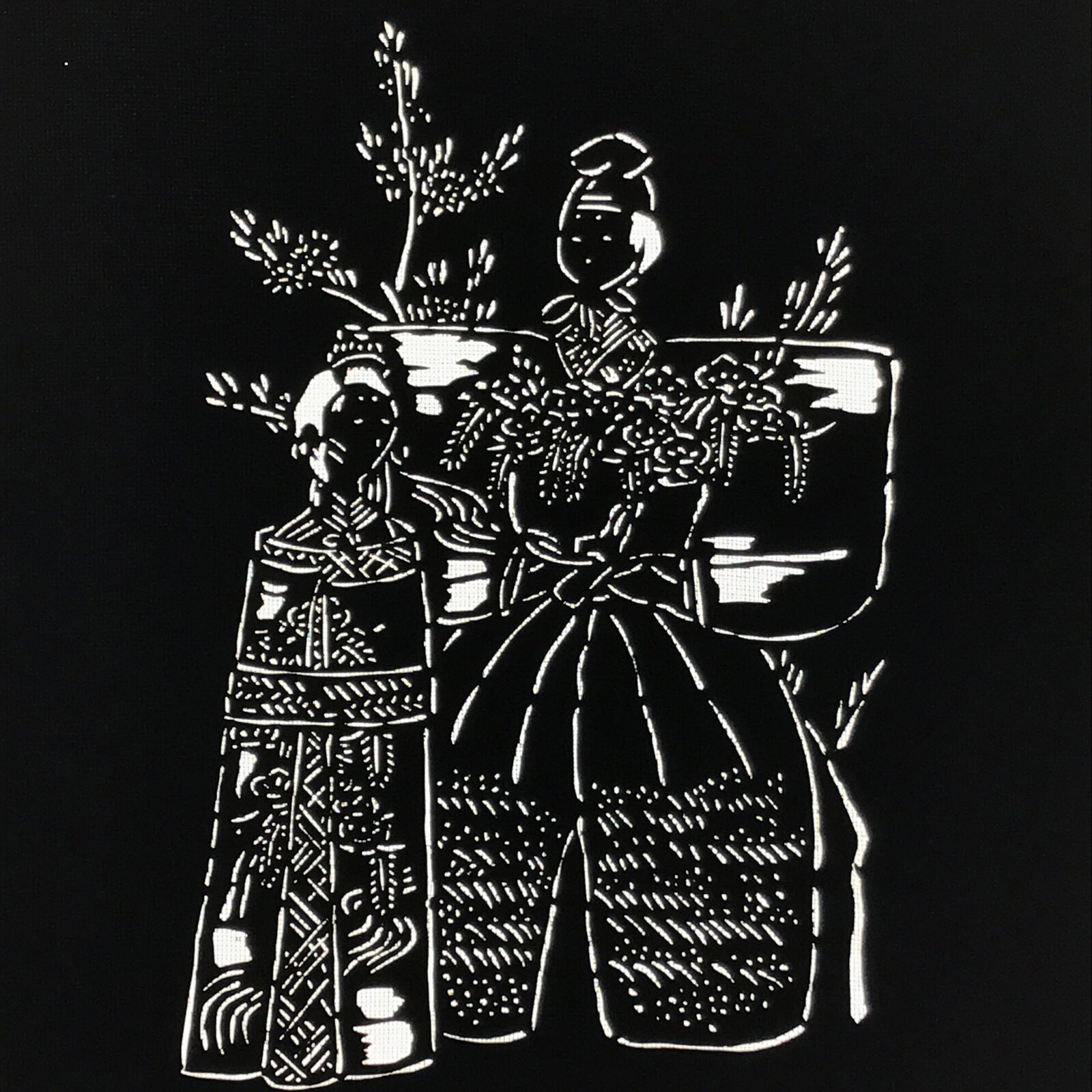 Using traditional mulberry washi paper, this katagami stencil with silk backing features tachibina, a popular motif during the Hina Girls’ Day Festival. It depicts a prince/princess in a doll-like way.