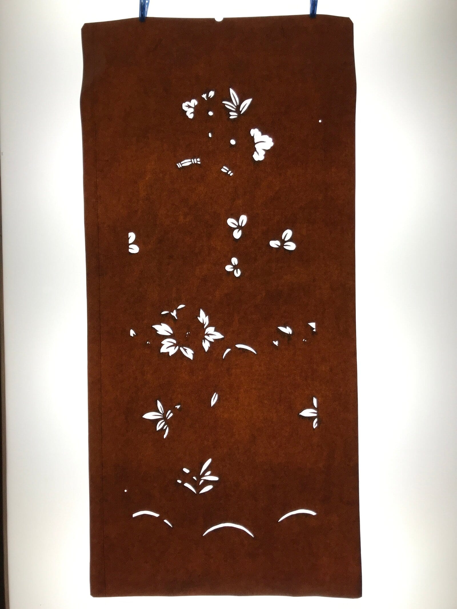 This antique Katagami was designed during the mid or late Edo period (1860) to early Meiji (1900) in Central Japan. It is made of two or more layers of handmade mulberry paper laminated together and waterproofed with persimmon tannin. Katagami printing uses a technique called resist dye where a paste is applied to the fabric with the katagami before dipping in ink. The open space on the katagami will be a negative space in the printed design.