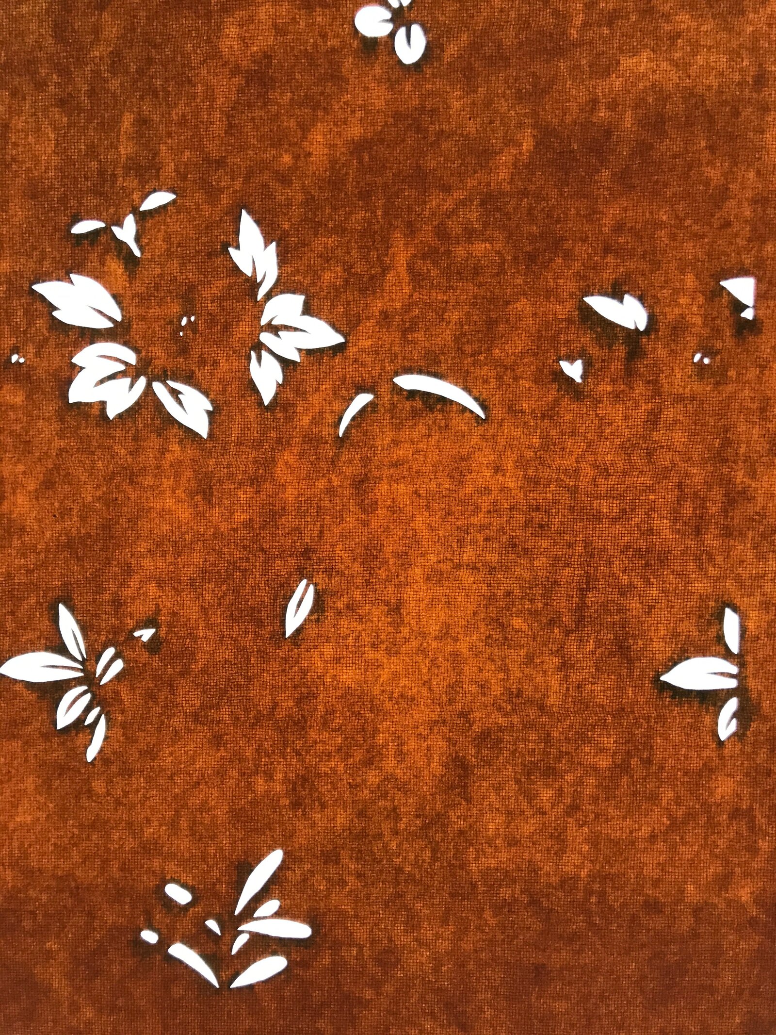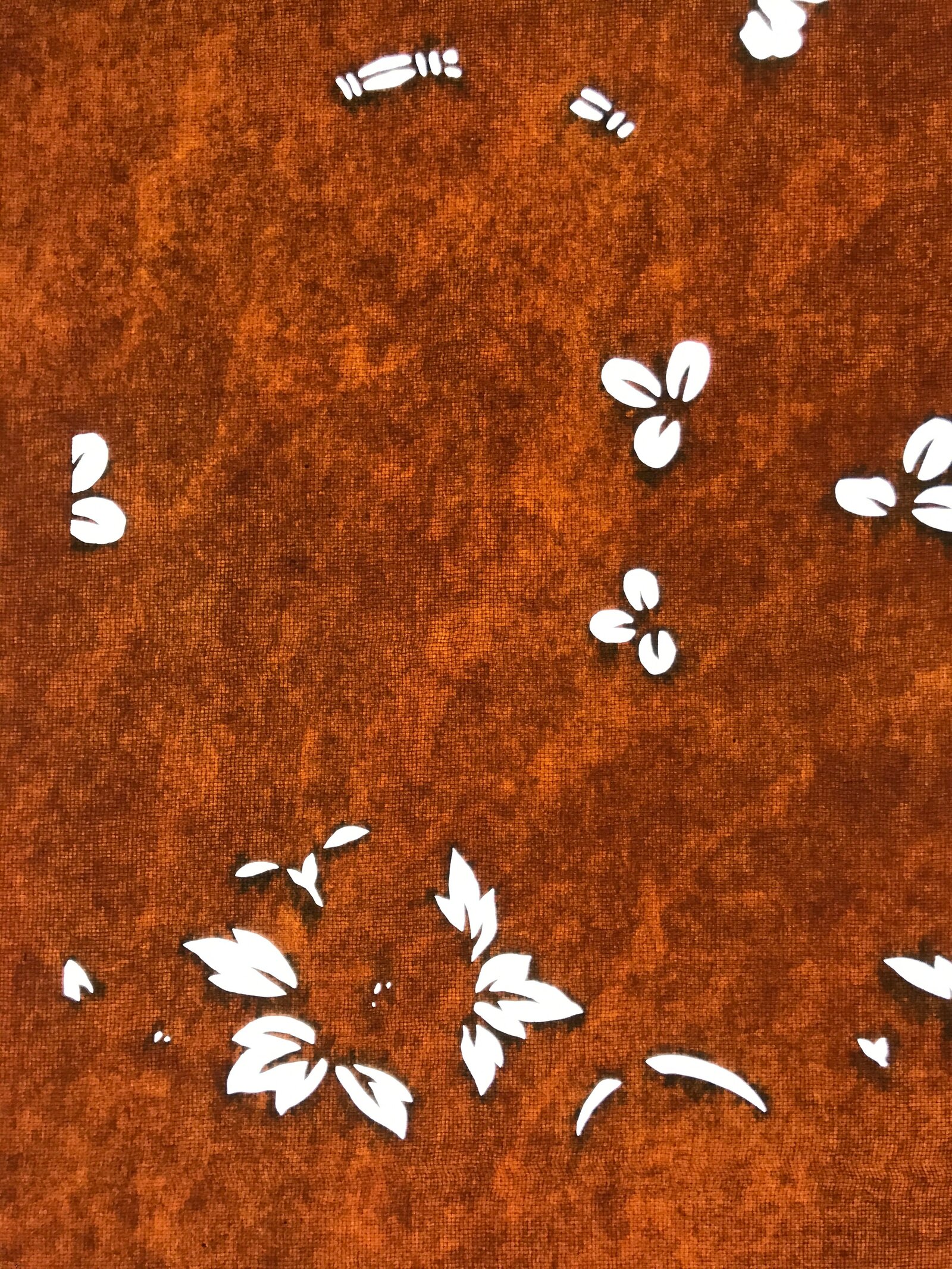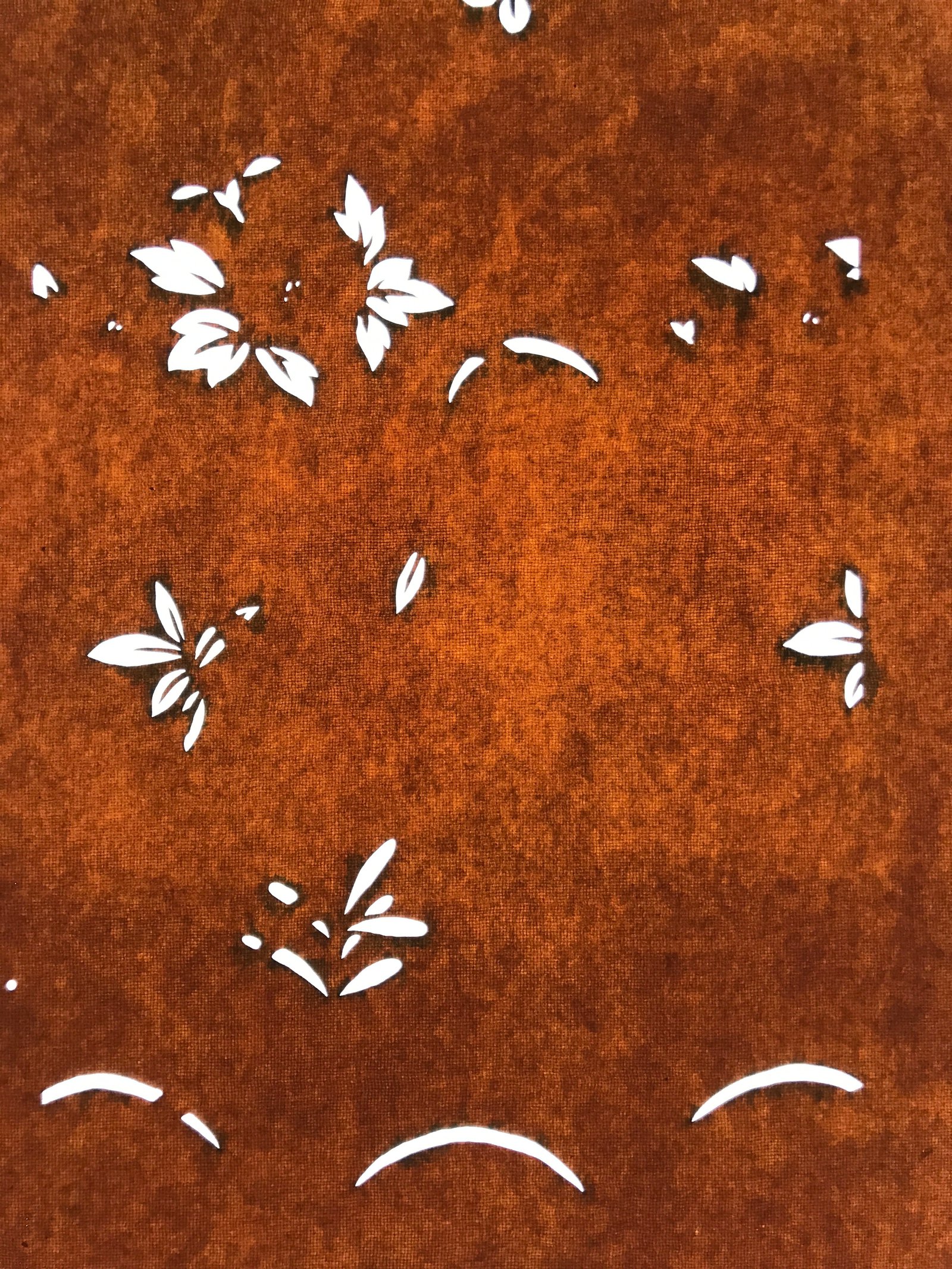 Using traditional mulberry paper, this katagami stencil with silk mesh backing features a simple, scattered design of plants (mostly leaves).