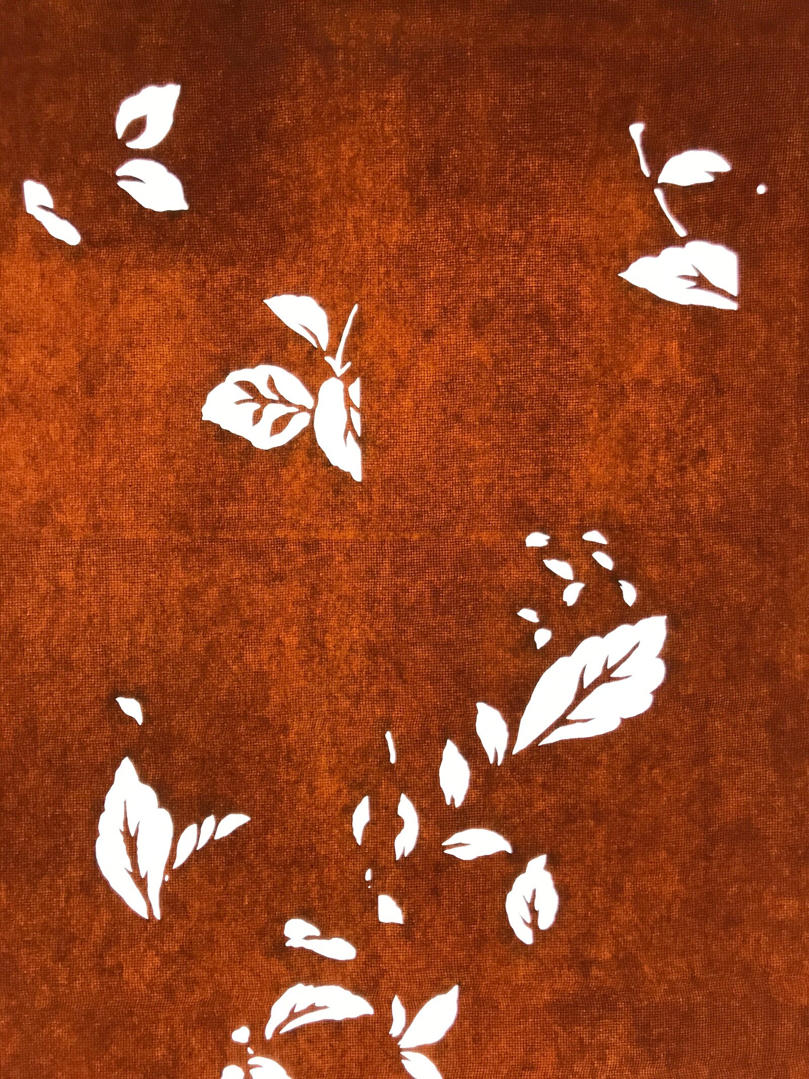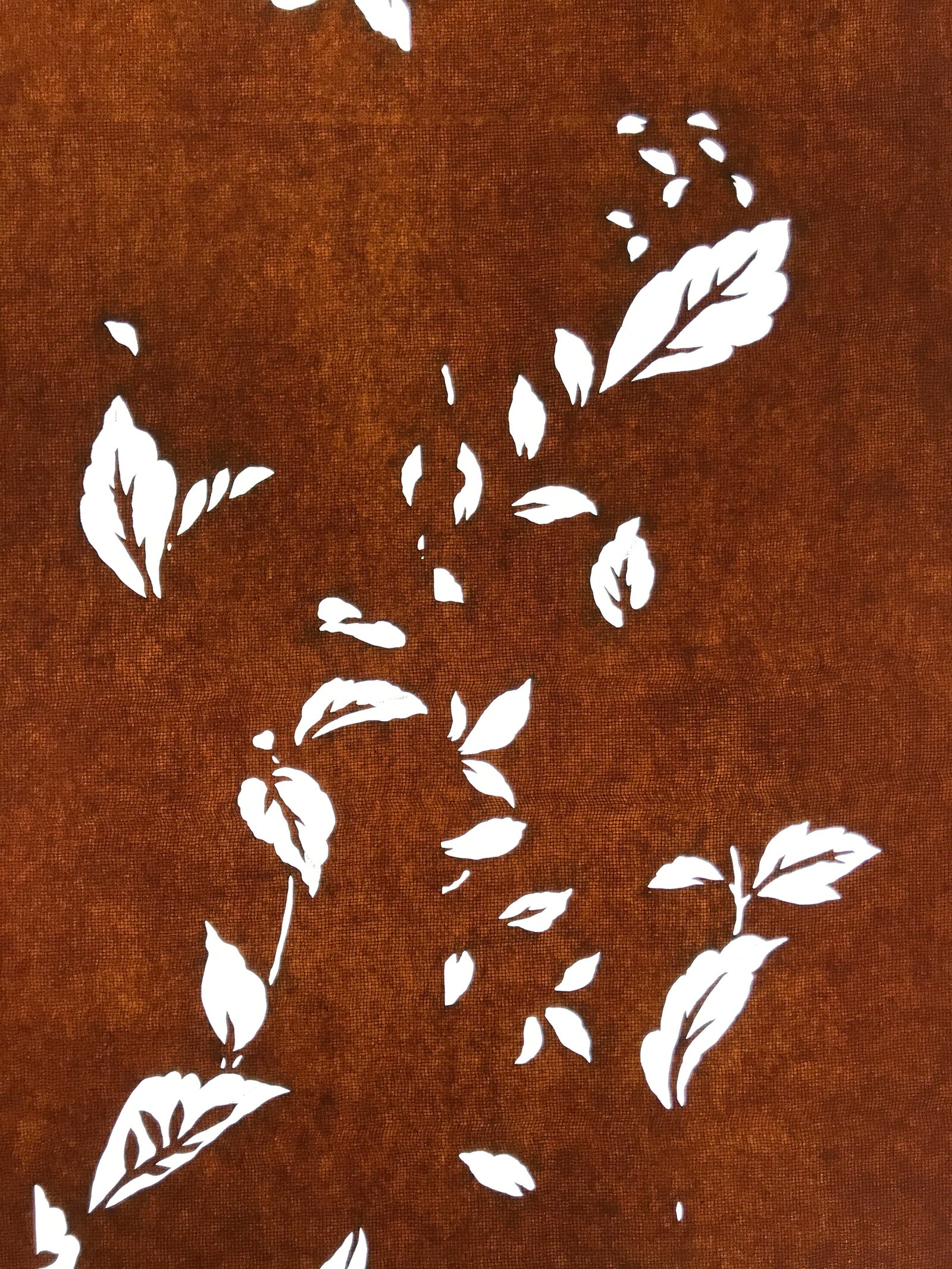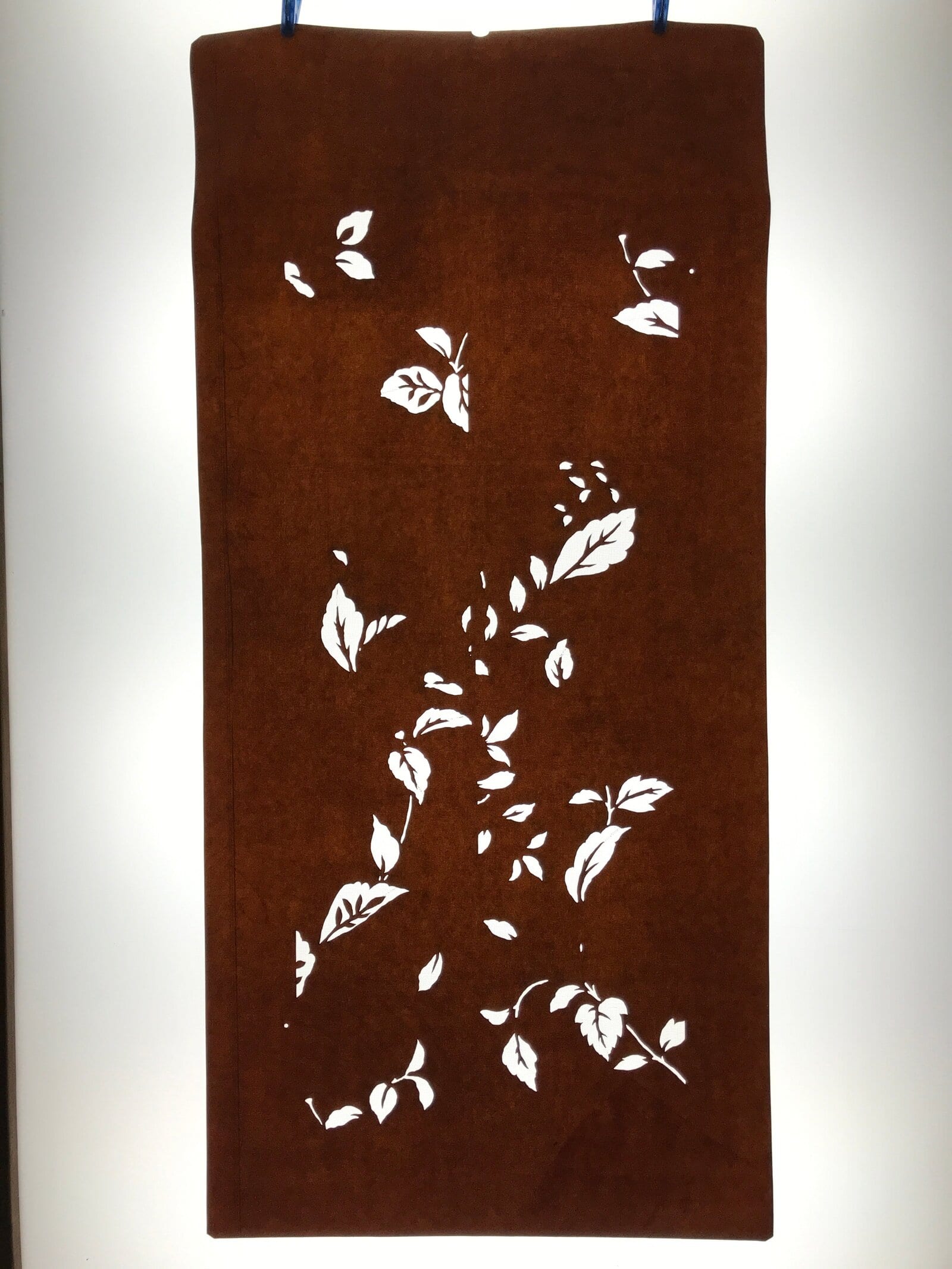 Using traditional mulberry paper, this katagami stencil with silk mesh backing features a simple, scattered design of plants (mostly leaves).