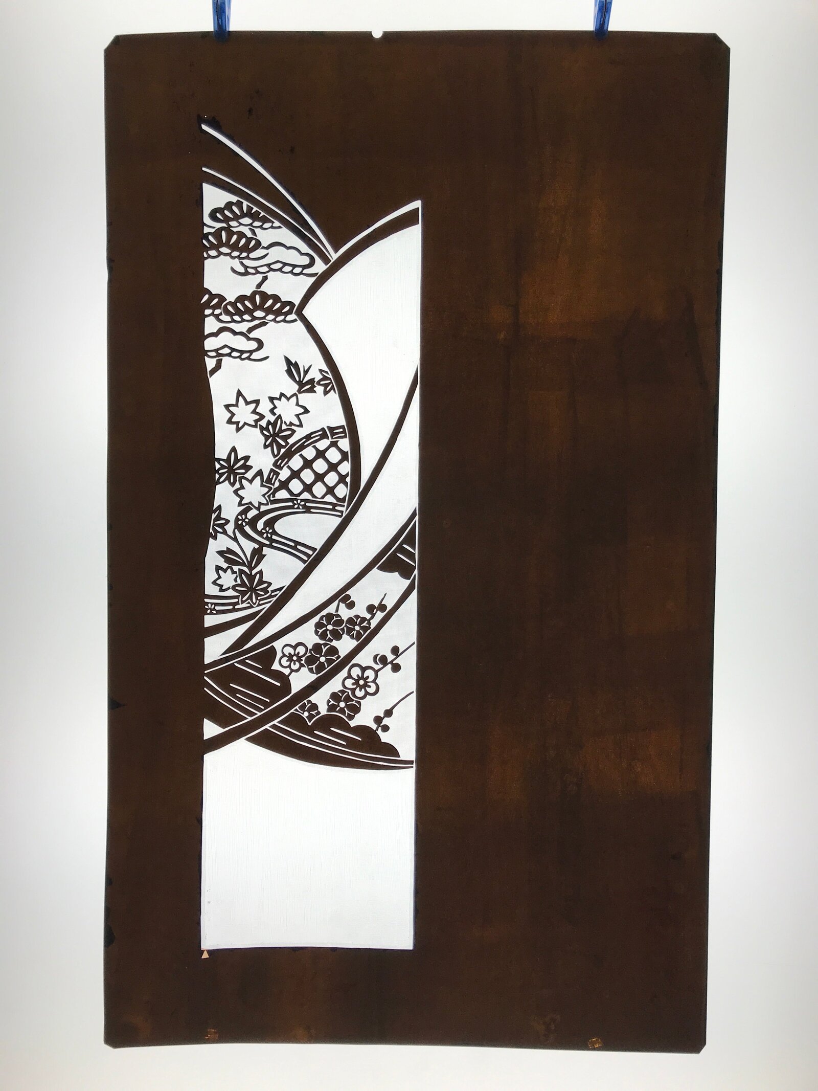 This antique Katagami was designed during the mid or late Edo period (1860) to early Meiji (1900) in Central Japan. It is made of two or more layers of handmade mulberry paper laminated together and waterproofed with persimmon tannin. Katagami printing uses a technique called resist dye where a paste is applied to the fabric with the katagami before dipping in ink. The open space on the katagami will be a negative space in the printed design.
