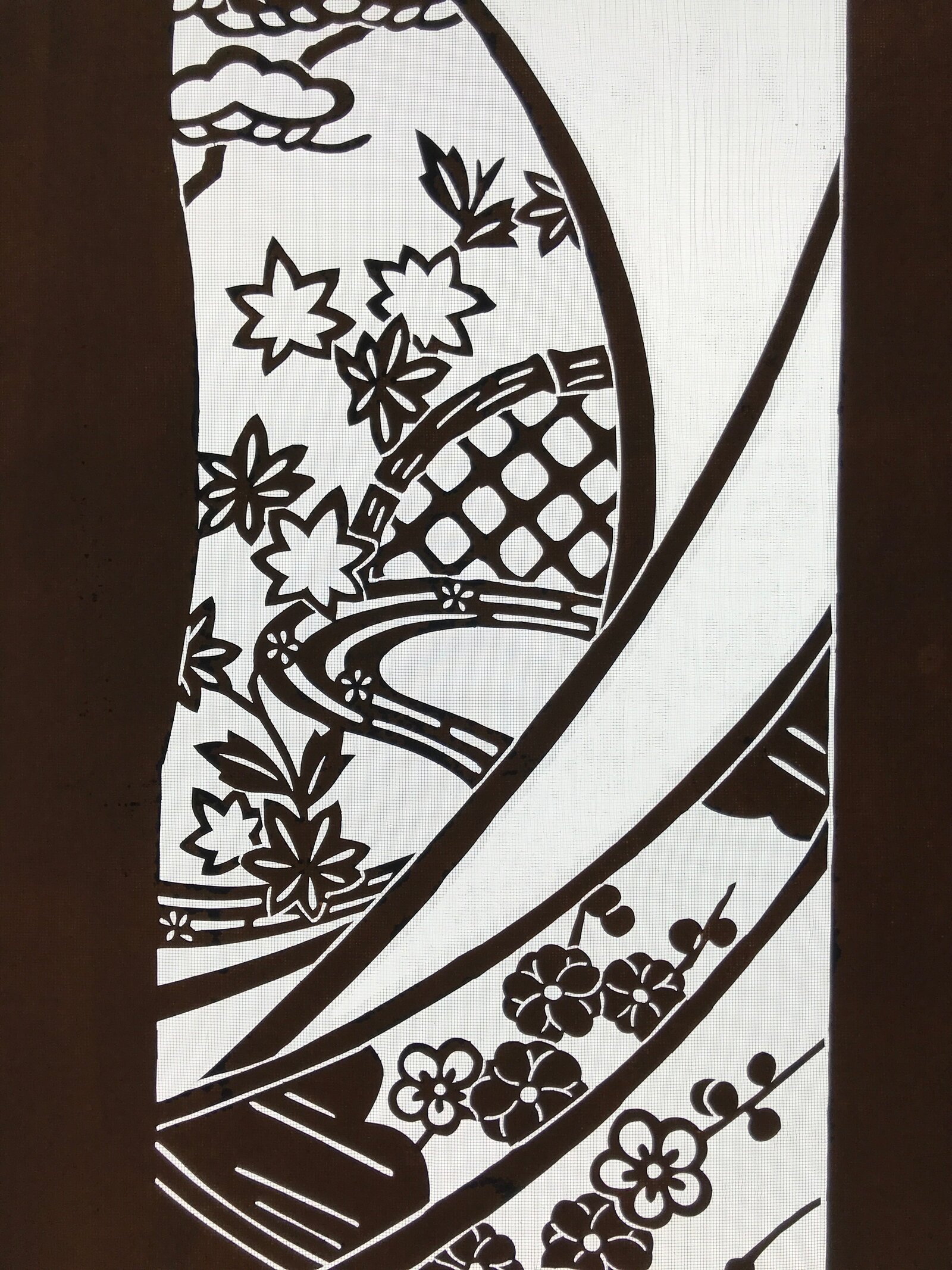 Using traditional mulberry paper, this katagami stencil with silk mesh backing features plum blossoms, momiji maple leaves, and pine trees. There is also what appears to be a woven basket image as well.
