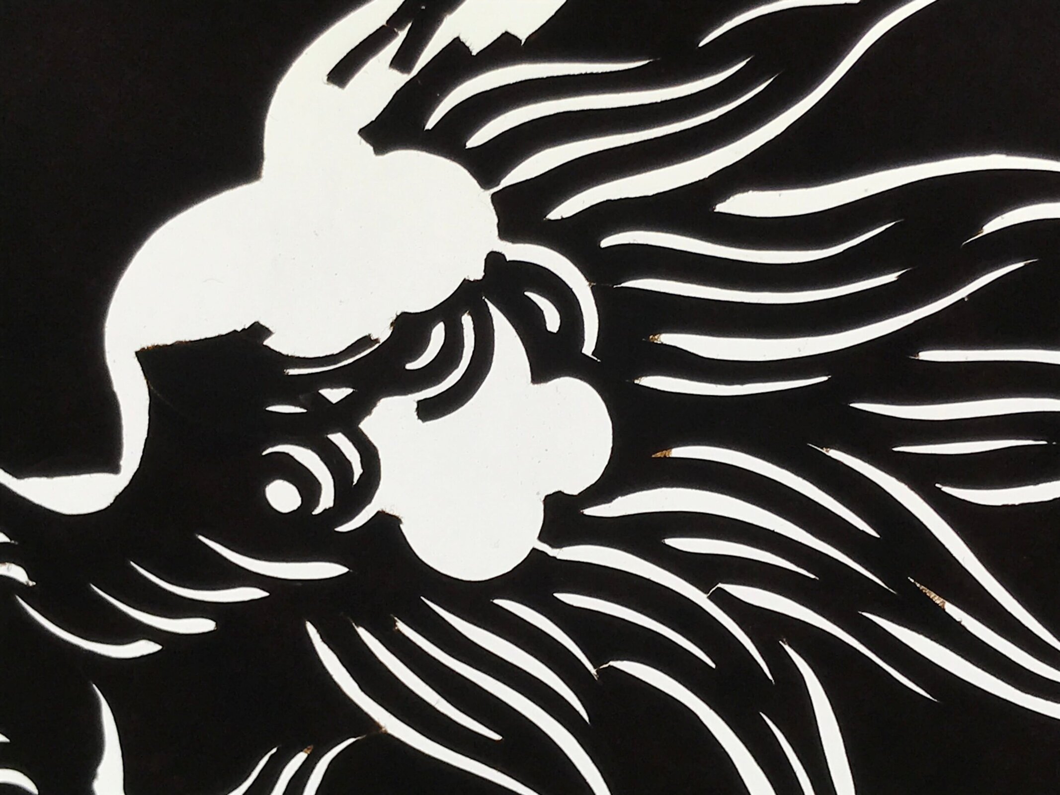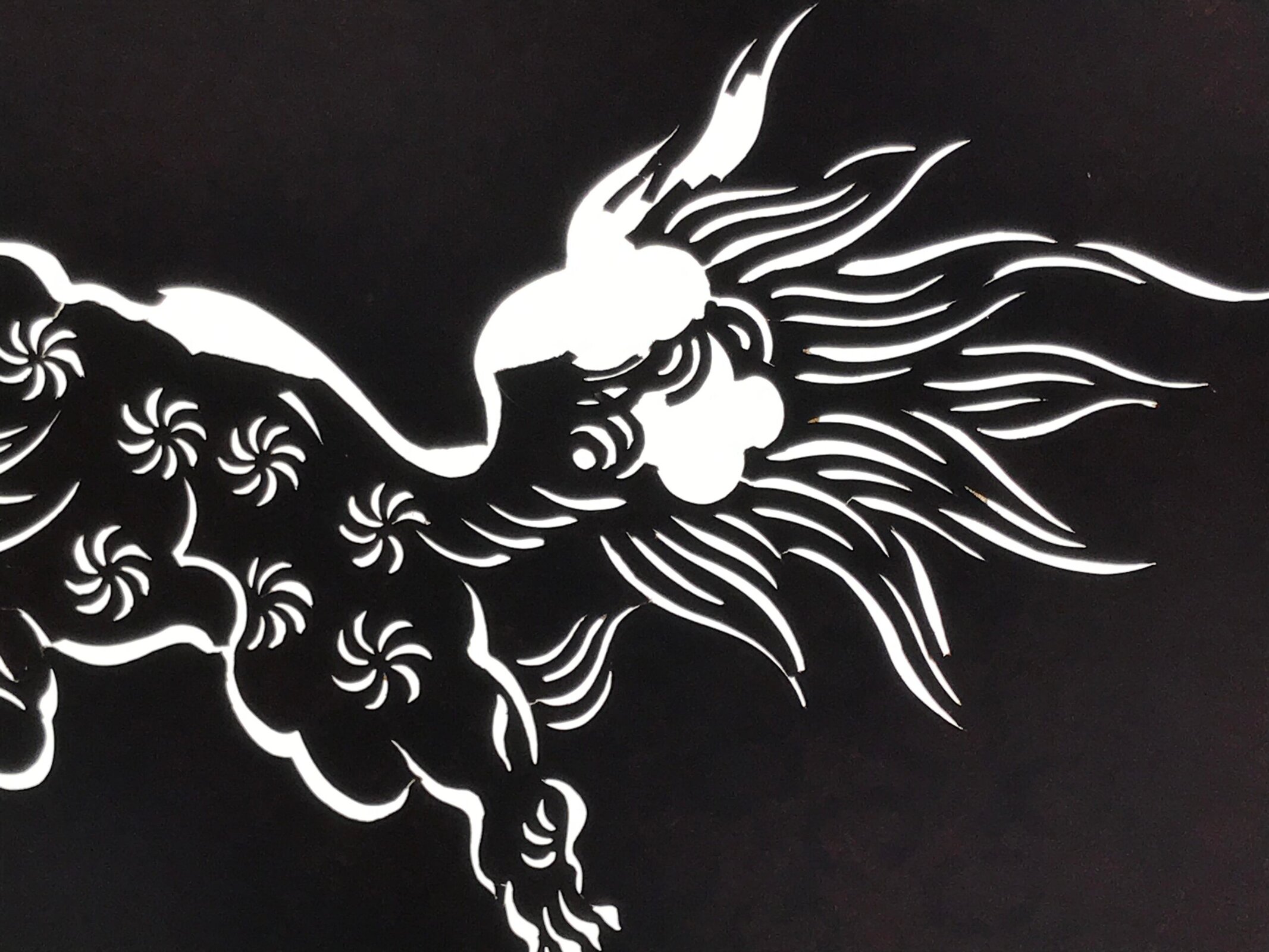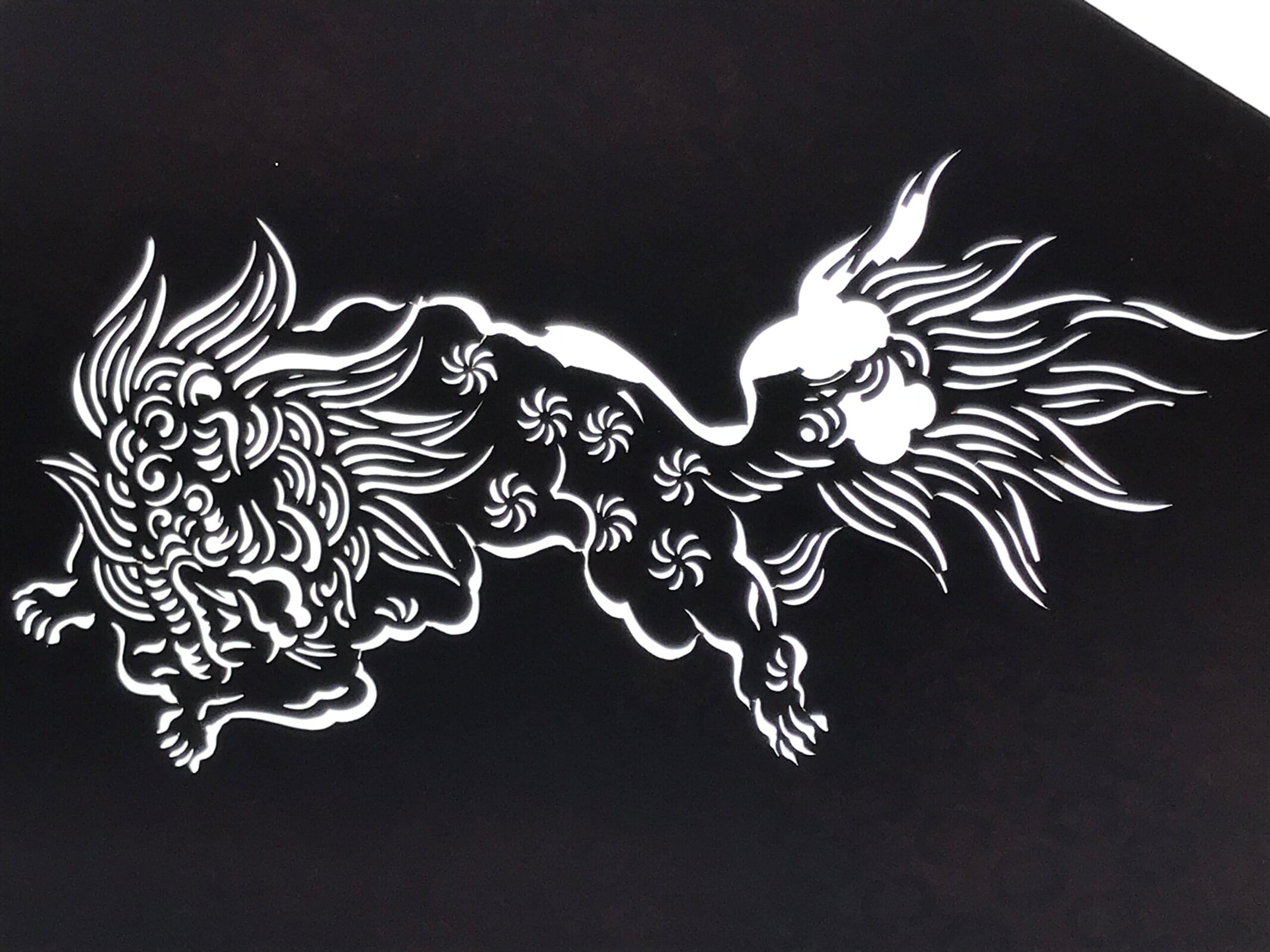 Using traditional mulberry washi paper, this katagami stencil features a gorgeous depiction of a leaping shishi lion dog.