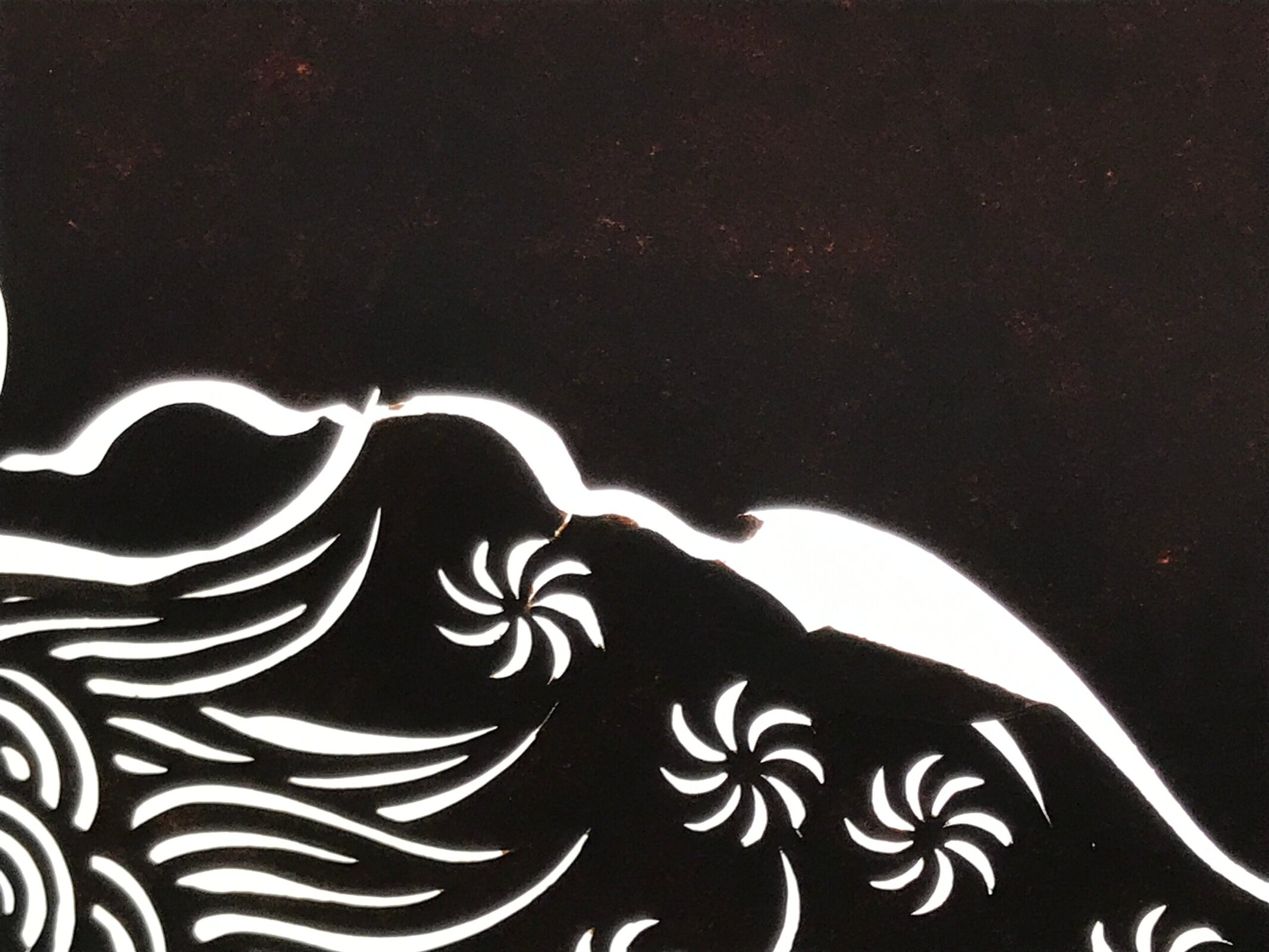 This antique Katagami was designed during the mid or late Edo period (1860) to early Meiji (1900) in Central Japan. It is made of two or more layers of handmade mulberry washi paper laminated together and waterproofed with persimmon tannin. Katagami printing uses a technique called resist dye where a paste is applied to the fabric with the katagami before dipping in ink. The open space on the katagami will be a negative space in the printed design.