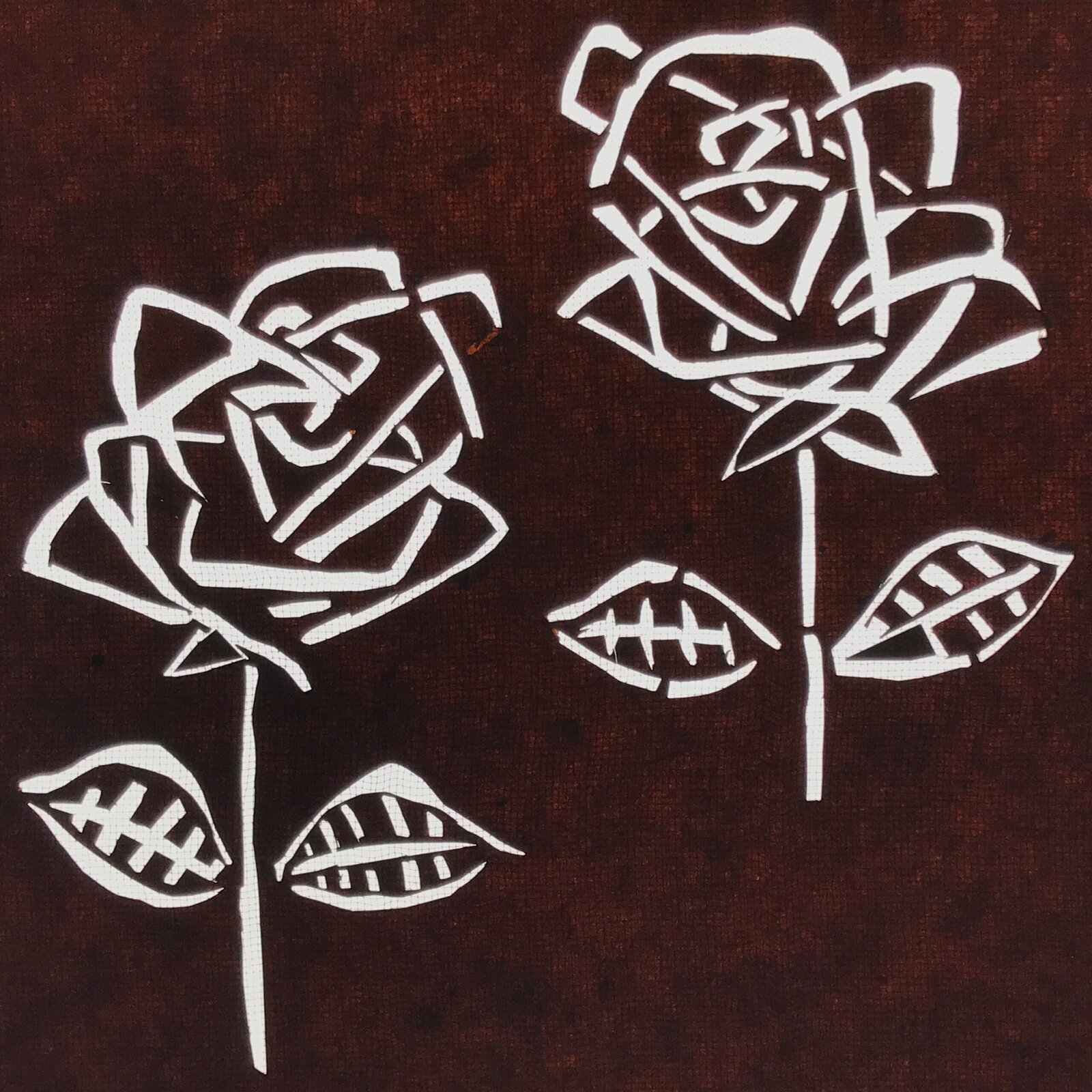 Using traditional mulberry washi paper, this katagami stencil with silk backing features a pair of blooming roses with stems and leaves.