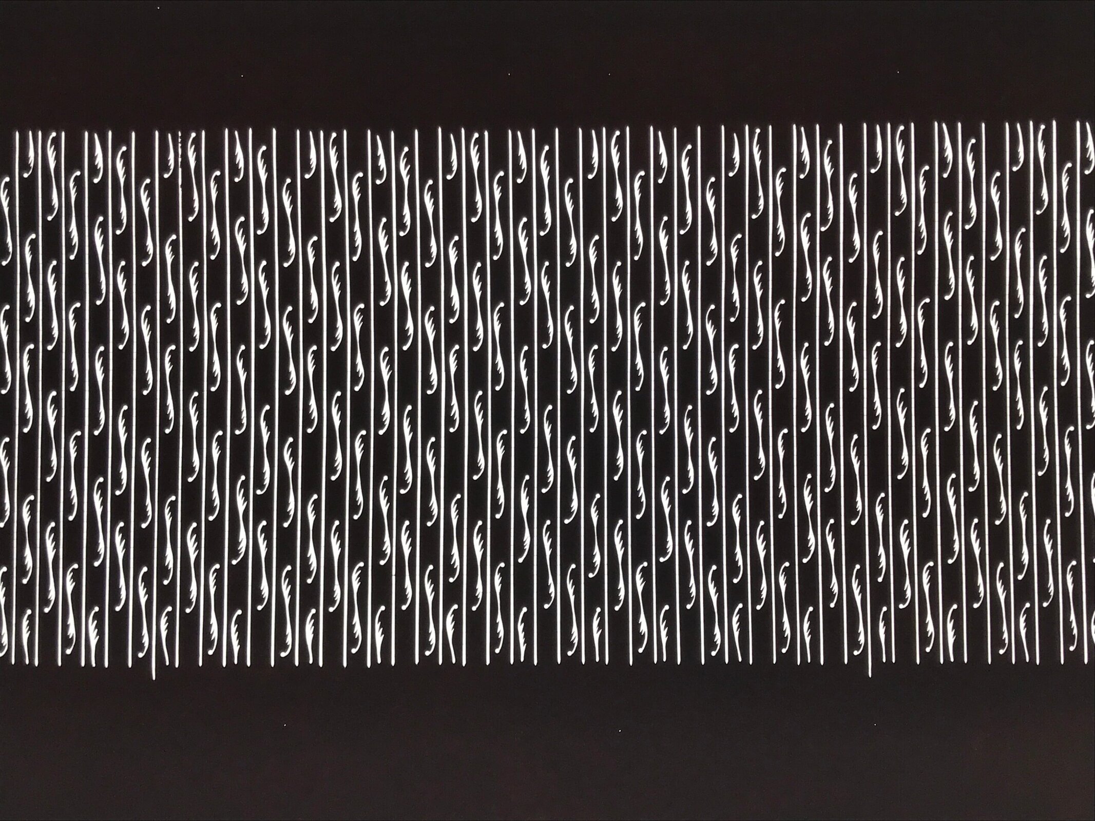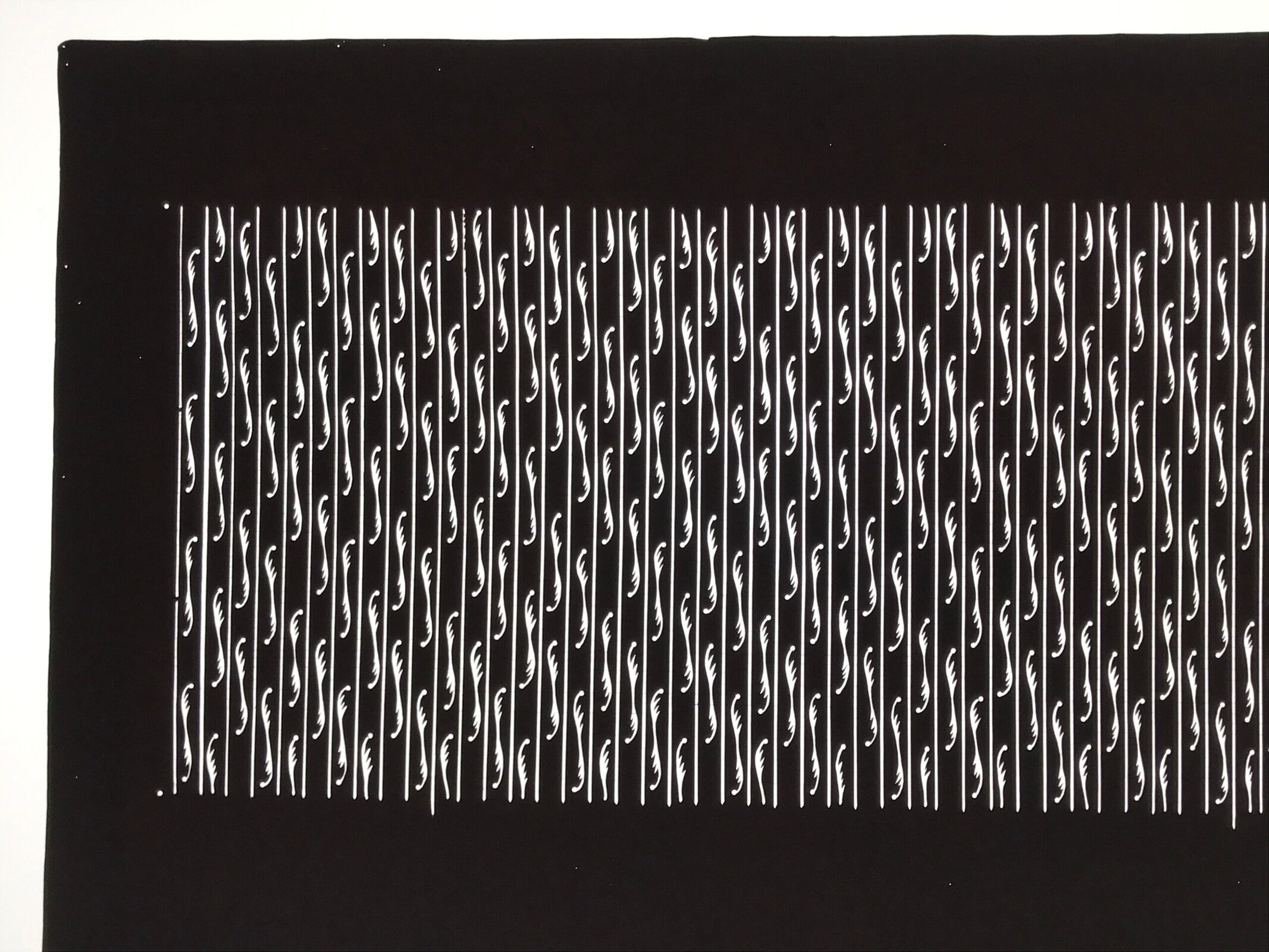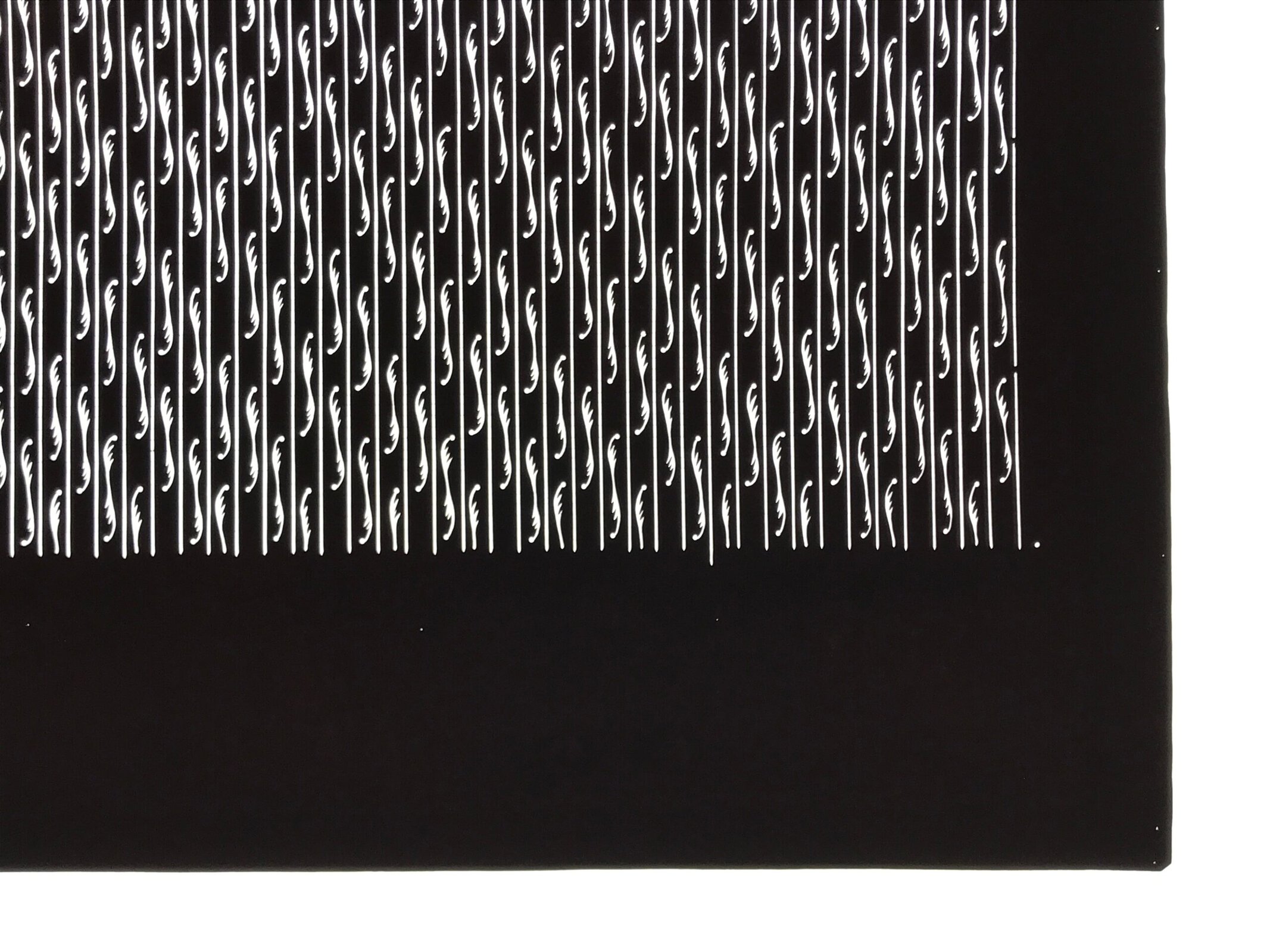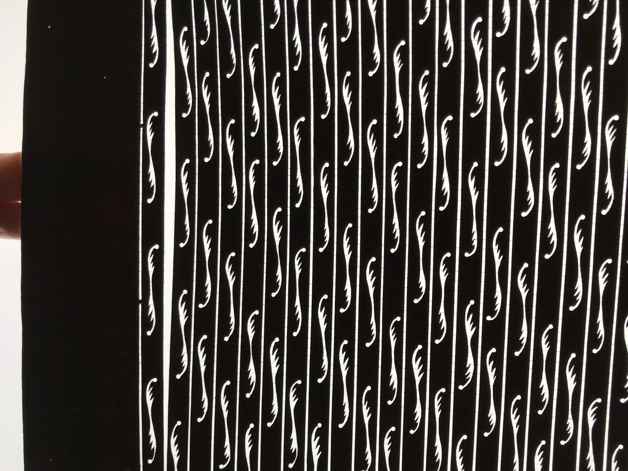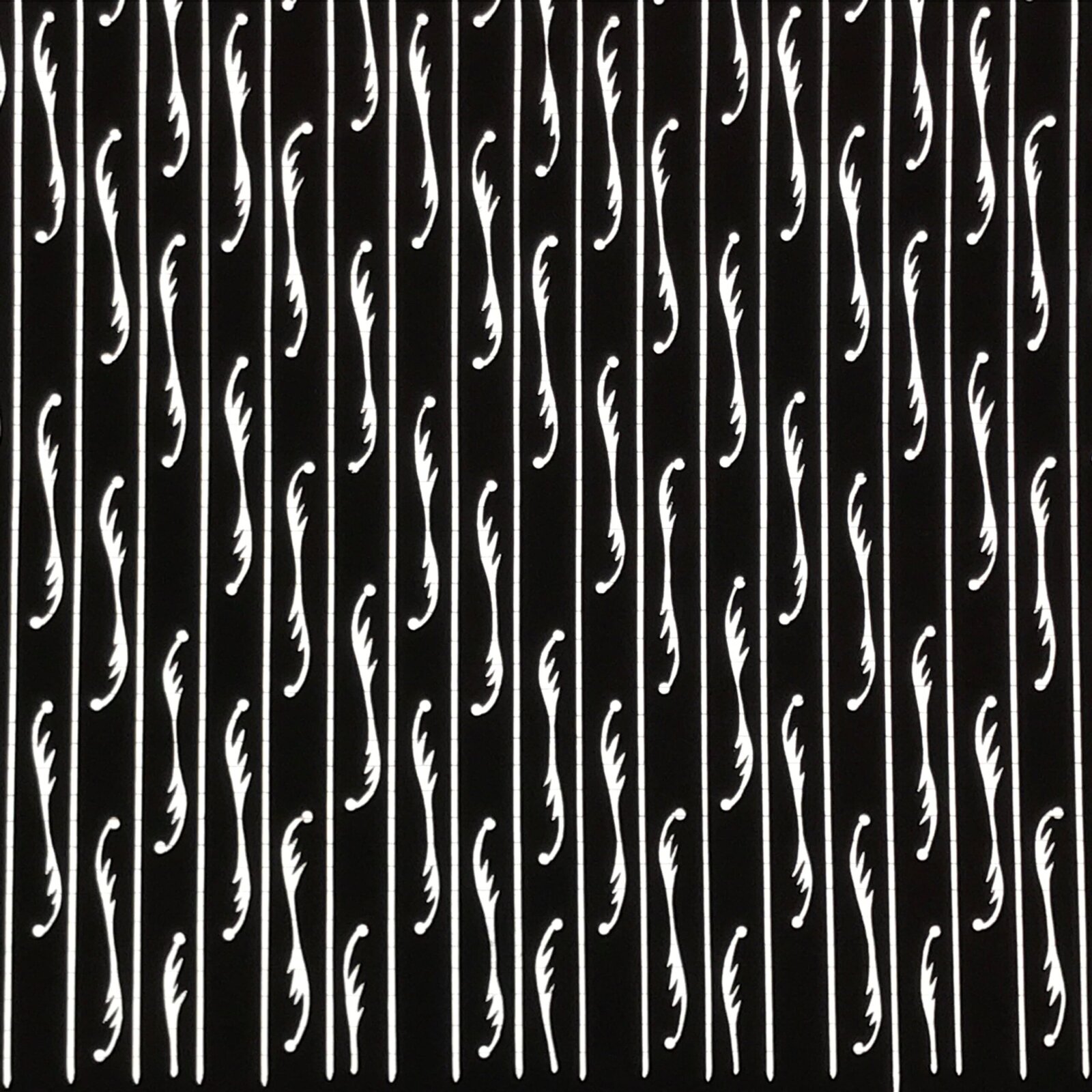 Using traditional mulberry washi paper, this katagami stencil features a decorative set of vertical lines with a plant motif at the center. There are very tiny silk threads holding the delicate pattern together.