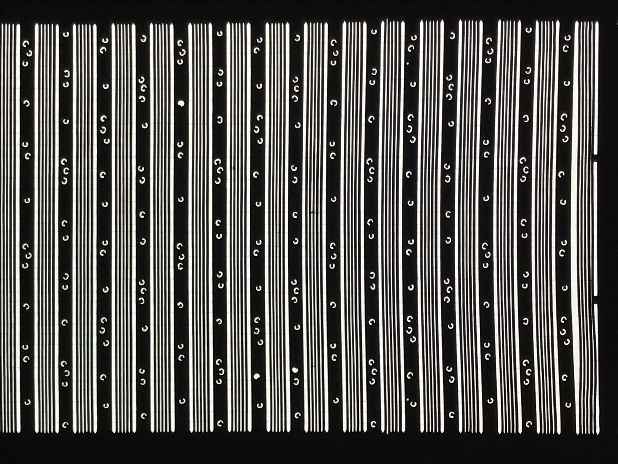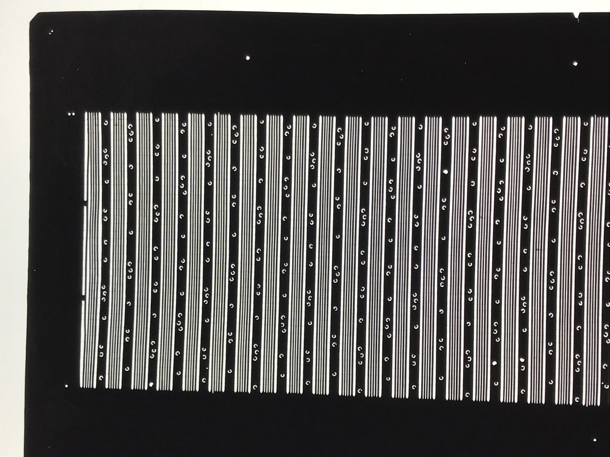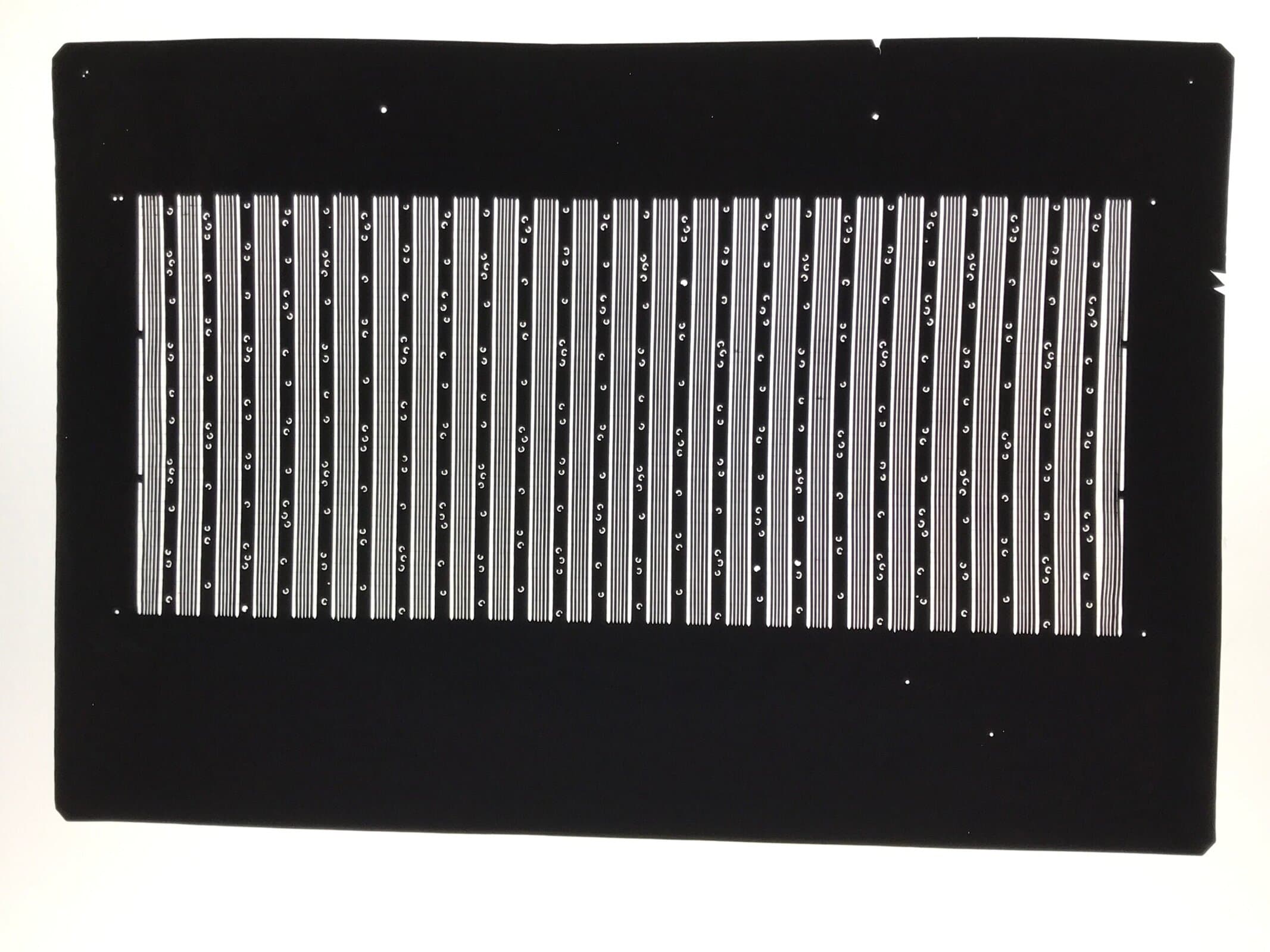 Using traditional mulberry washi paper, this katagami stencil features a simple set of vertical striped lines with small accents. There are very thin silk threads holding the delicate pattern in place.