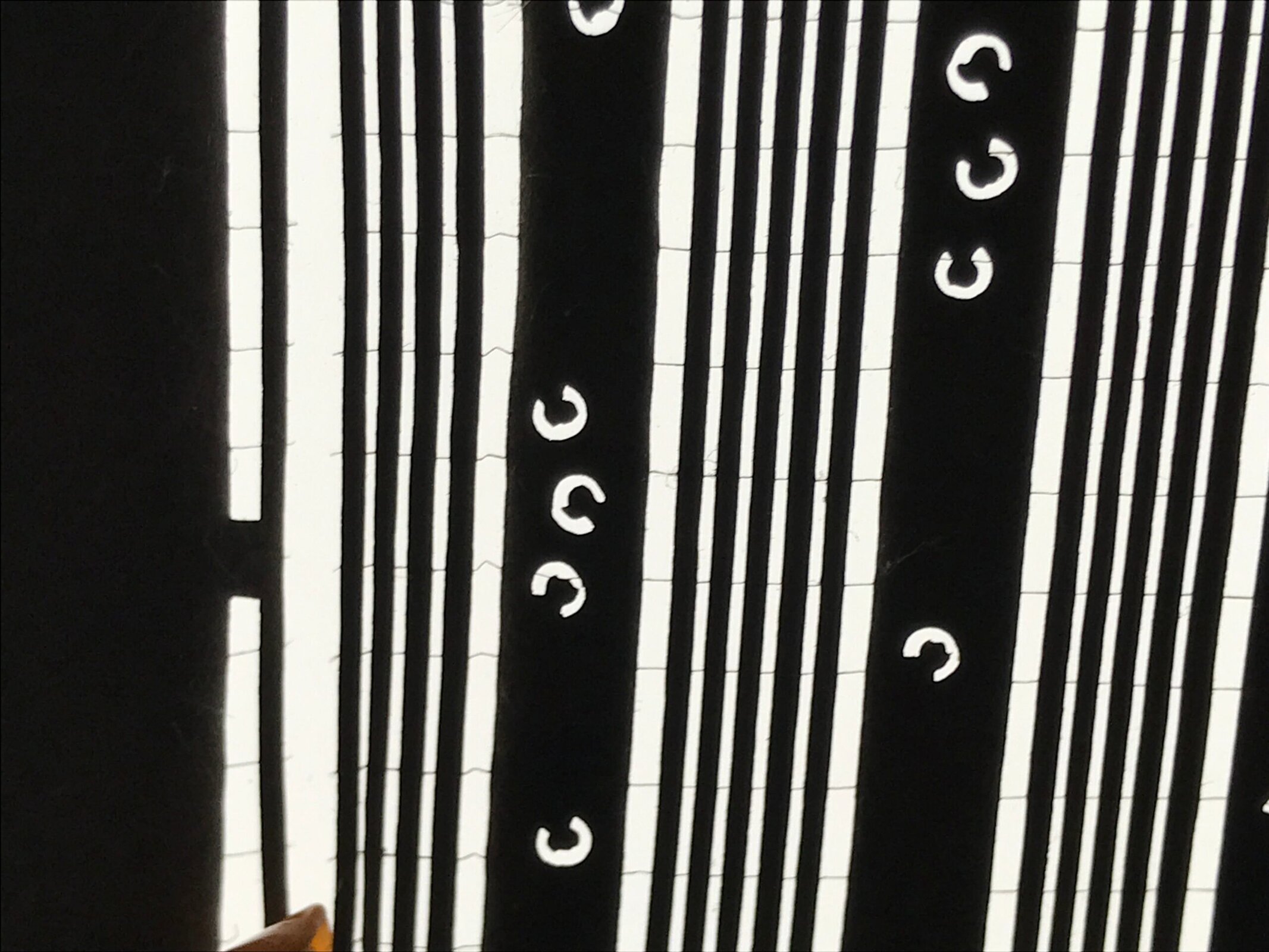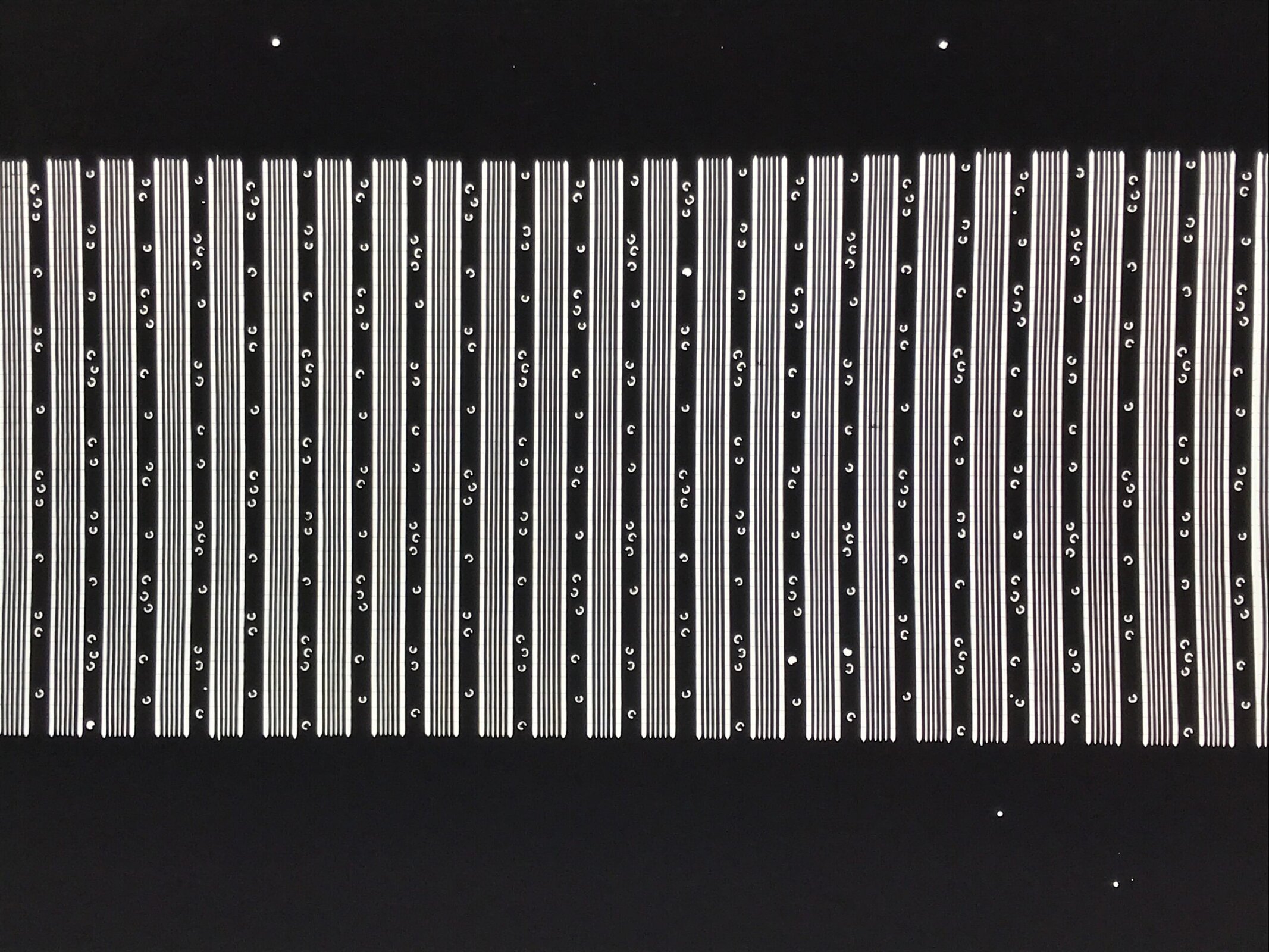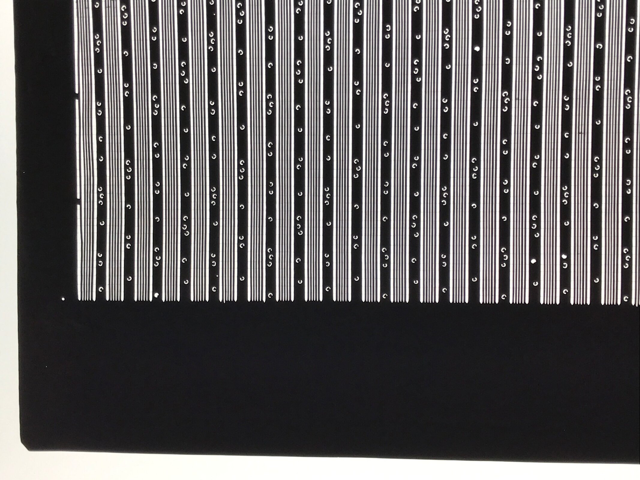 Using traditional mulberry washi paper, this katagami stencil features a simple set of vertical striped lines with small accents. There are very thin silk threads holding the delicate pattern in place.