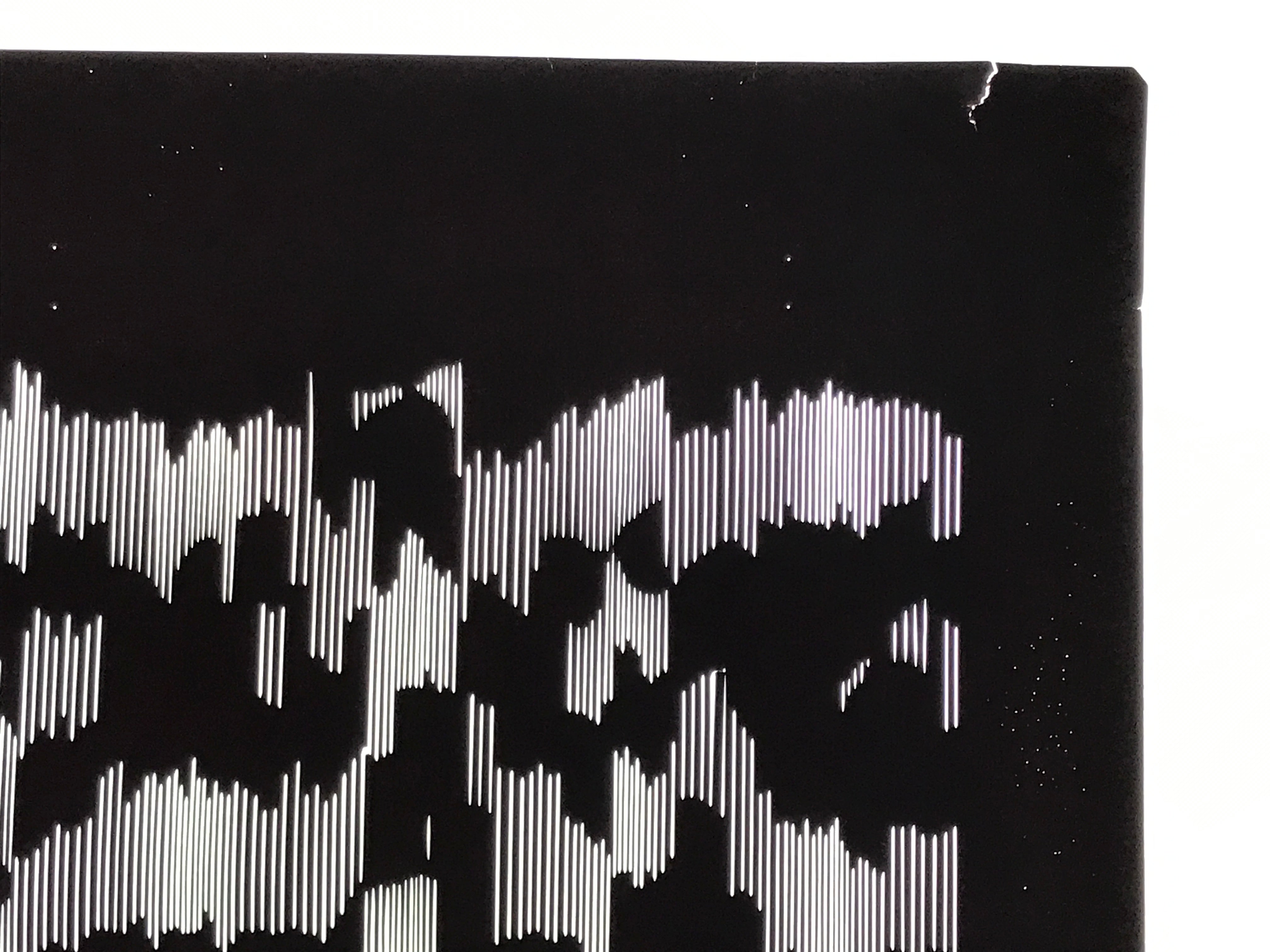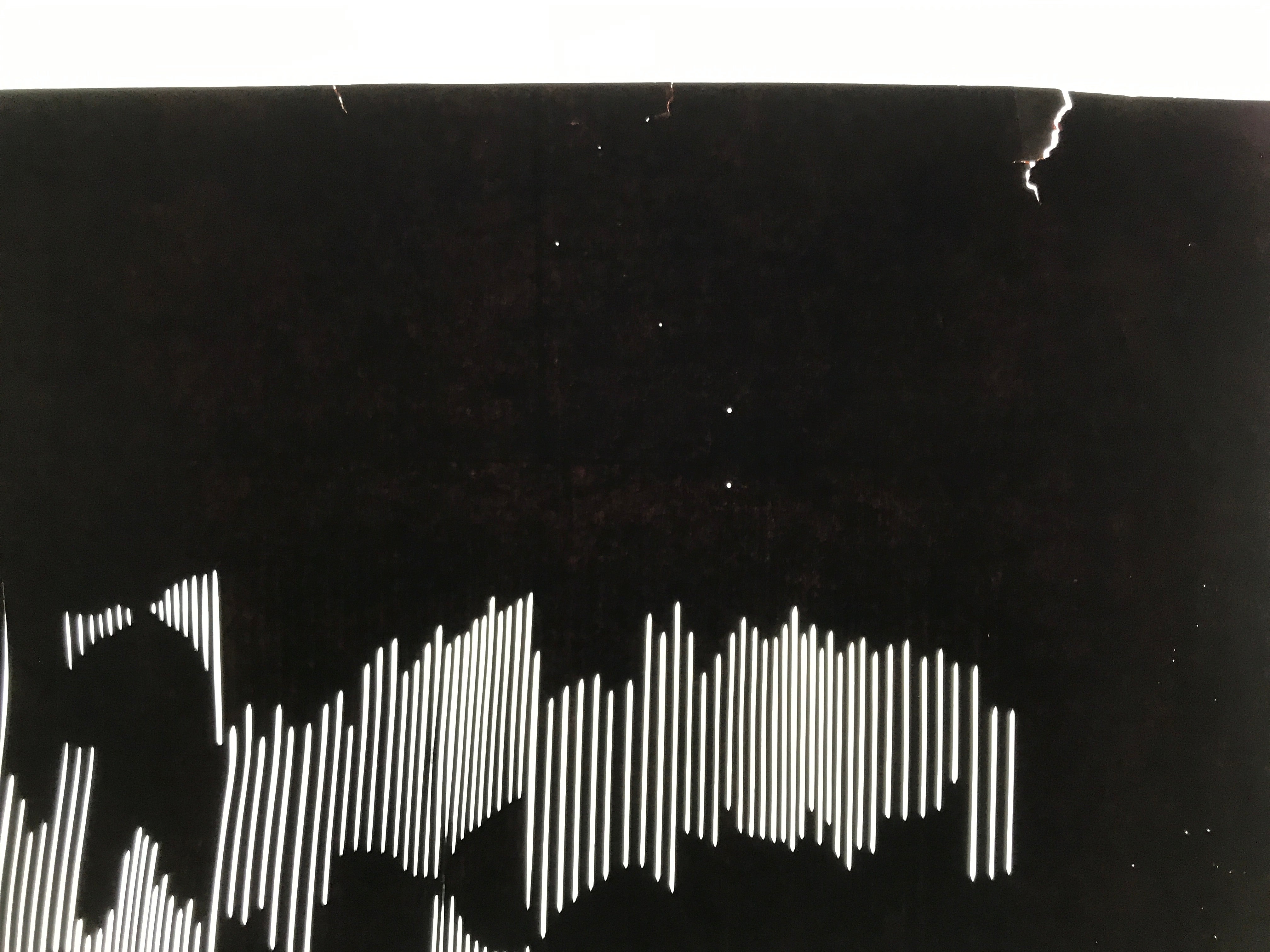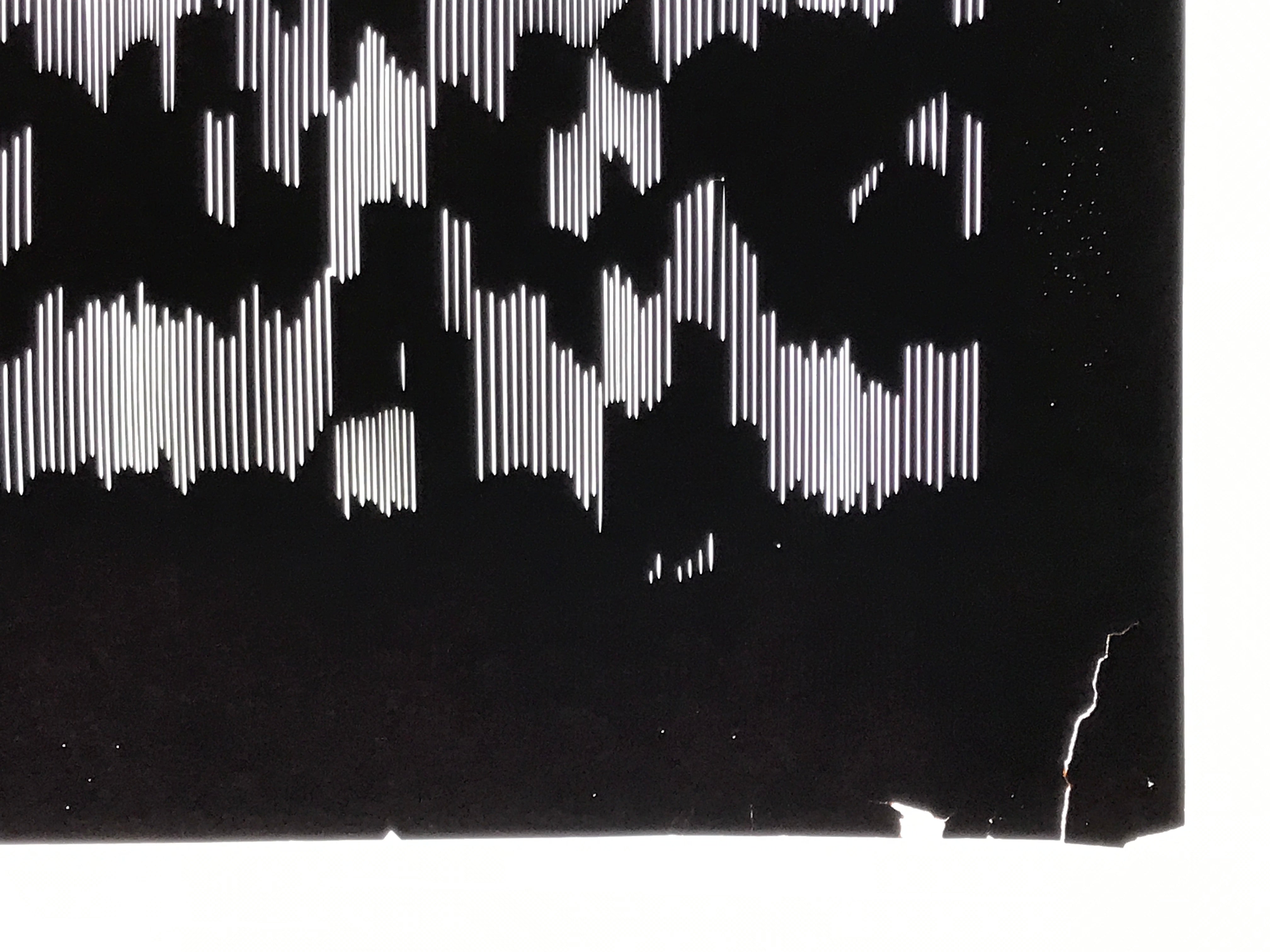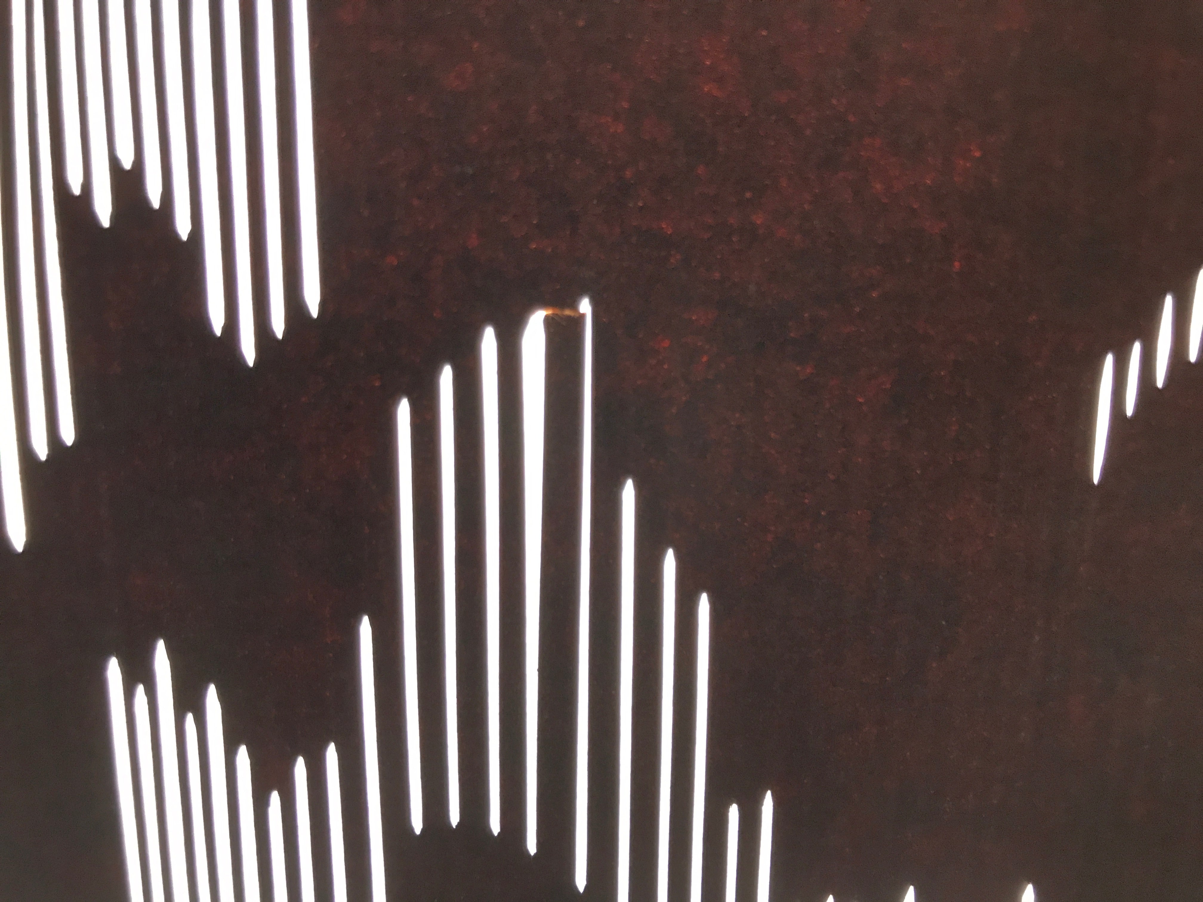 Using traditional mulberry paper, this katagami stencil with no silk mesh backing features vertical lines around blocked out sections. This piece is likely a background for a floral pattern.