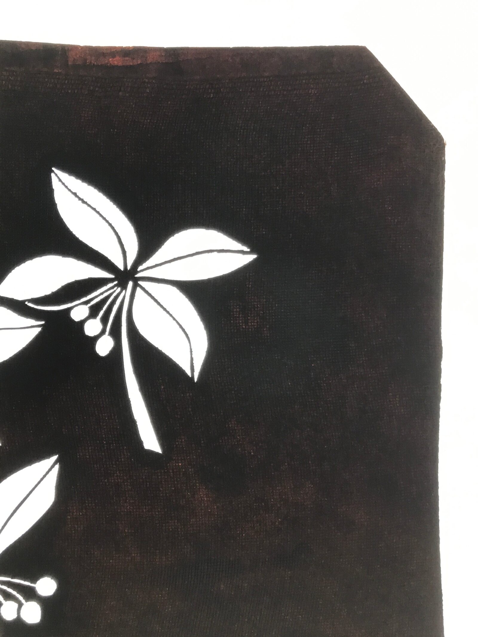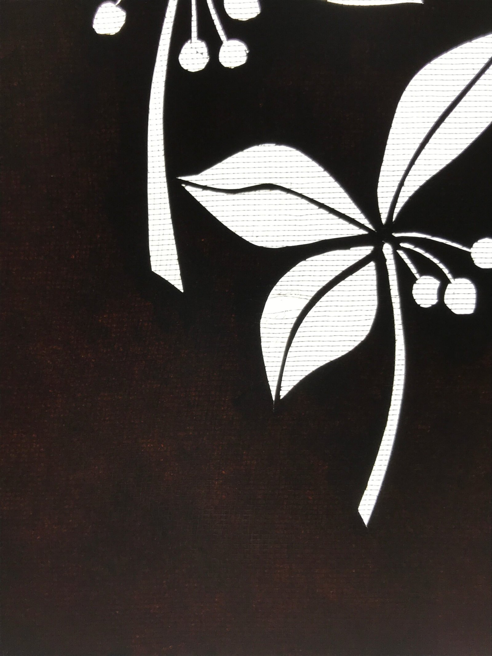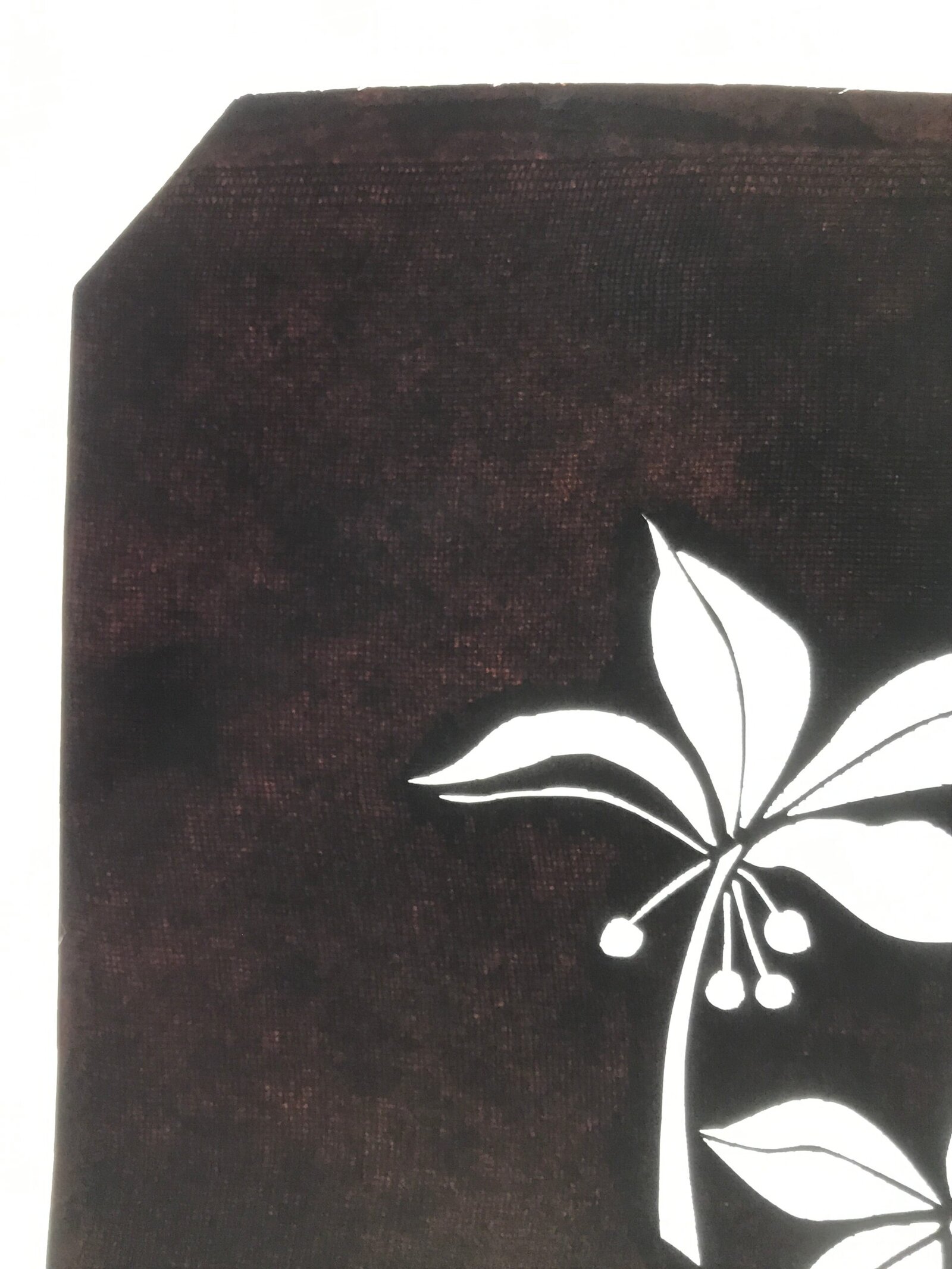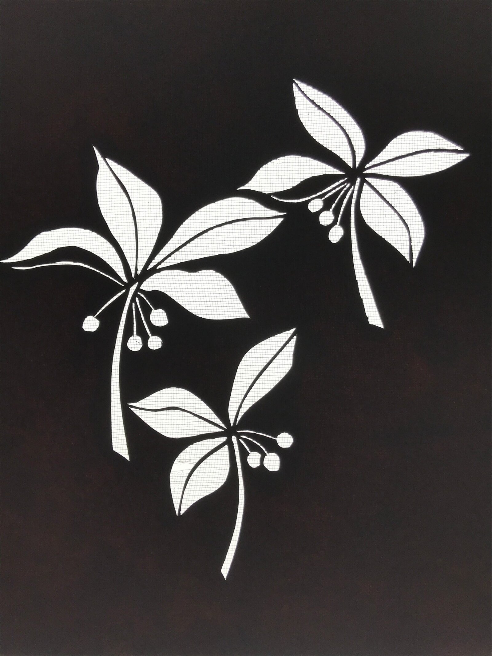 Using traditional mulberry washi paper, this small katagami stencil with silk backing features a trio of either long-leaf plants with berries or slender petal flowers.