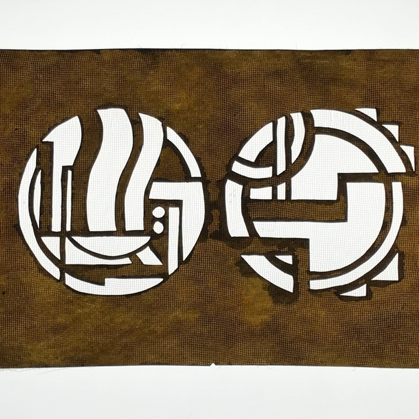 Using traditional mulberry washi paper, this katagami stencil with silk backing features two round geometric mon crest-like designs.