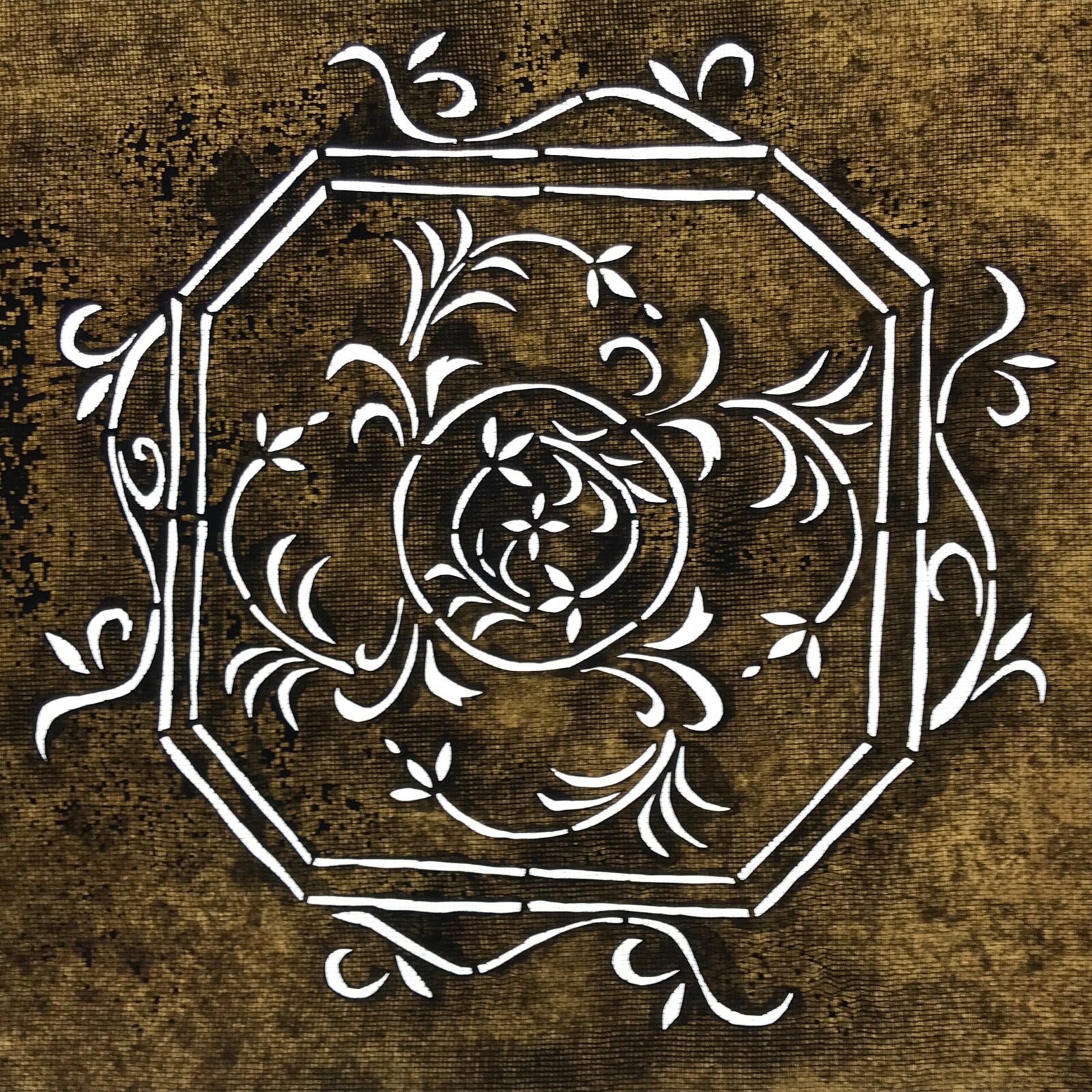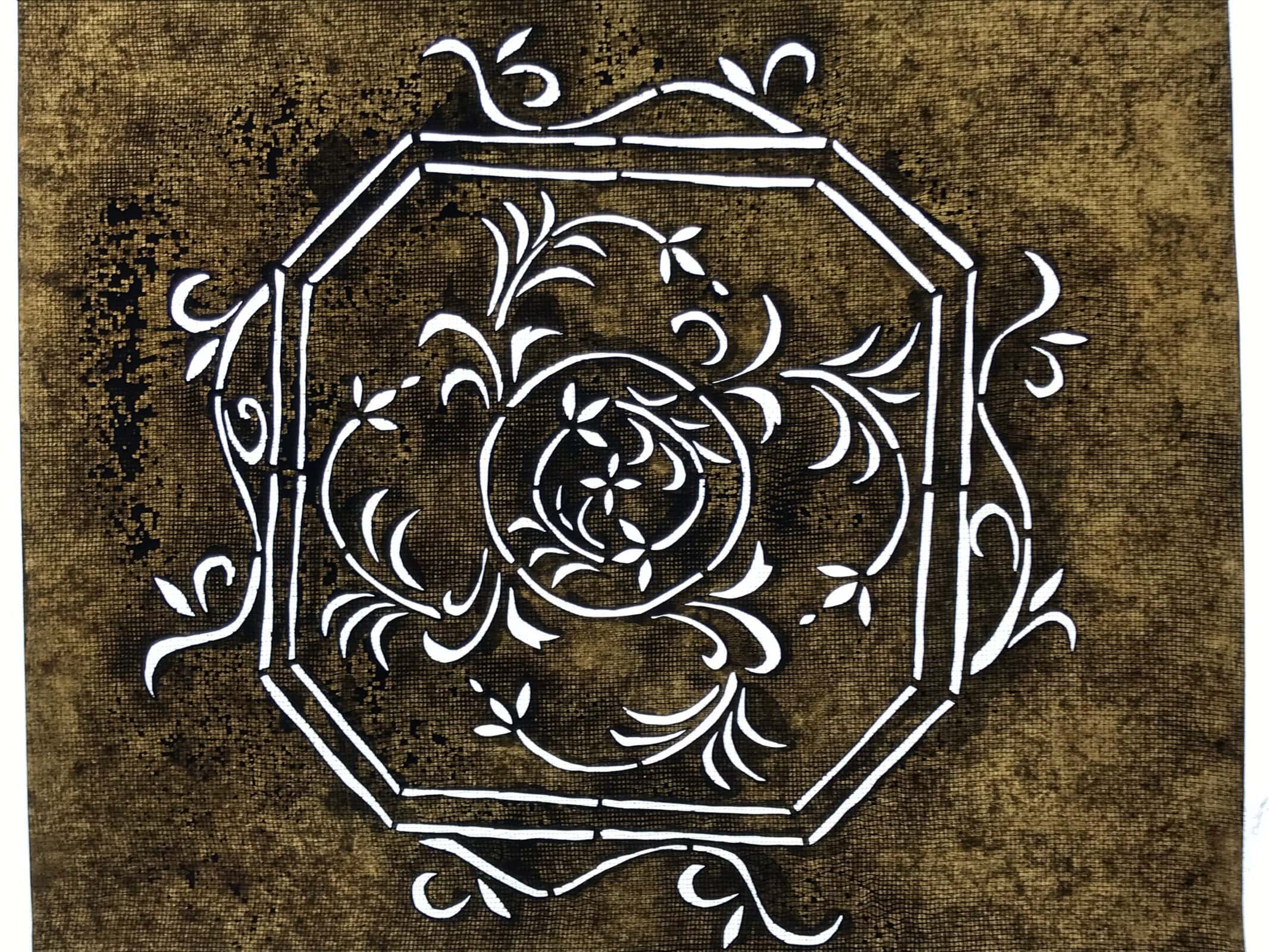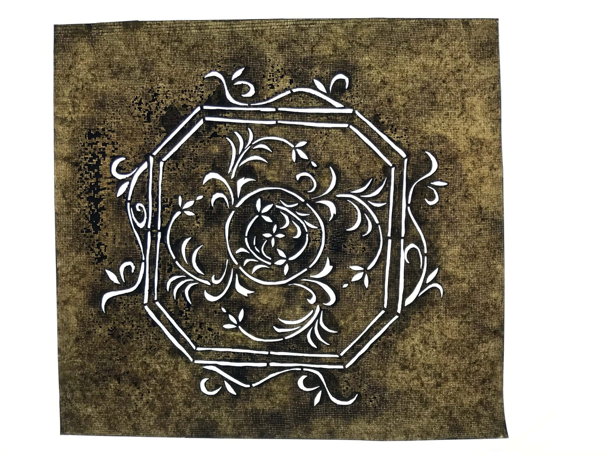 Using traditional mulberry washi paper, this katagami stencil with silk backing features an octagonal frame with vines and a small flower at the very center.