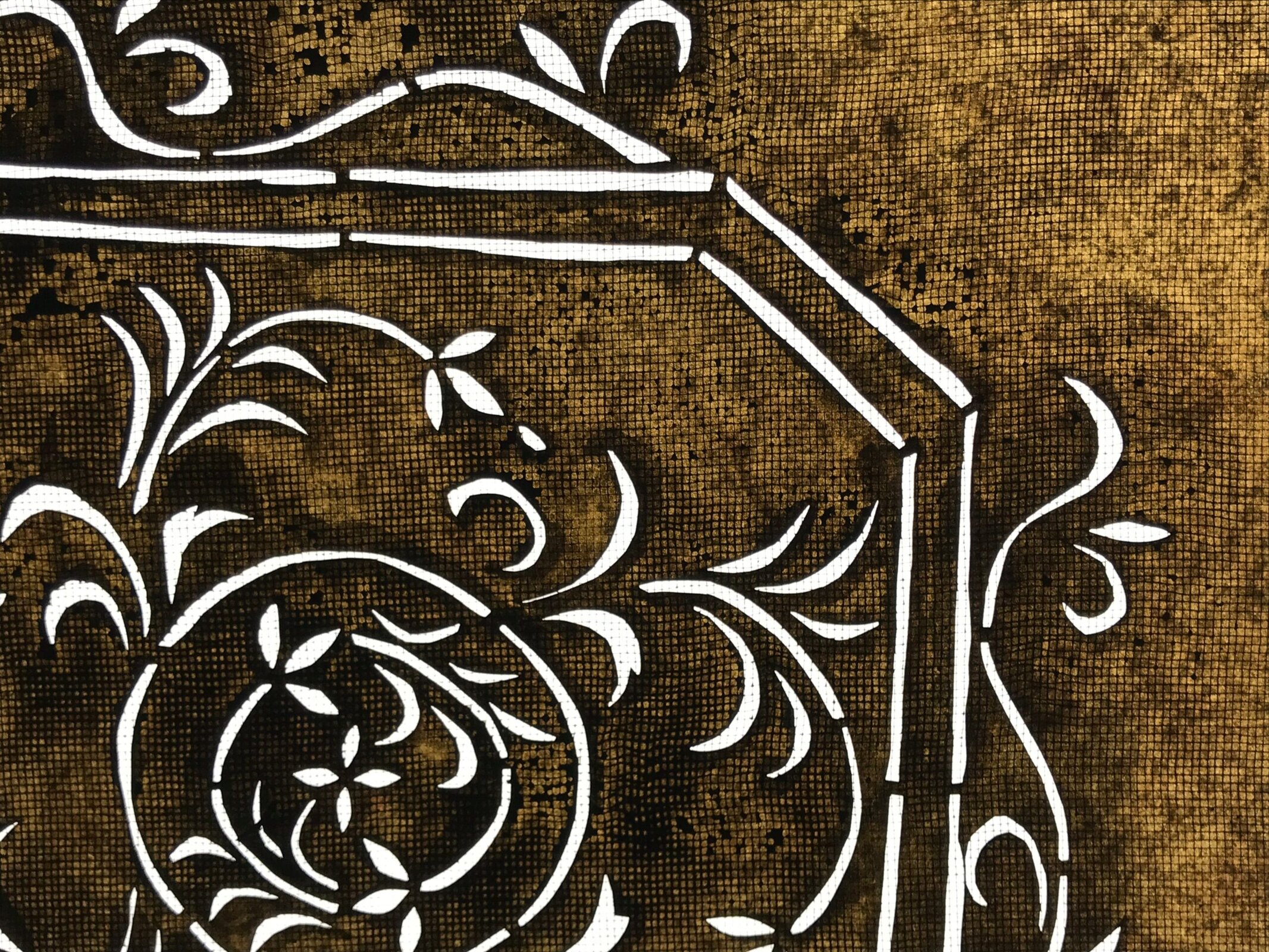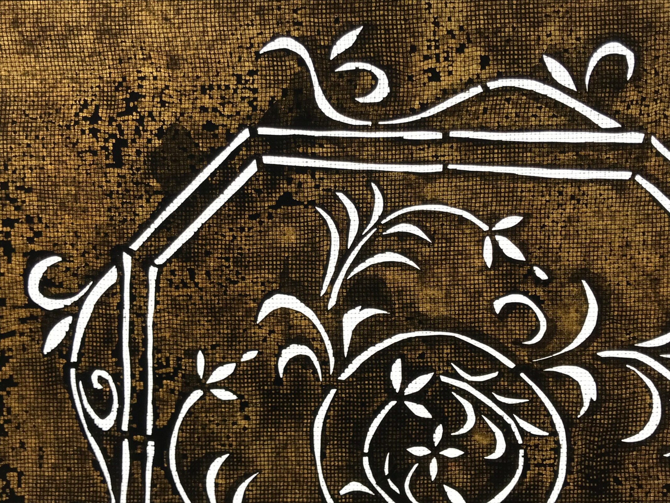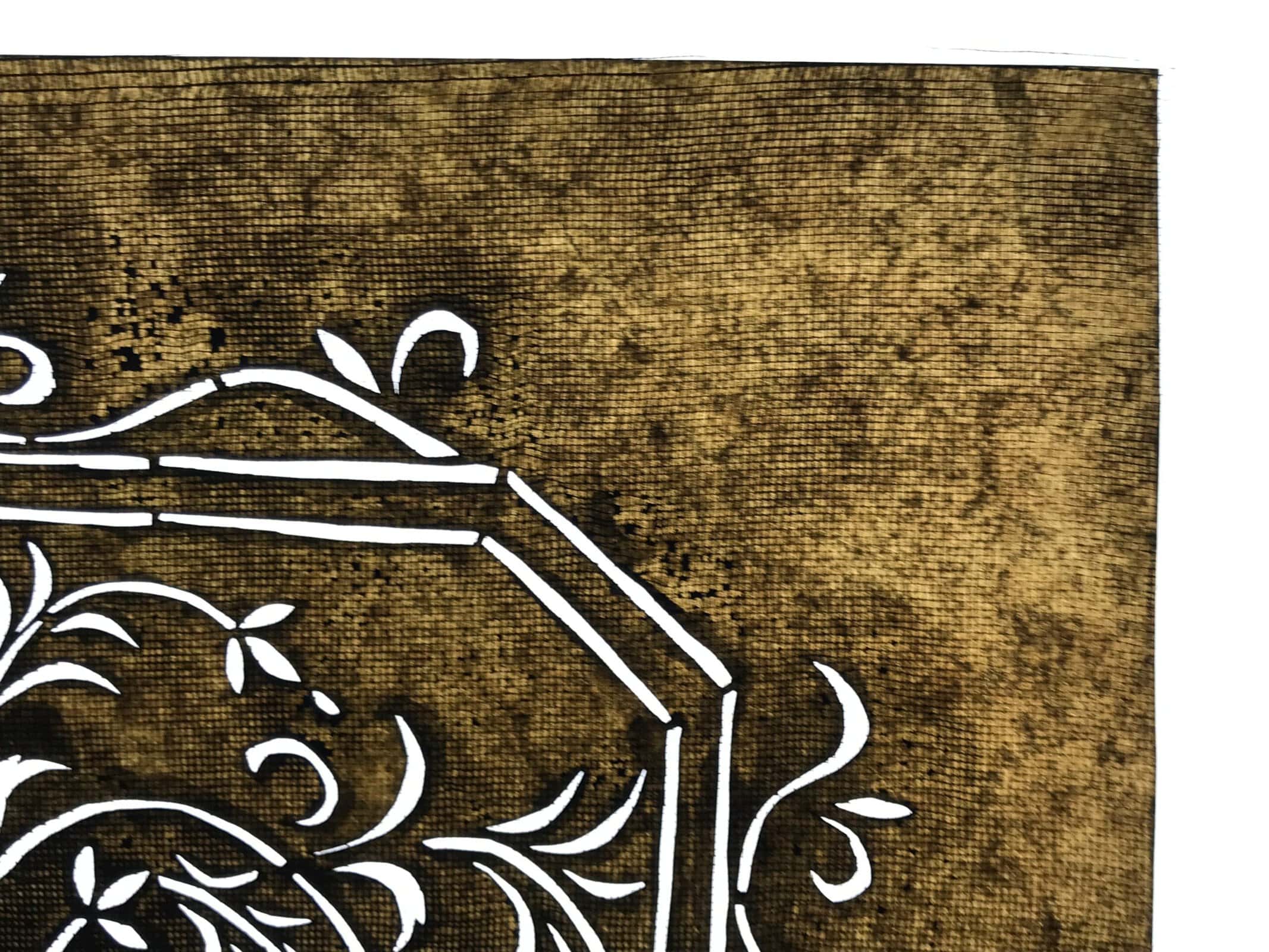 Using traditional mulberry washi paper, this katagami stencil with silk backing features an octagonal frame with vines and a small flower at the very center.