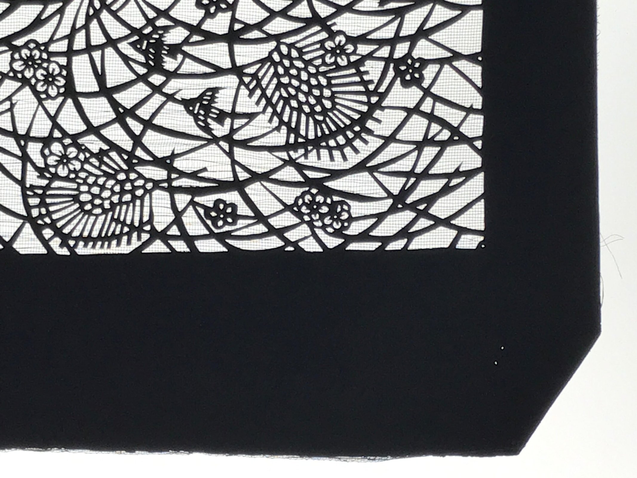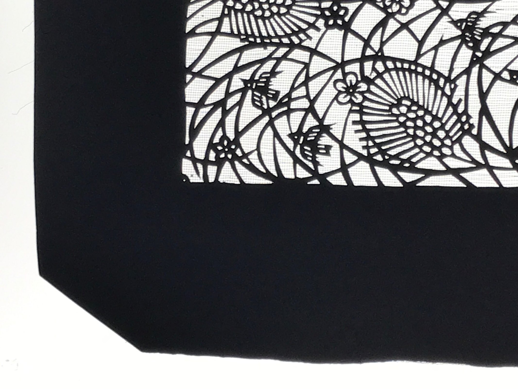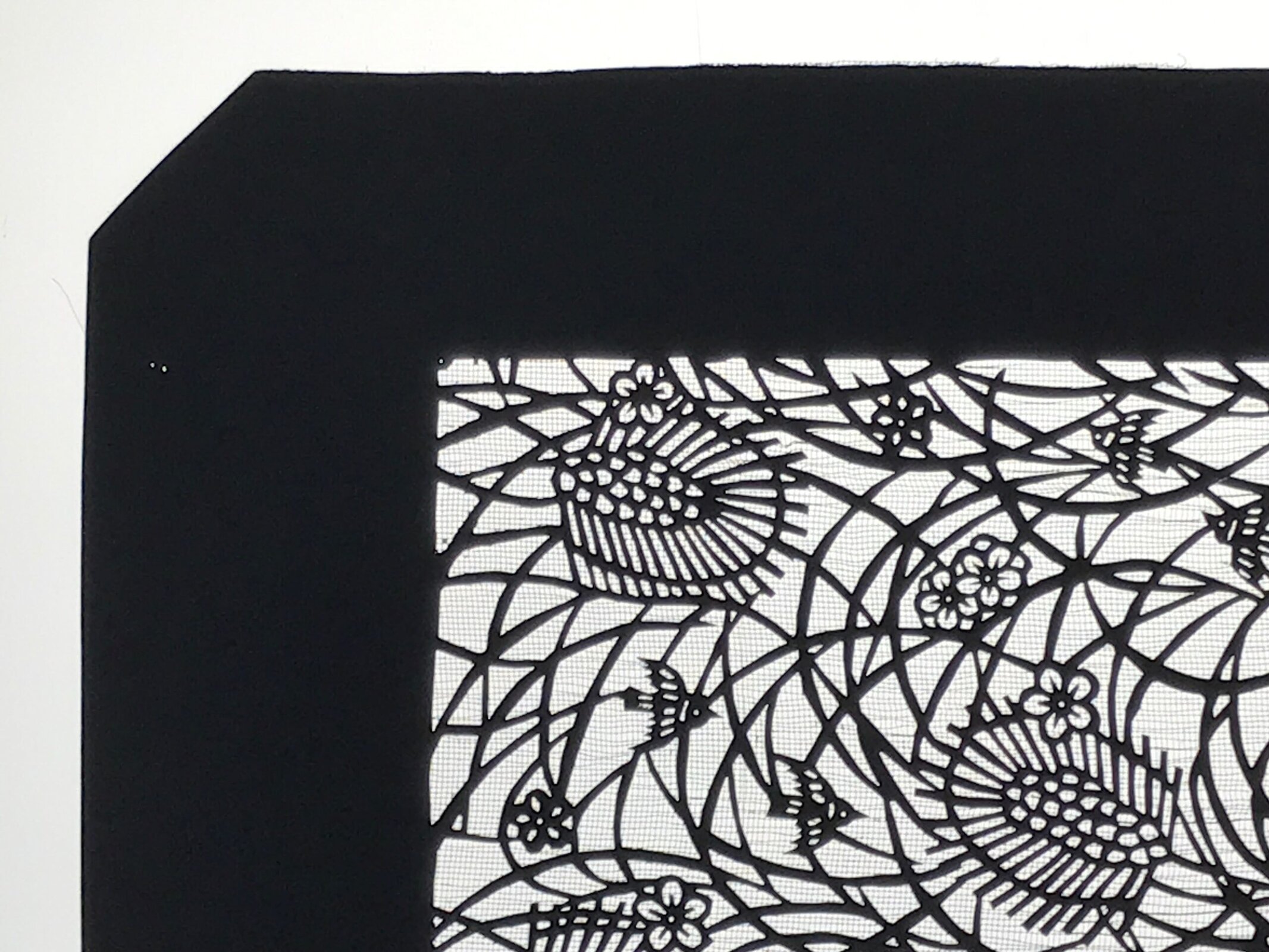 Using traditional mulberry washi paper, this katagami stencil with silk backing features a gorgeously crafted design of pinecone pine branches, small plum blossoms, and small flying birds.