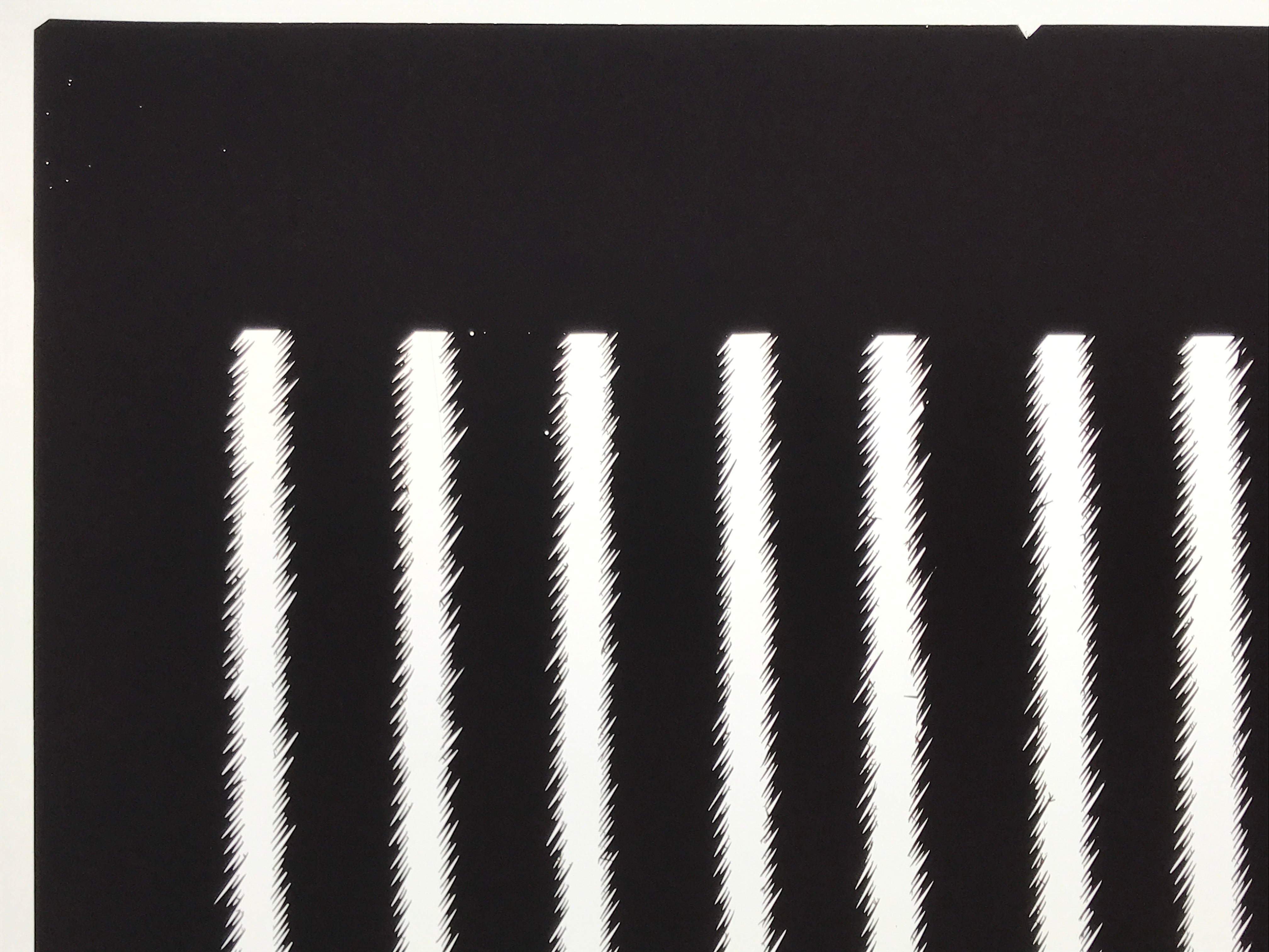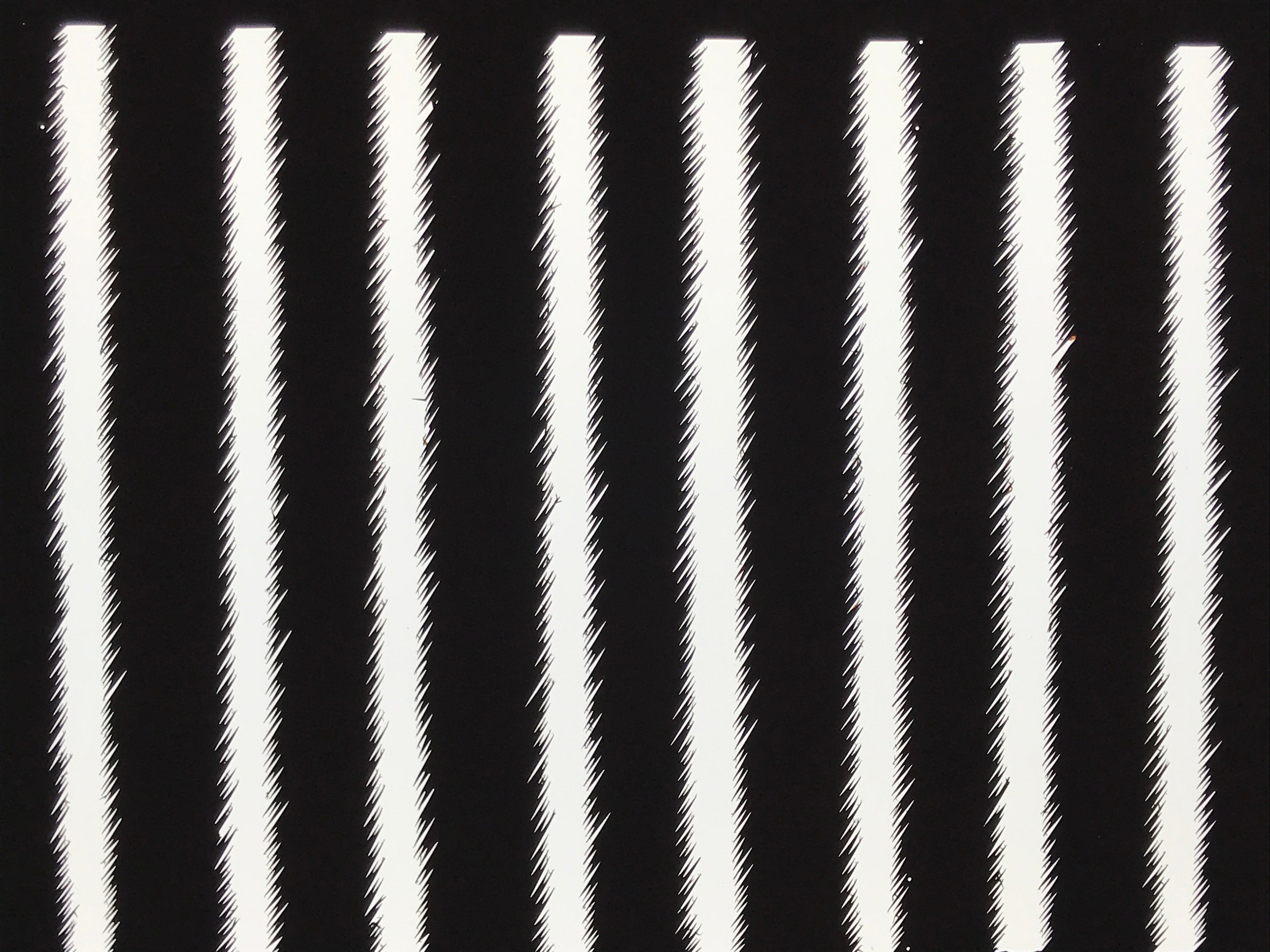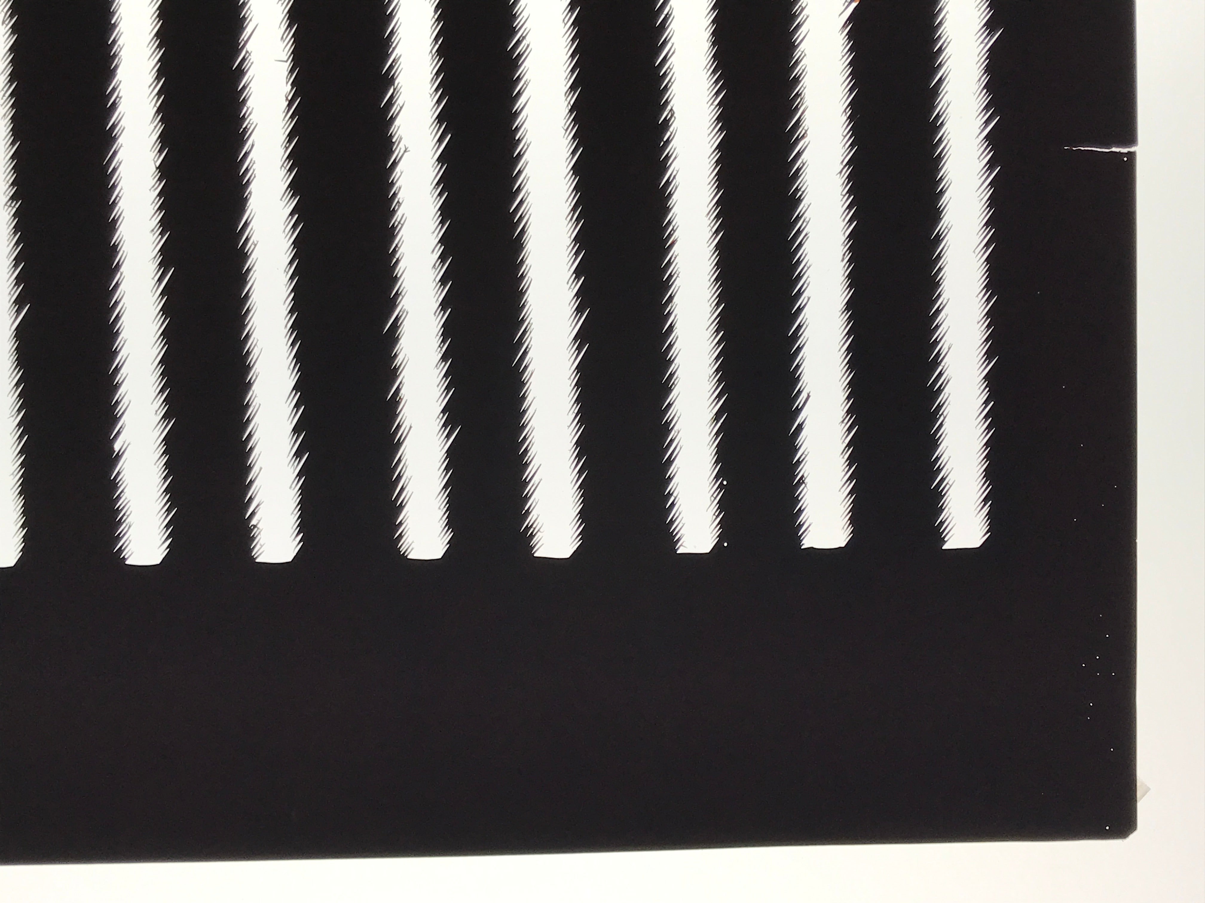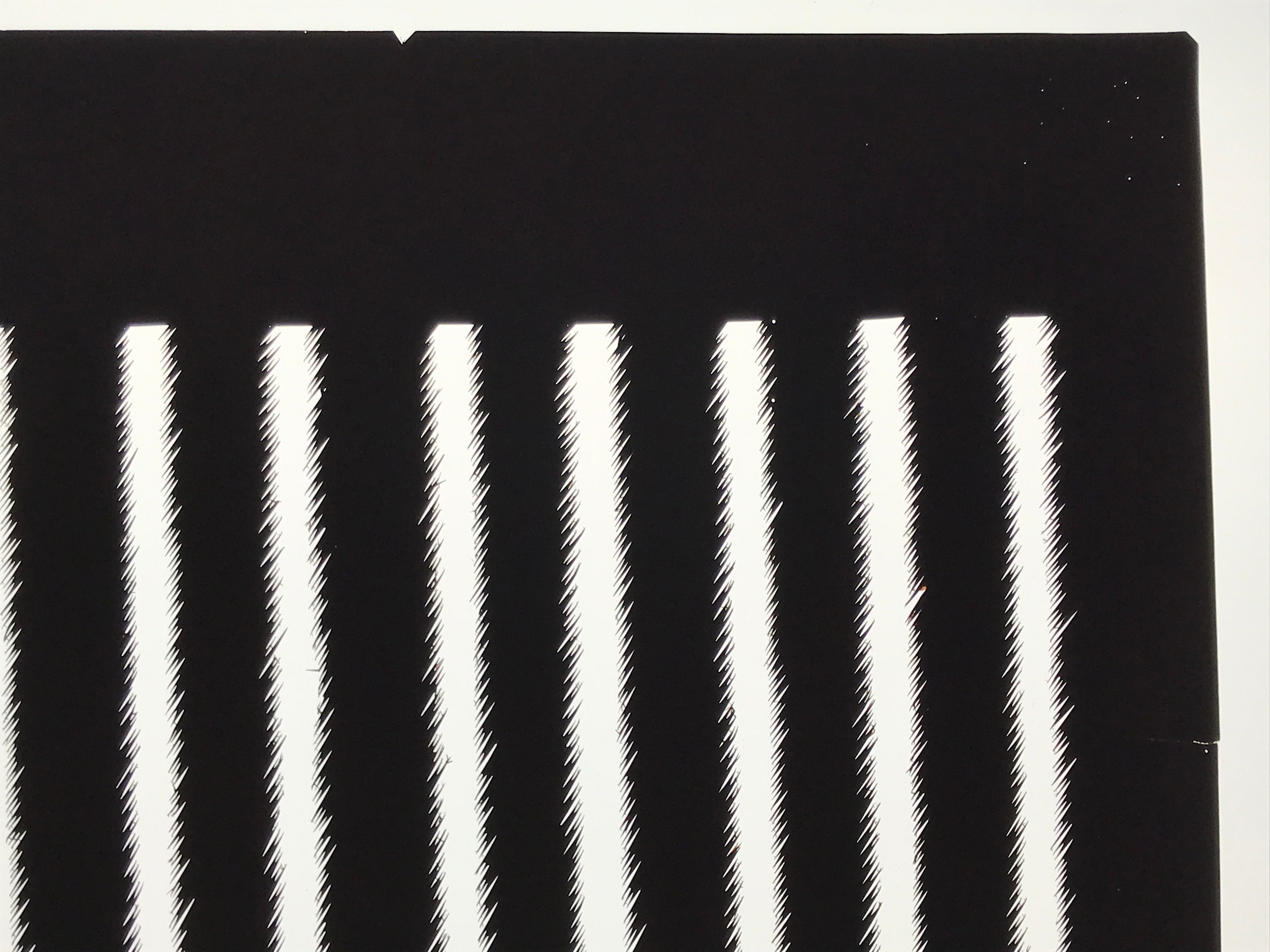 Using traditional mulberry paper, this katagami stencil with no silk mesh backing features jagged, wide, vertical striped lines.