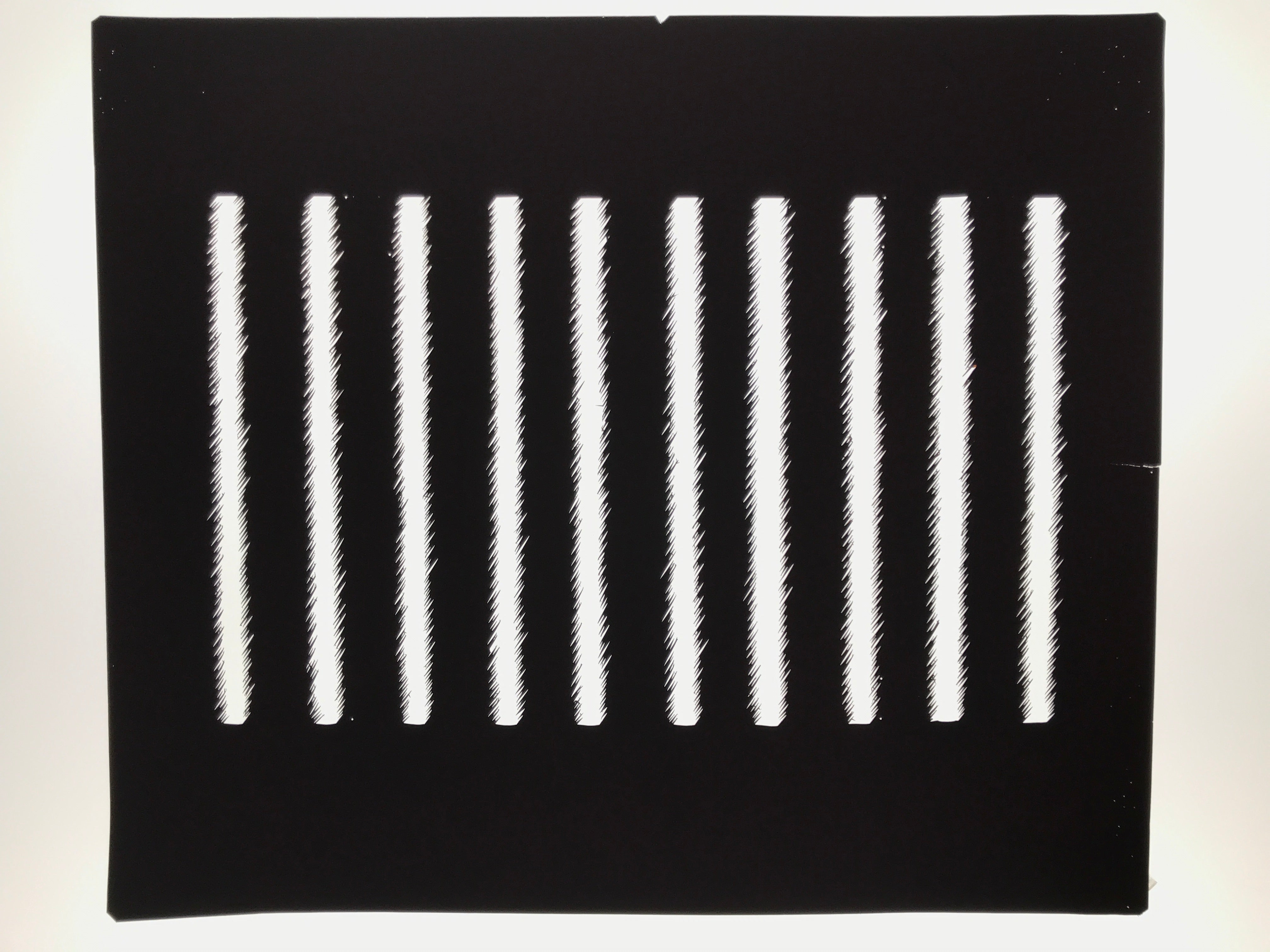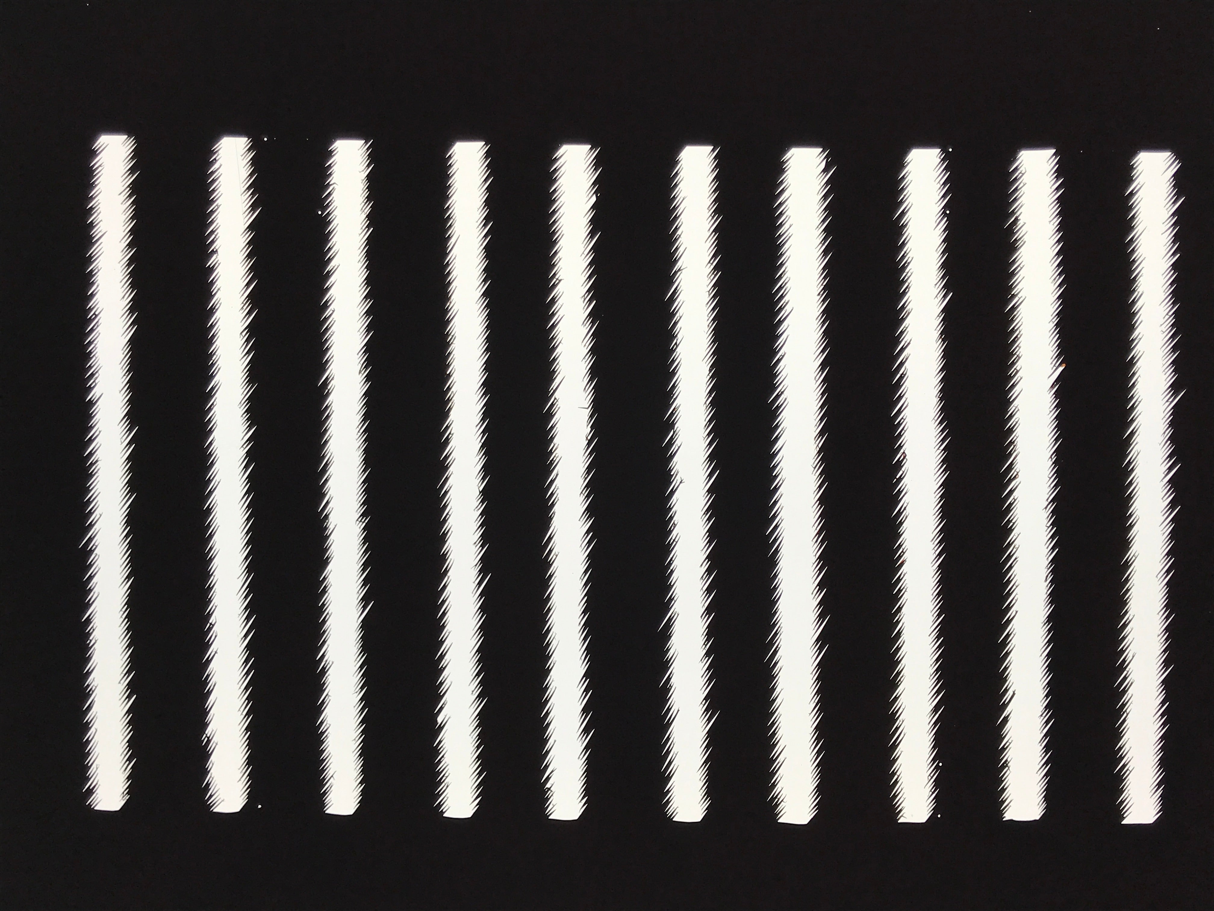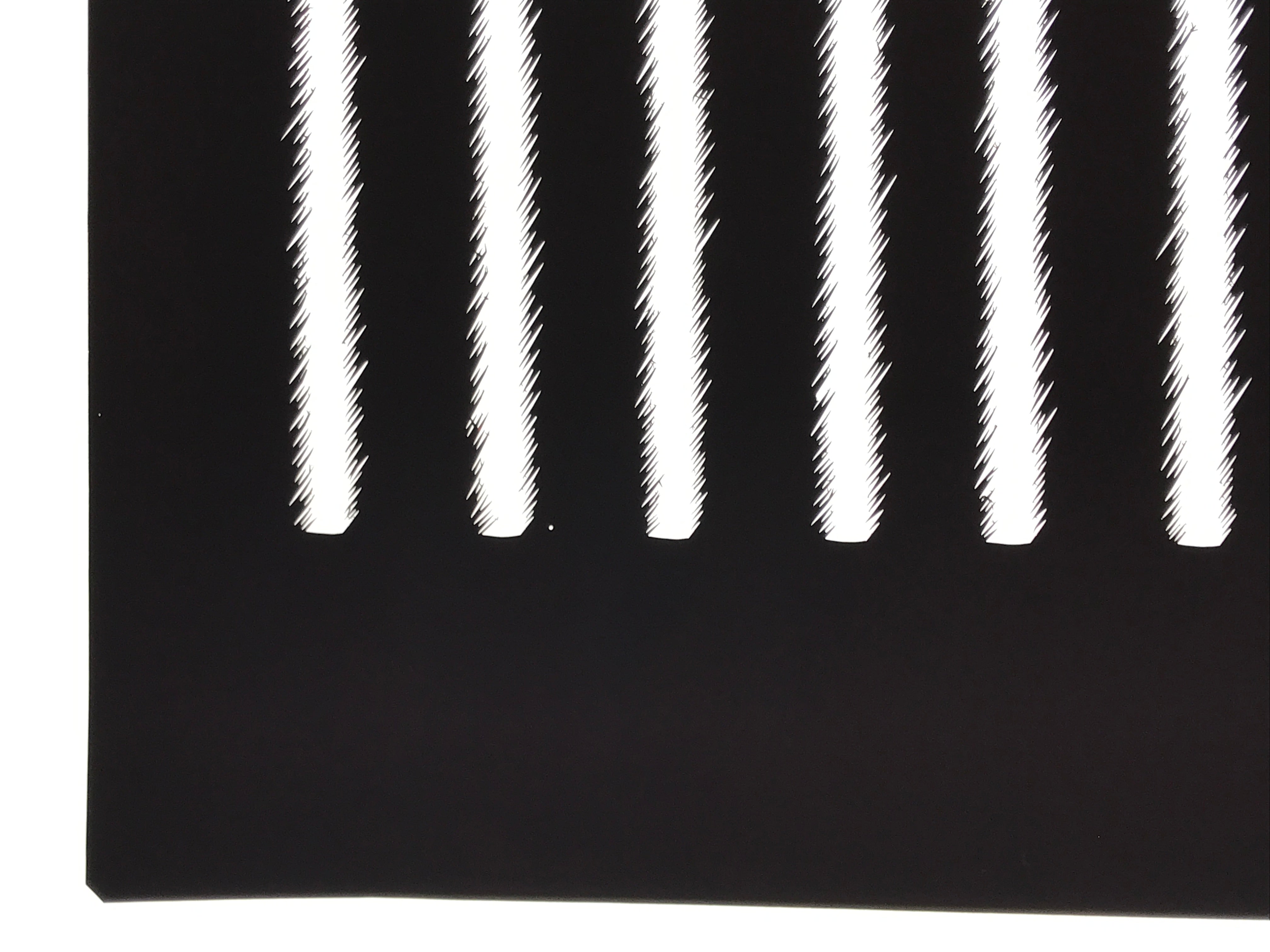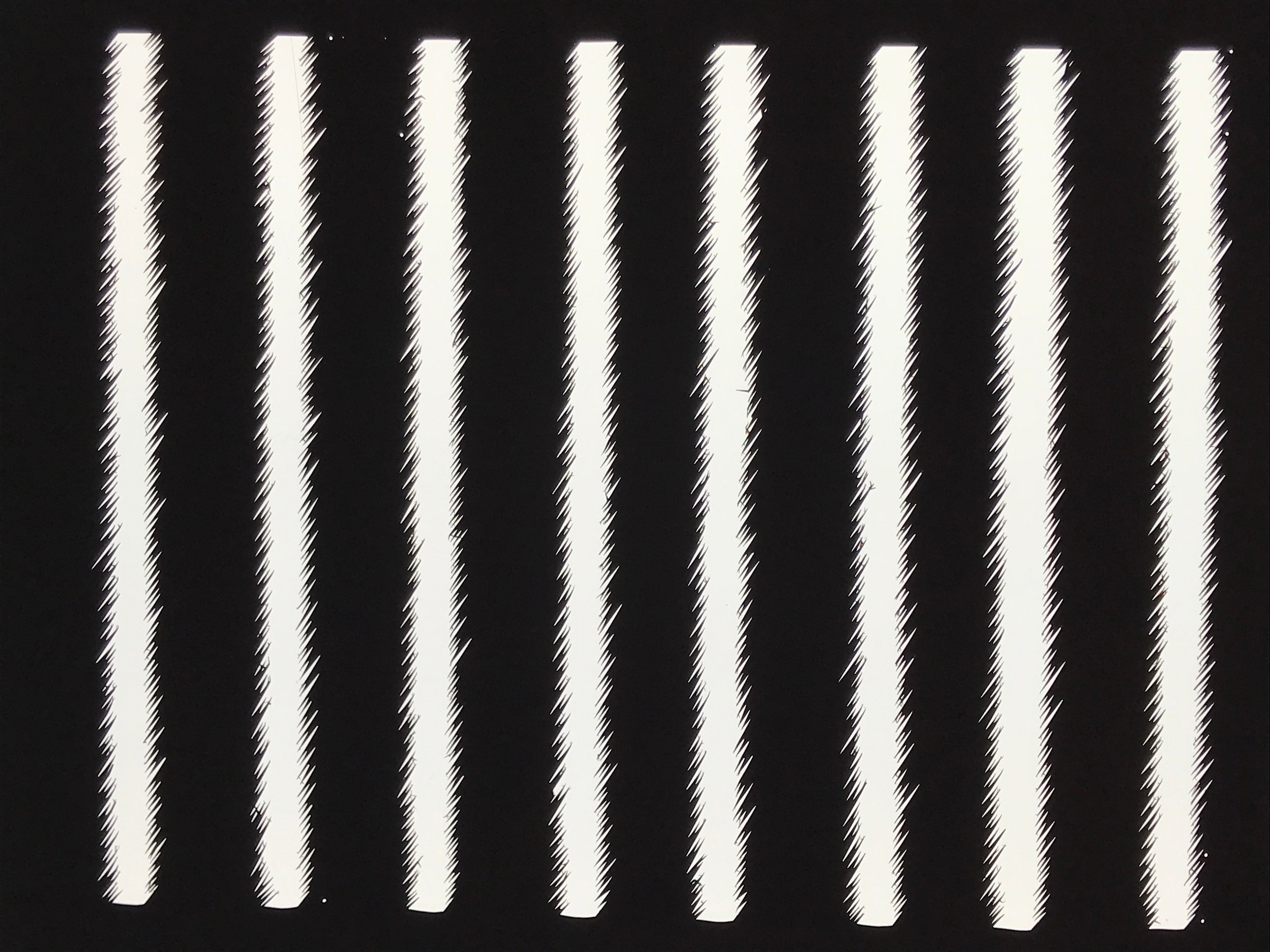 Using traditional mulberry paper, this katagami stencil with no silk mesh backing features jagged, wide, vertical striped lines.