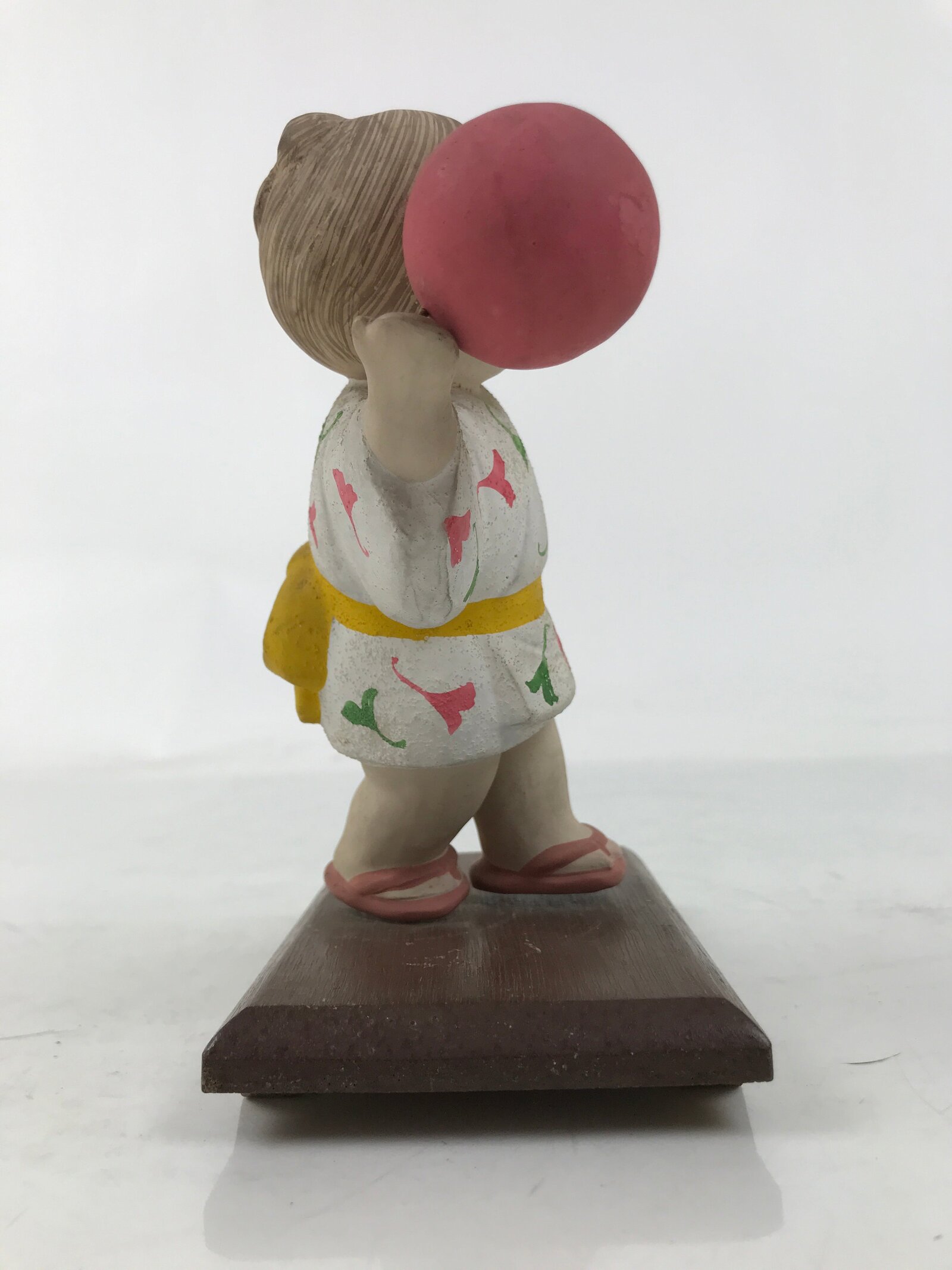 This vintage Japanese decorative figurine represents a child playing with a pink ball. The child is wearing a painted white jinbei kimono with pink and green ginkgo leaves. The figurine is attached to a wooden stand.