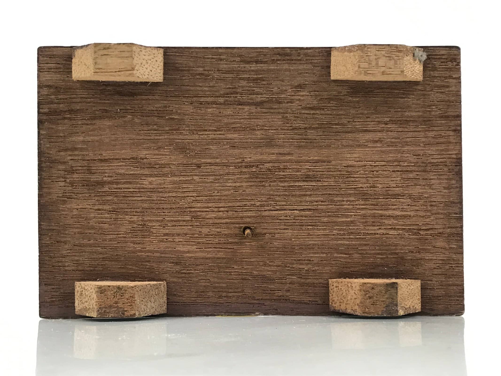 - Good condition considering age. Some marks and some stains. The clay figurine can rotate on the axis it’s attached to the base. Scratches on wood base. Wear and tear due to age. Please see the photos carefully.