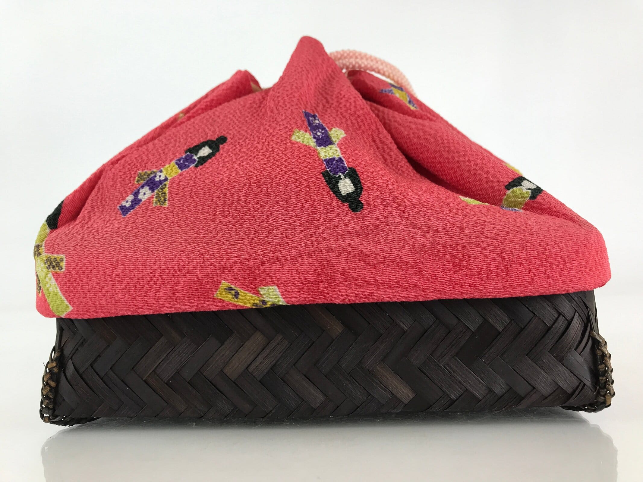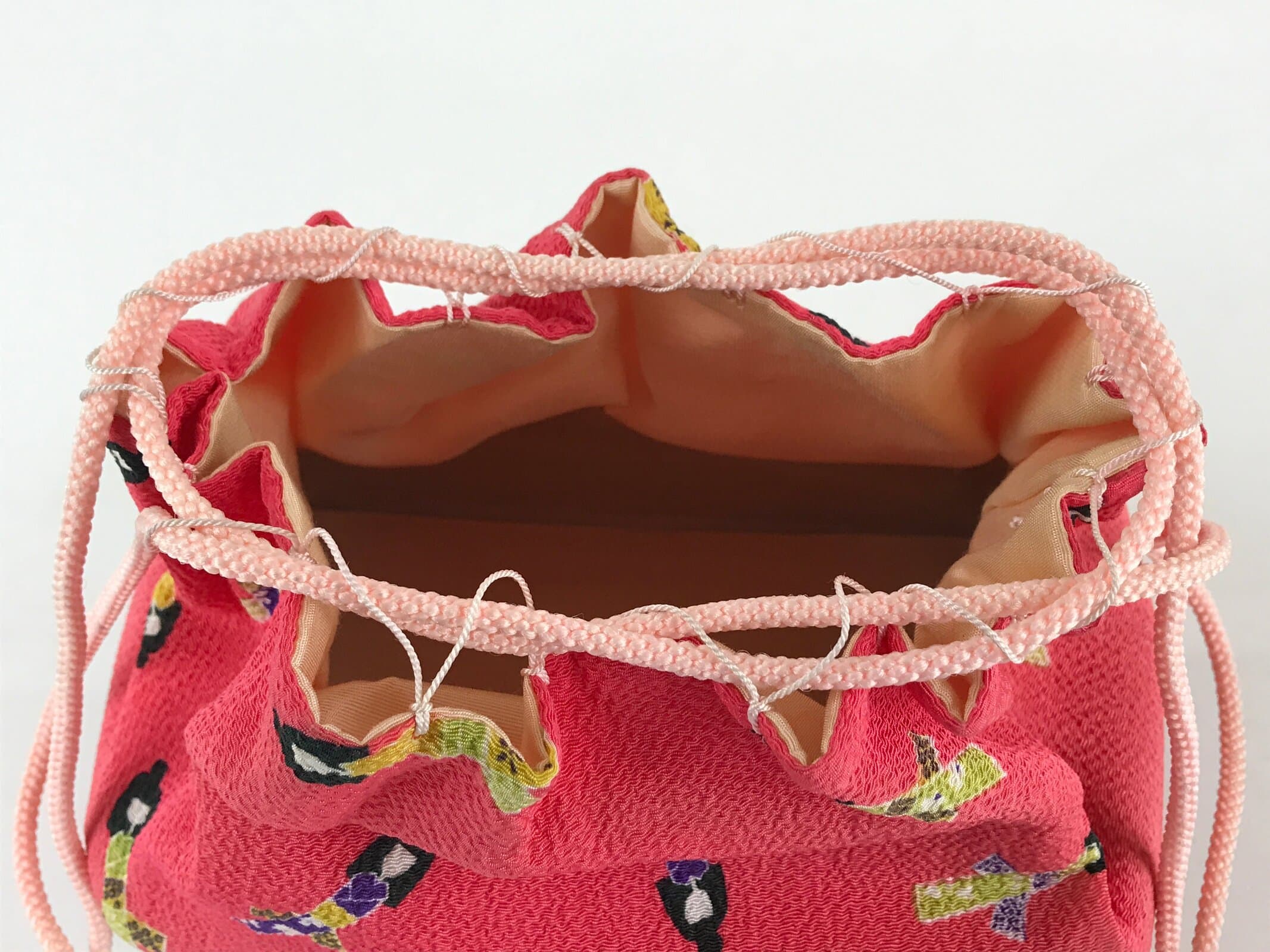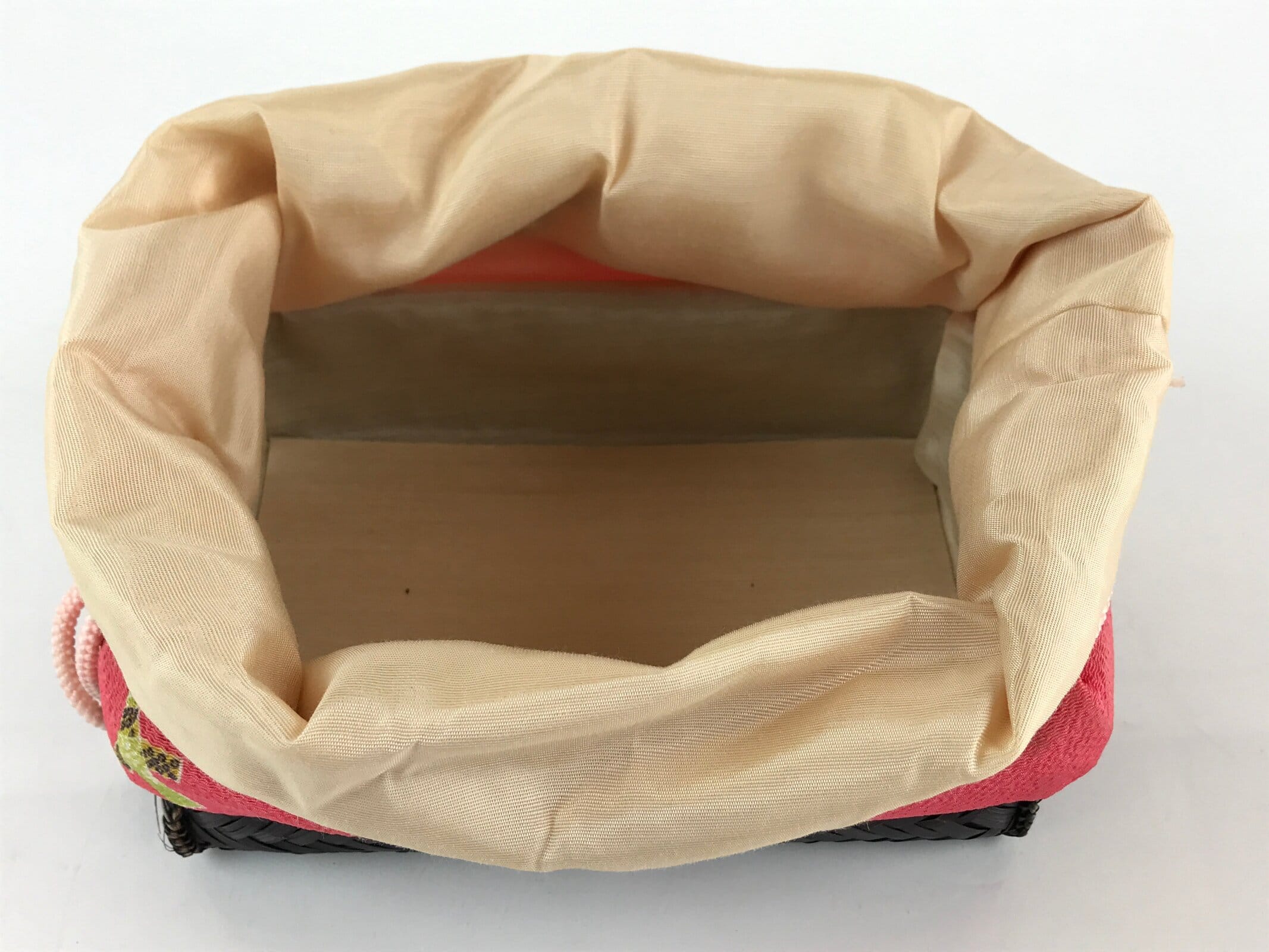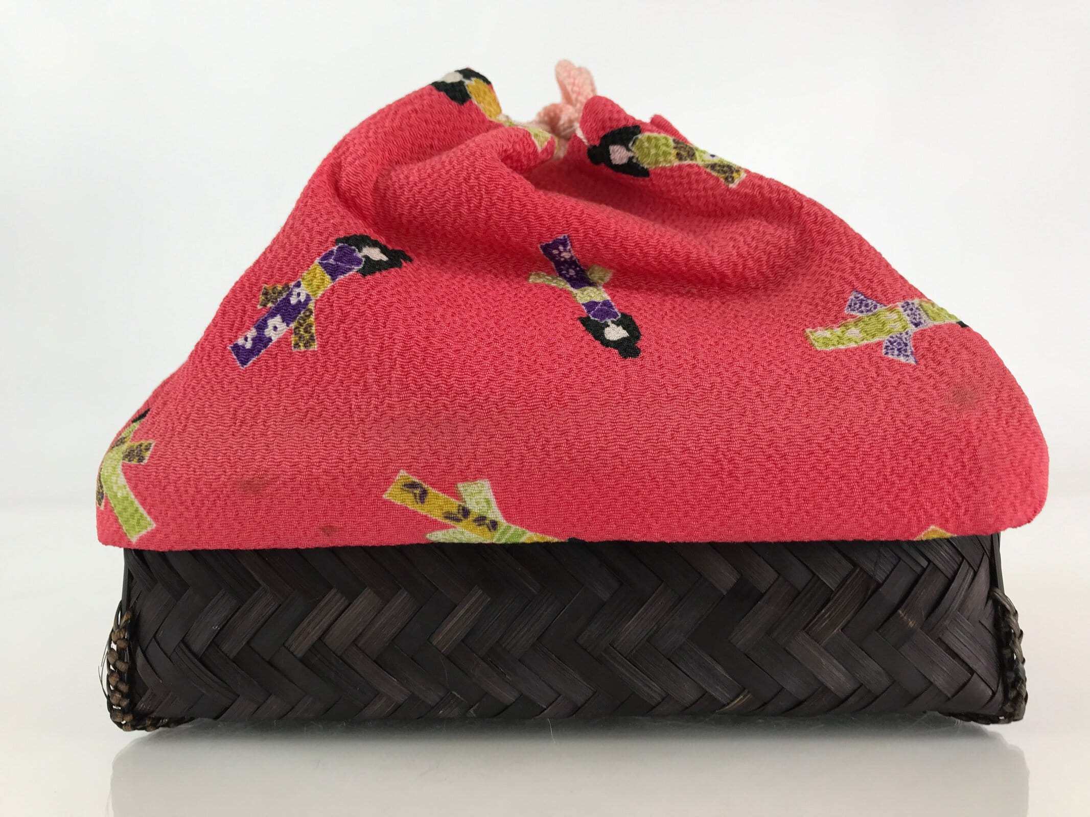 Japanese Kimono Cloth Bamboo Drawstring Bag Vtg Pouch Kago Kinchaku-Bukuro KB55