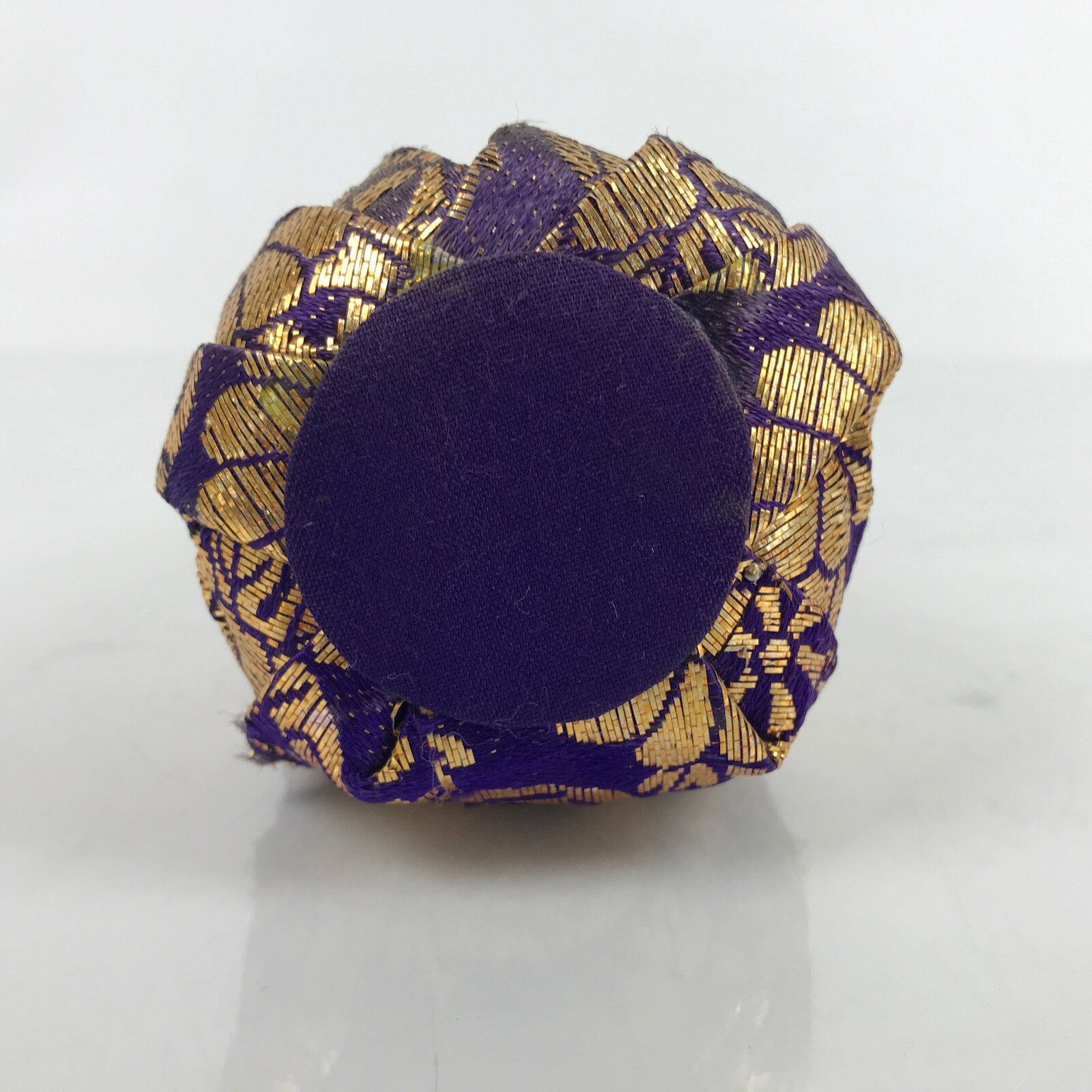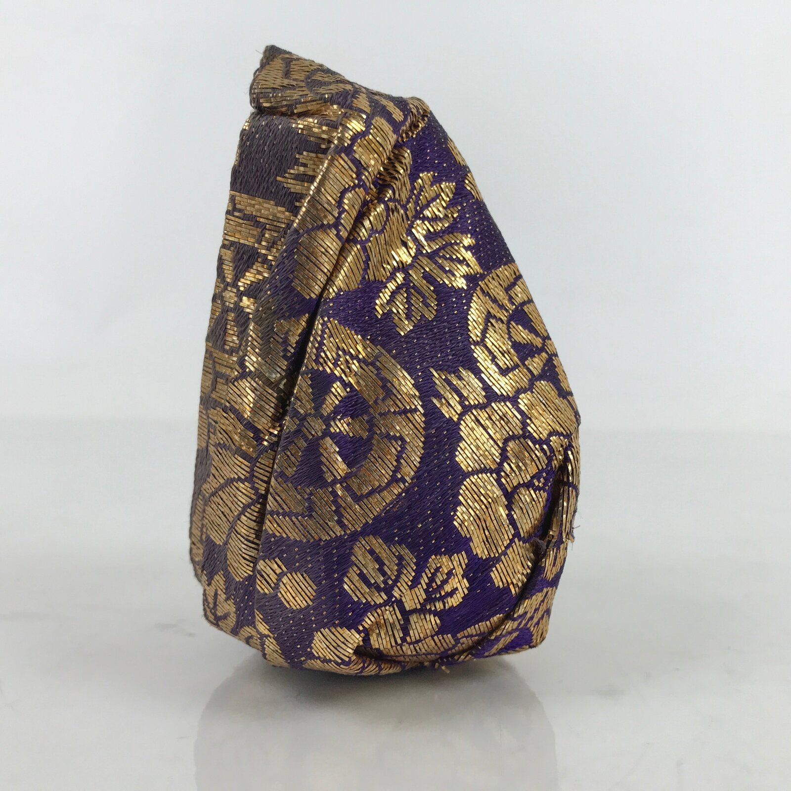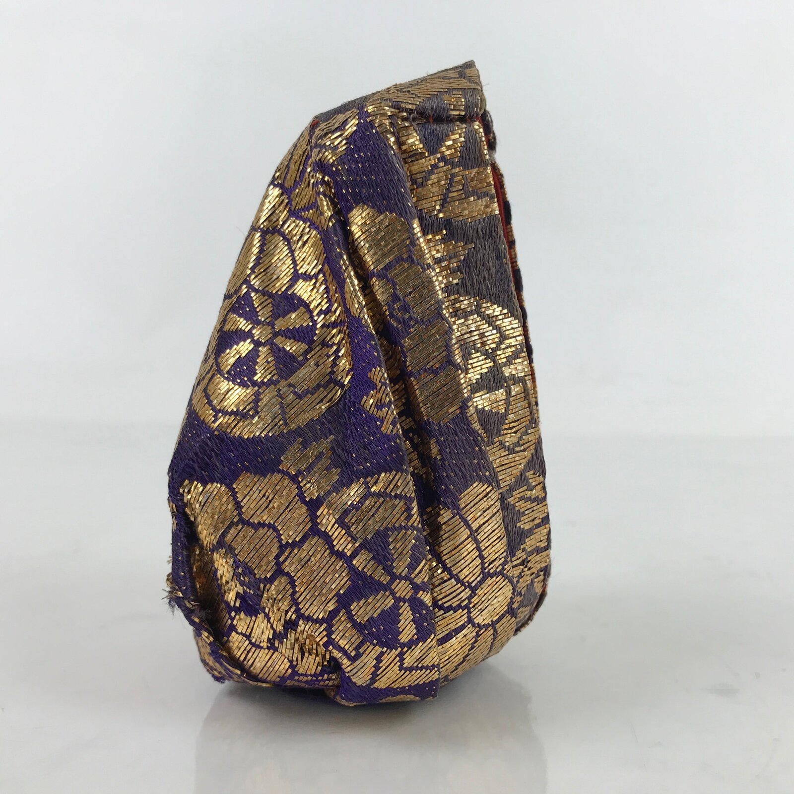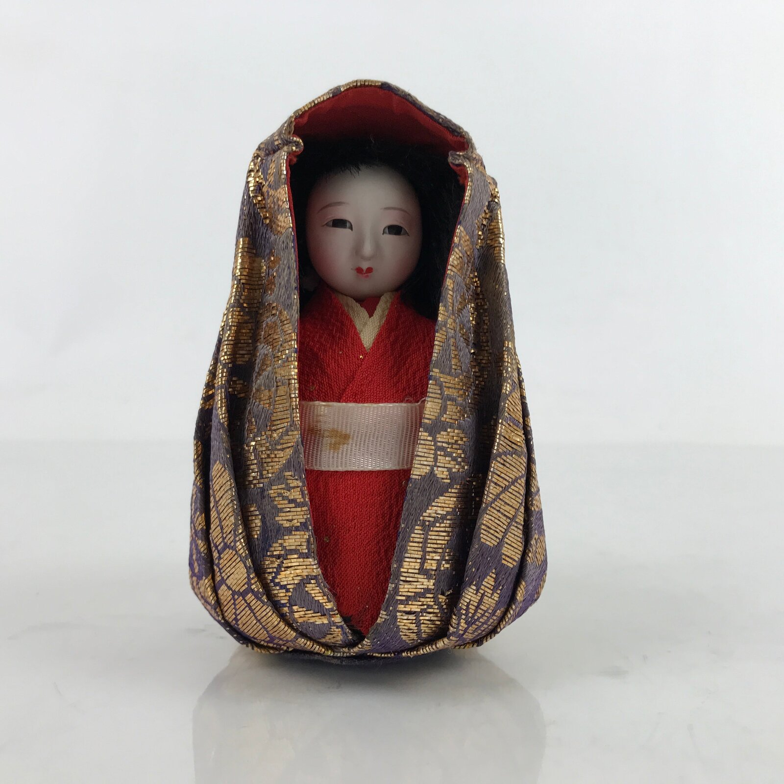 This vintage Japanese daruma kimono Hina doll is wearing a layered red kimono. The doll is wrapped in a purple and gold kimono. This type of dolls is called daruma dolls. It is weighted at the bottom so that the doll stays up.
