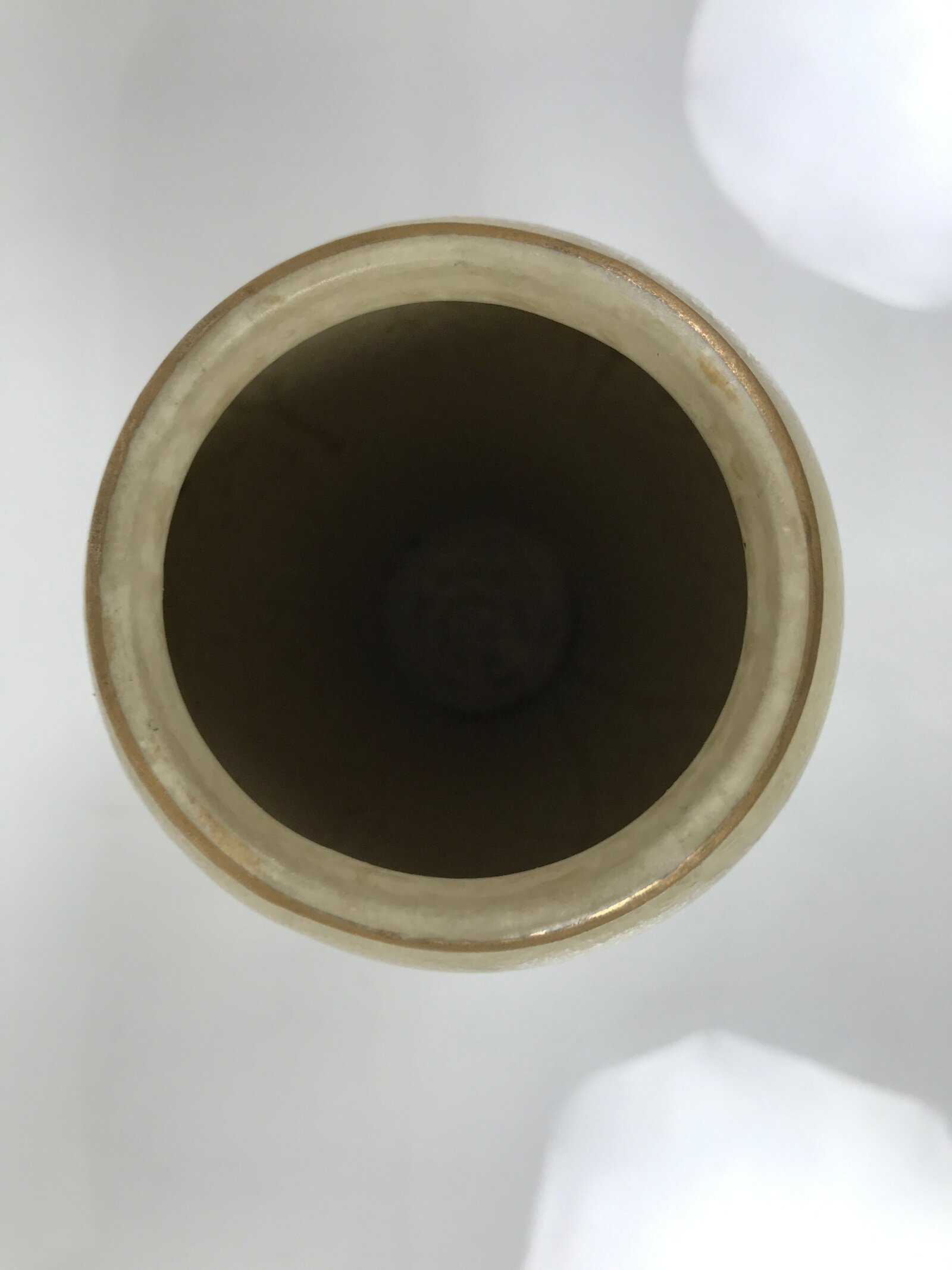 This is a vintage Japanese ceramic flower vase, or kabin. This vase is pale yellow, which is a characteristic color of Kiseto ware. It has a plum blossom design with golden branches and pink blossoms. There is a golden line on the rim as well. Its cylindrical shape gets thinner toward the bottom. It can be used for all types of flower arrangements both ikebana and casual and also as a statement piece to decorate your entrance.