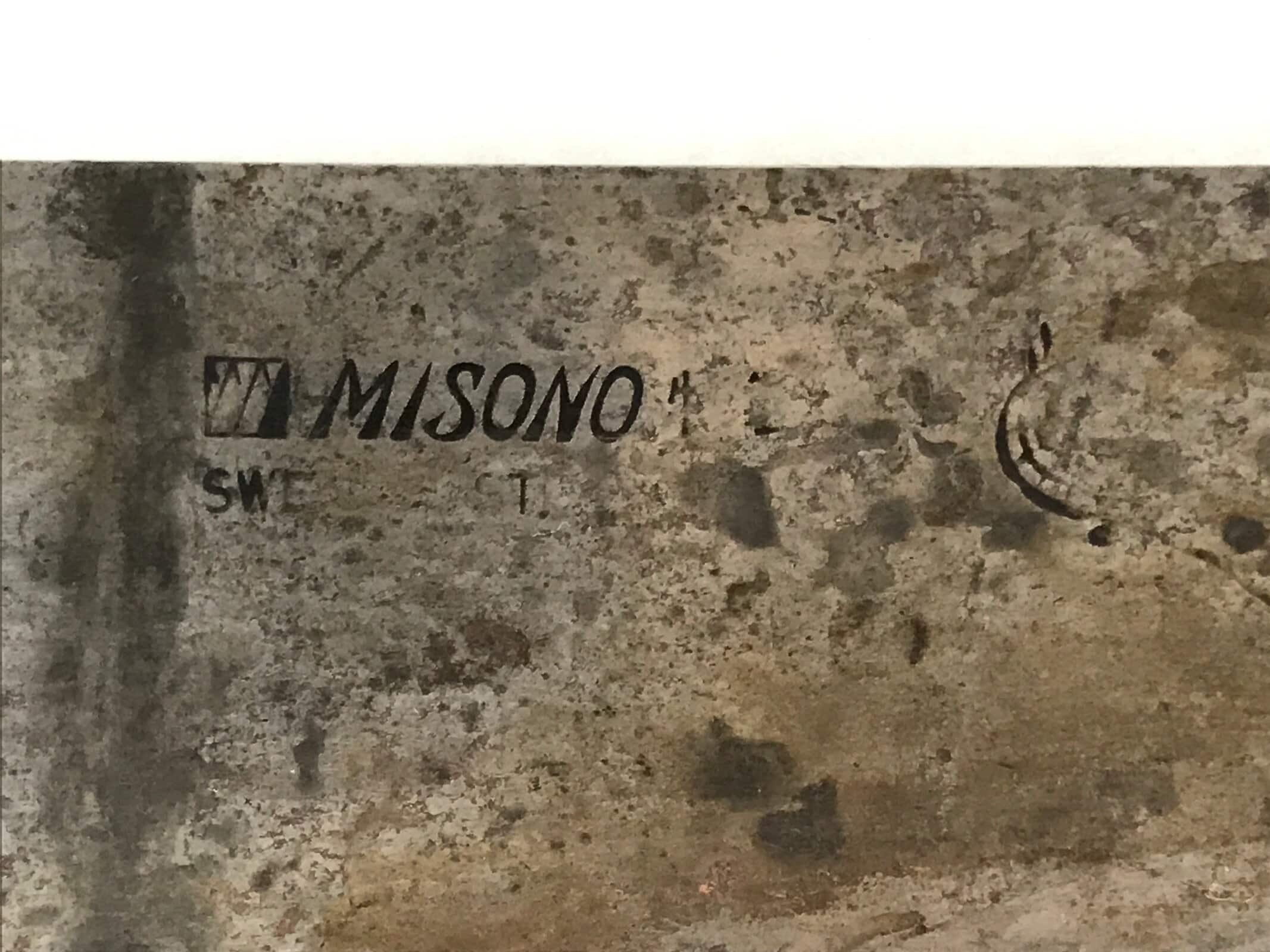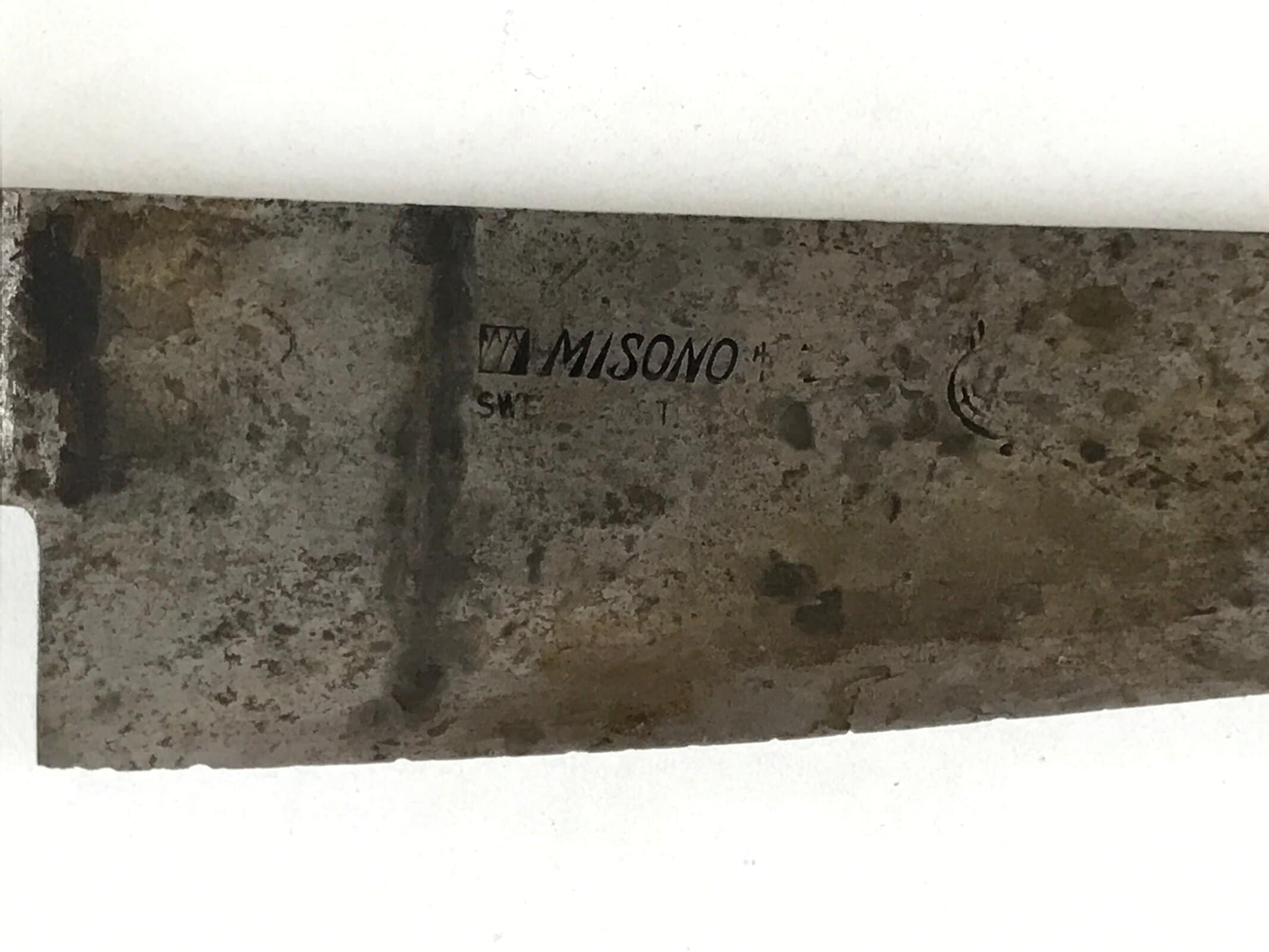 This is a Japanese vintage kitchen knife. It has a steel blade and a wooden handle. The blade has inscriptions on one side: MISONO. There are numbers on the other side. The handle has a brown color. This kitchen knife is single-edged, the traditional style for Japanese knives.
