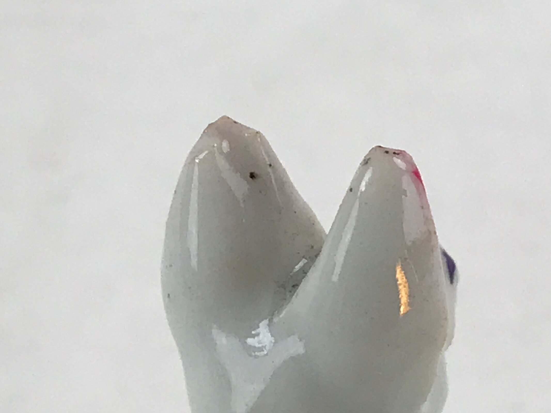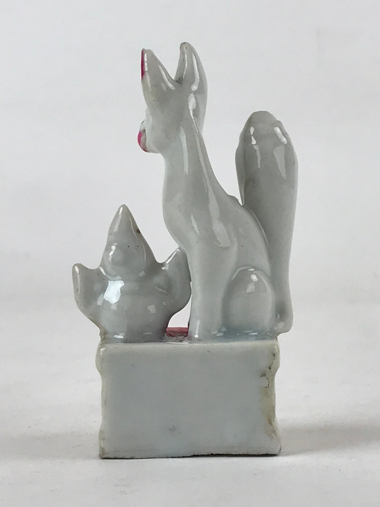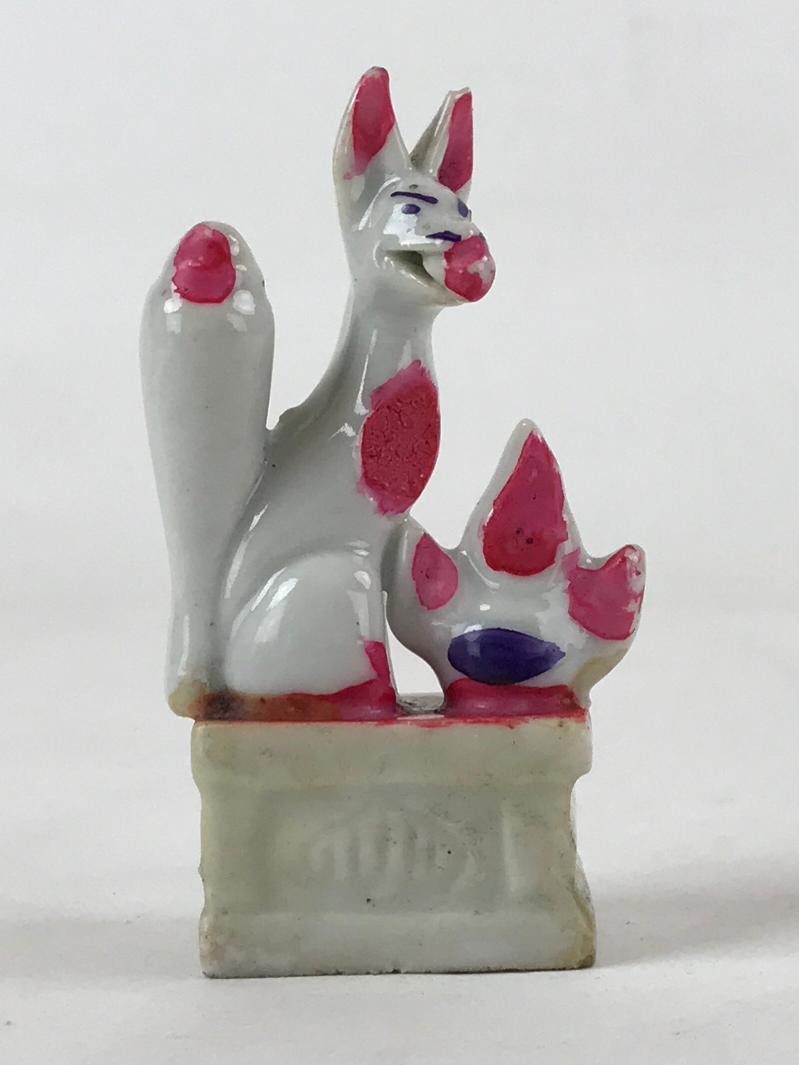 This is a vintage Japanese ceramic figurine of a white fox, kitsune, representing the Shinto God Inari. The sitting fox has its head turned to the observer. This figurine is white with pinkish red and purple details. It is a compact figurine, easily fitting any desk or shelf.