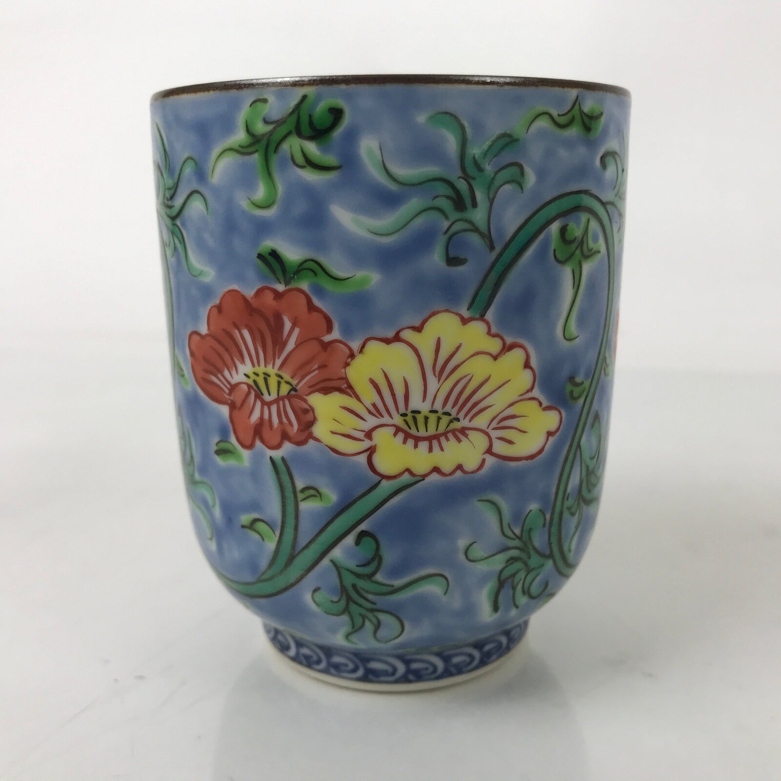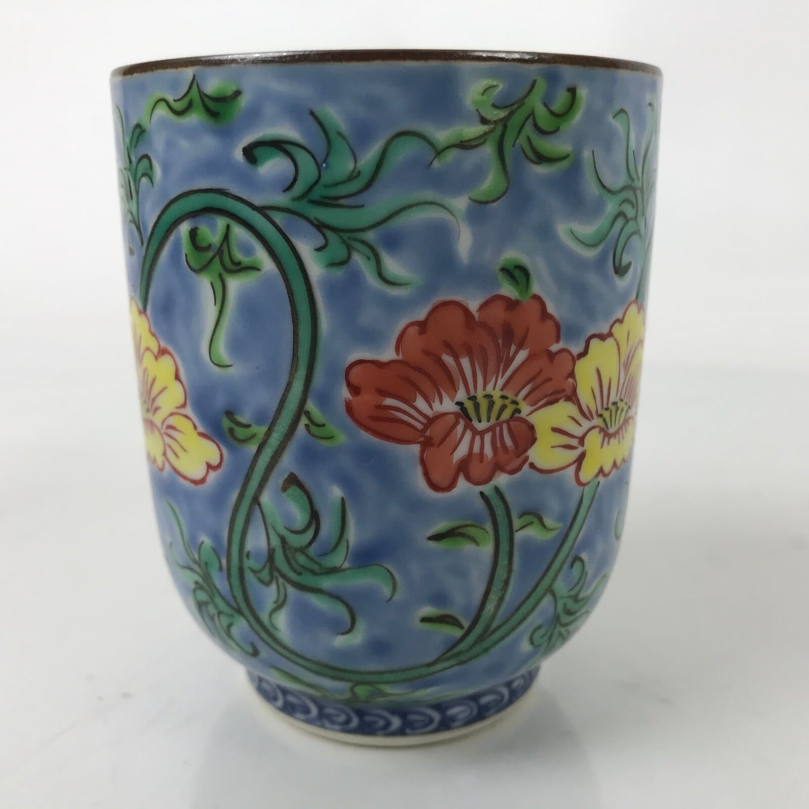 This vintage Japanese Kiyomizu ware (Kyo ware) porcelain teacup features a colorful design with big flowers, likely peony flowers. The inside of the cup is white, with a blue geometric pattern on the upper part.