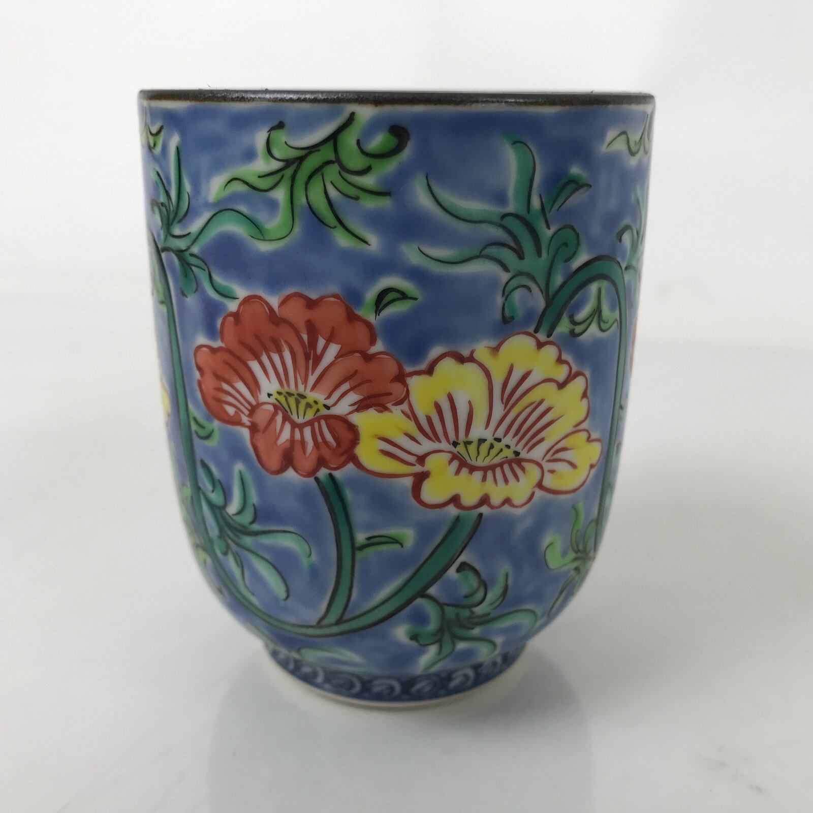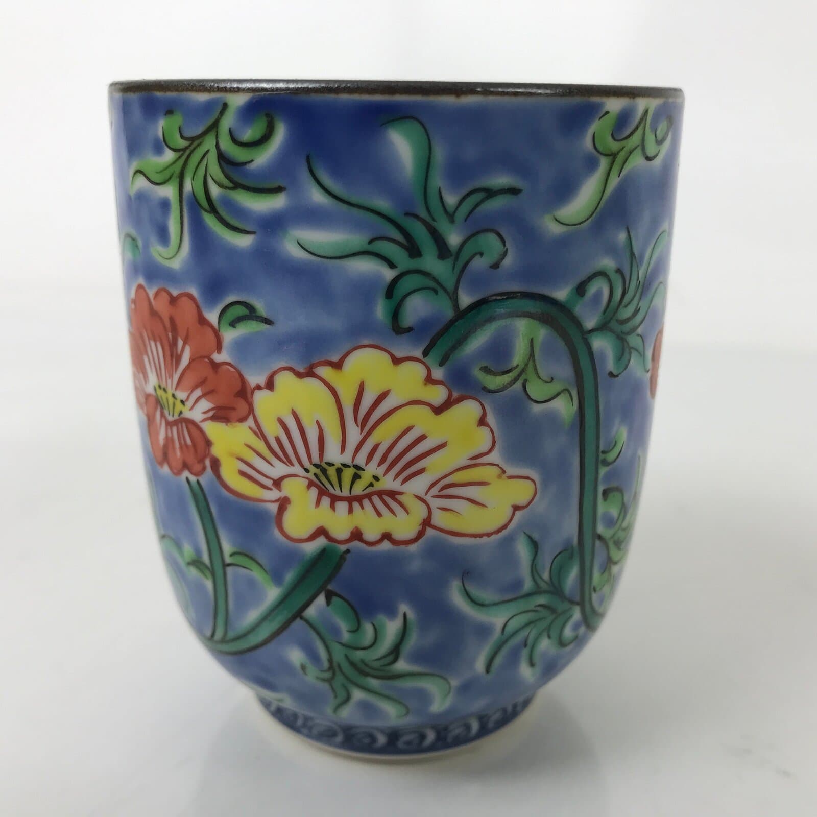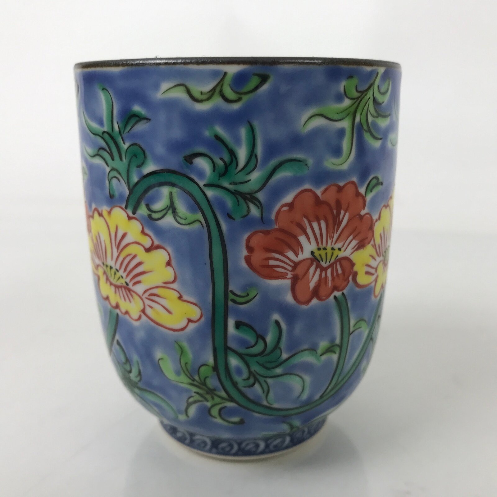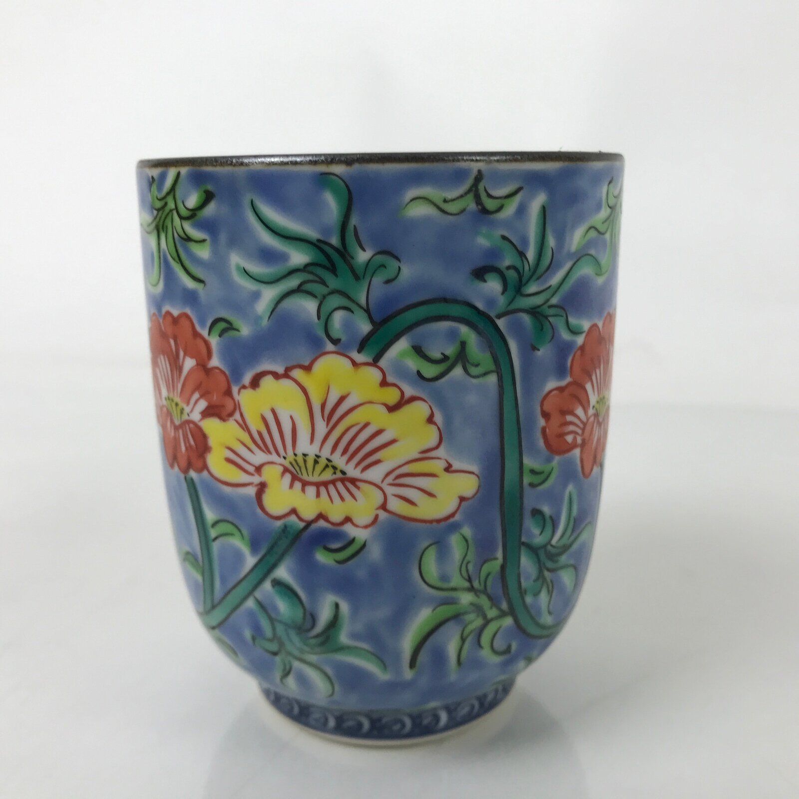 This vintage Japanese Kiyomizu ware (Kyo ware) porcelain teacup features a colorful design with big flowers, likely peony flowers. The inside of the cup is white, with a blue geometric pattern on the upper part.