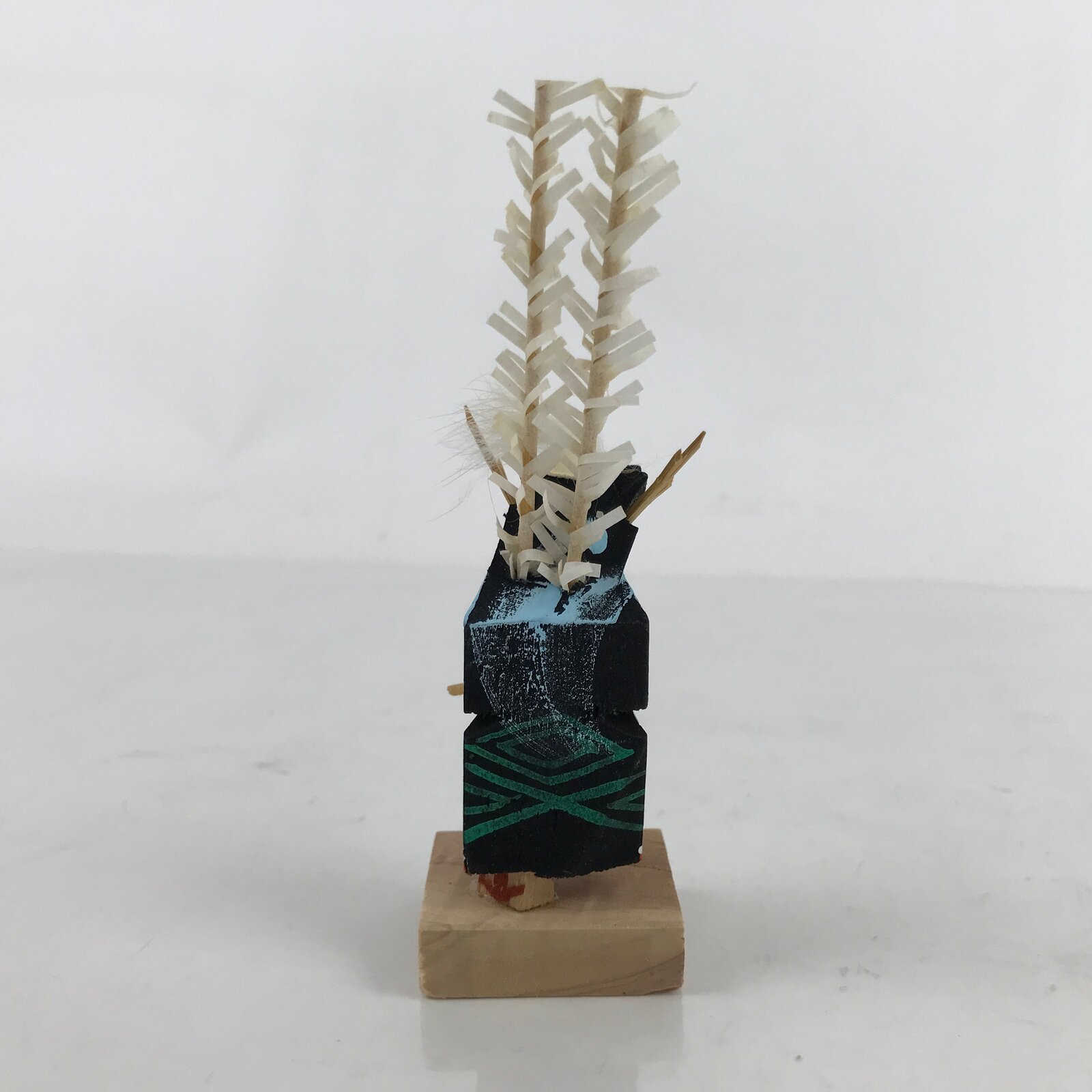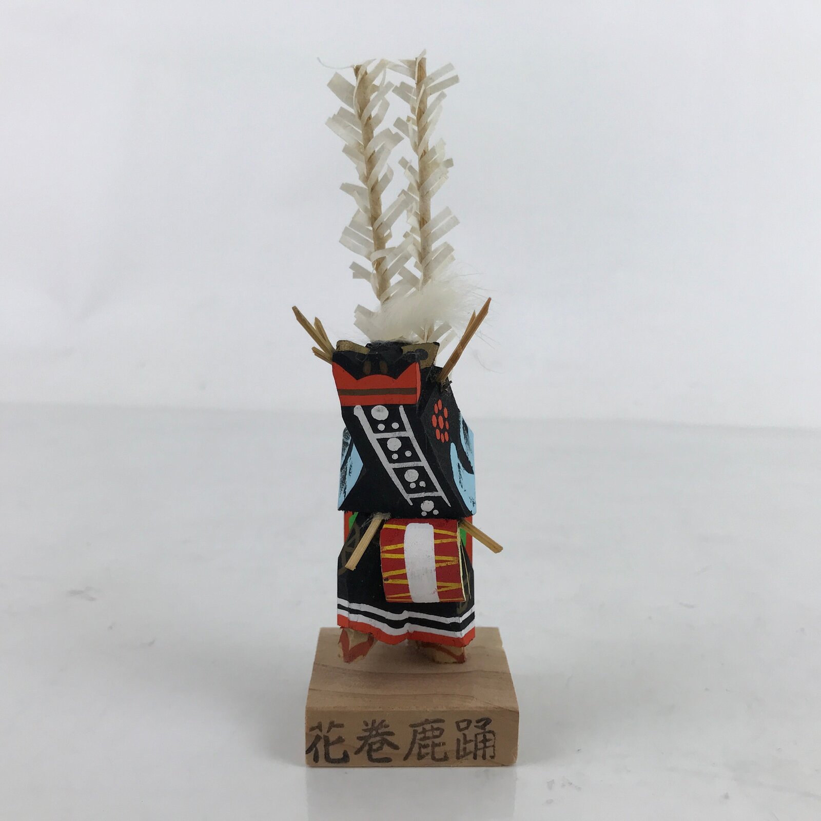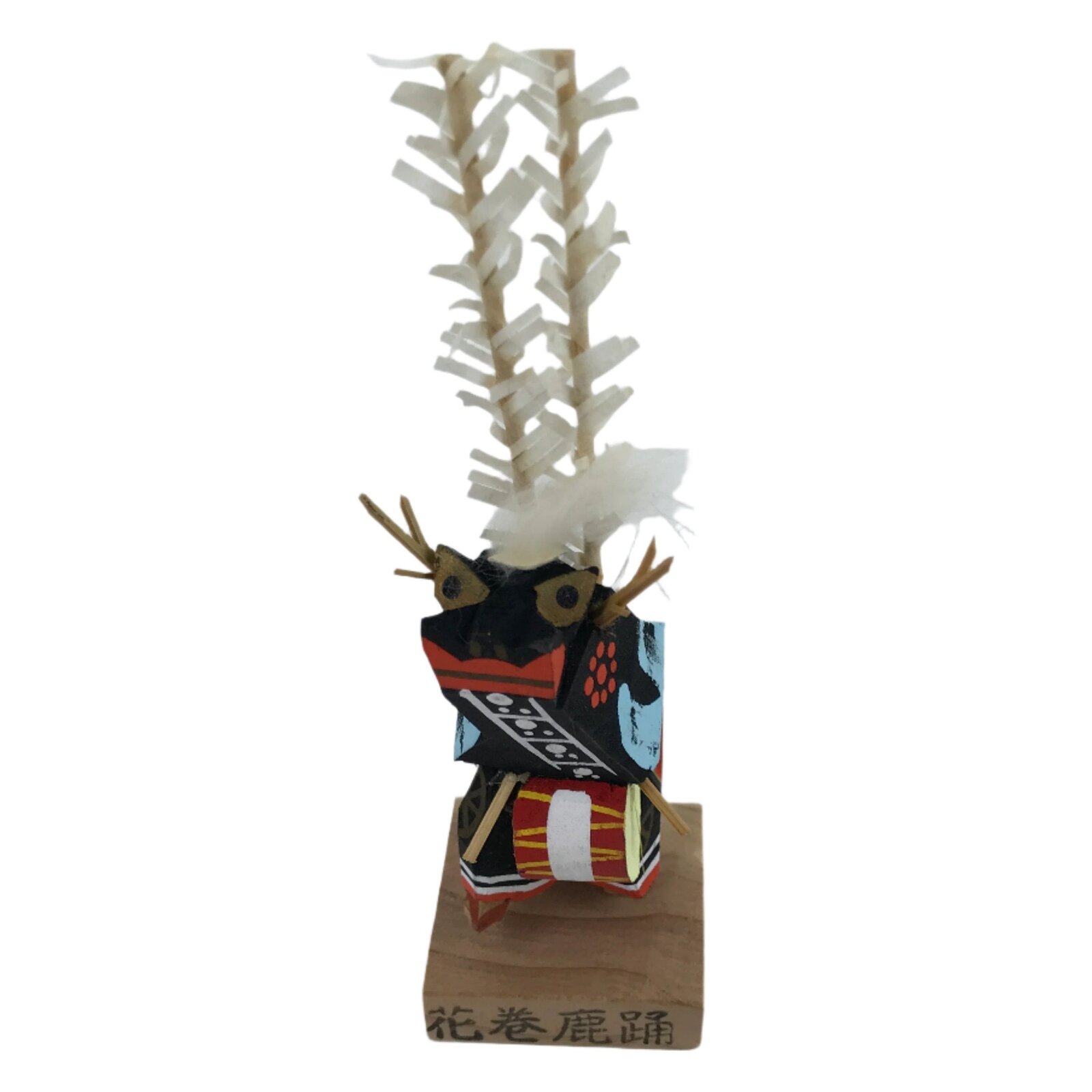 This vintage Japanese wooden kokeshi doll figurine represents a performer of the Shishi Odori, a regional folk performing art from Hanamaki (Iwate prefecture). Their costume consists of a black and blue cape, and a black mask of a deer, similar to a lion dance’s mask. The performer is playing the drums while dancing. The doll comes in a paper box. Kokeshi dolls are traditional toys that can easily be used for decorative purposes.