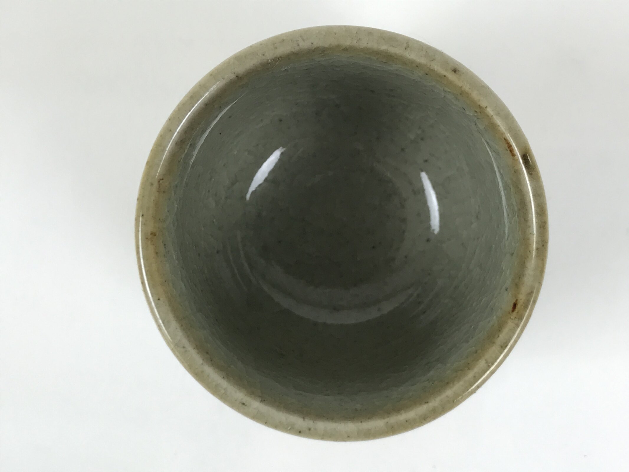 This is a vintage Japanese Kutani ceramic sake cup. This particular type of cup is called tsubomi or “bud type” due to its resemblance to a flower bud. In terms of size, it is also called ochoko. This beautiful imari sake cup is mostly a medium gray color, and features a floral design (chrysanthemum and bellflower) with two birds outlined in a precise gold outline. It has a red Kutani marking on the bottom.