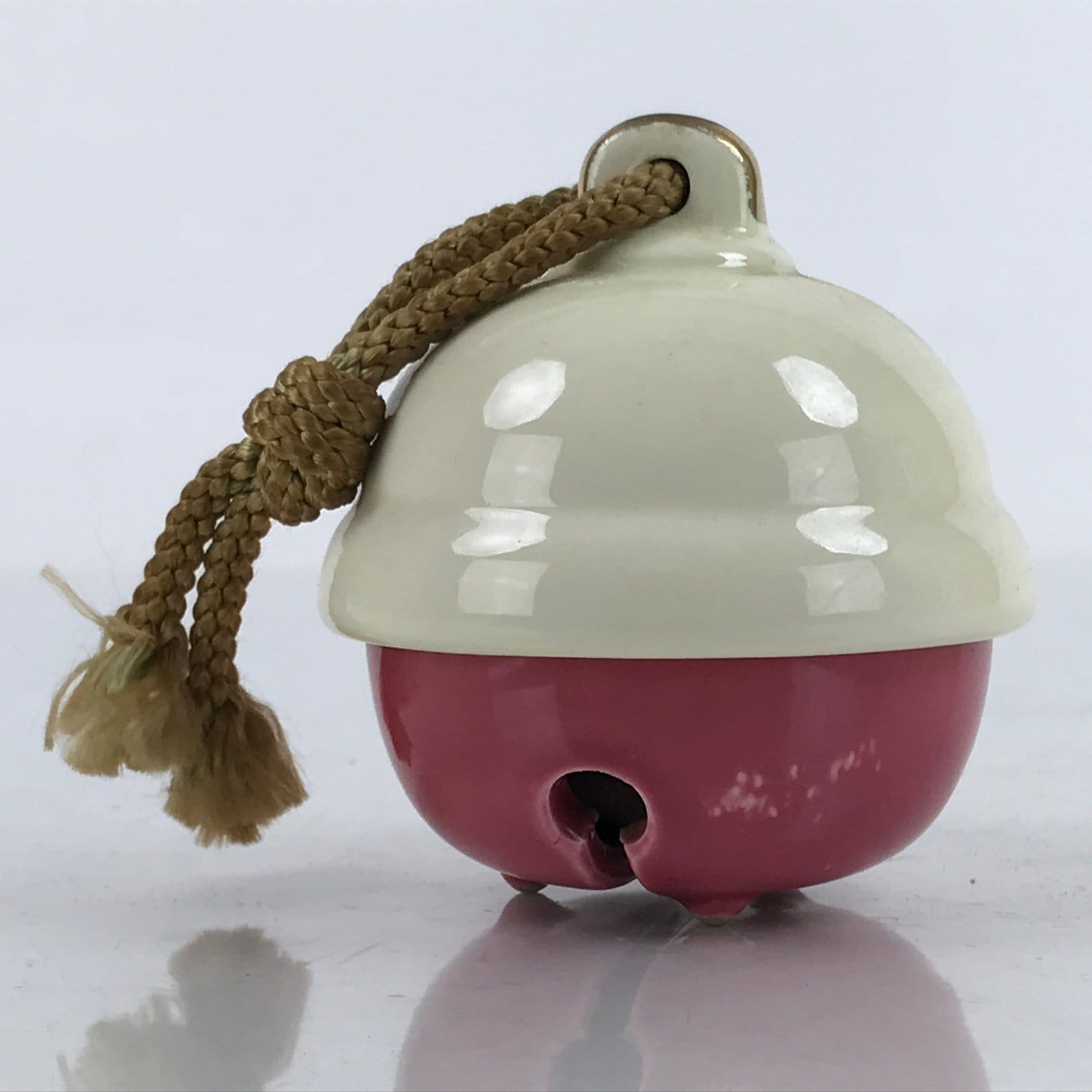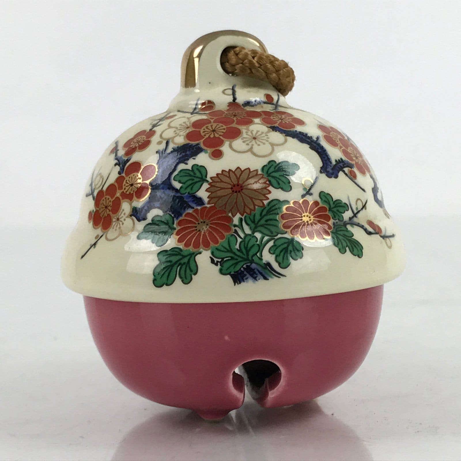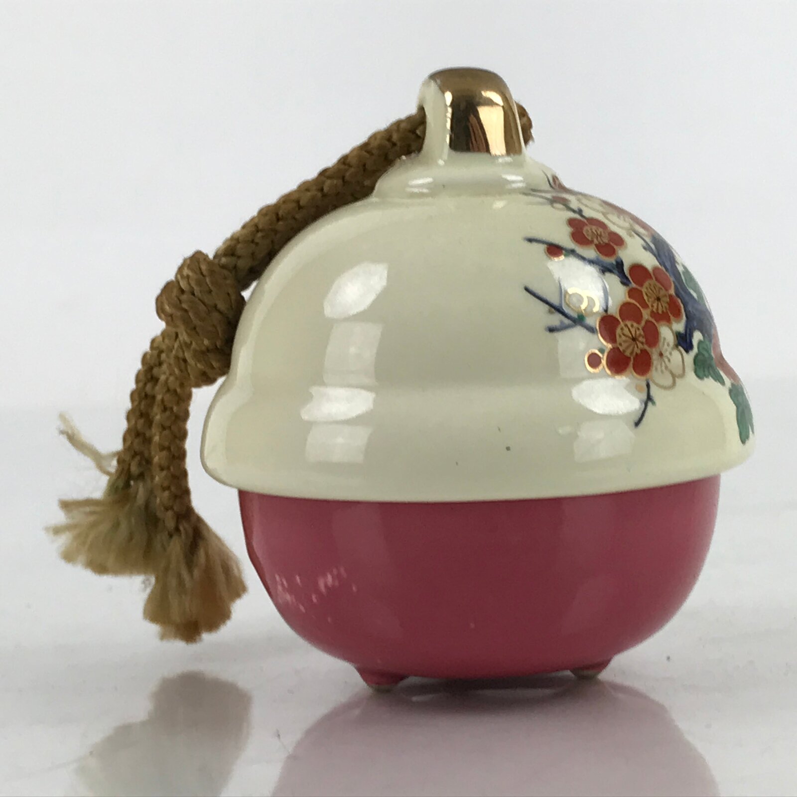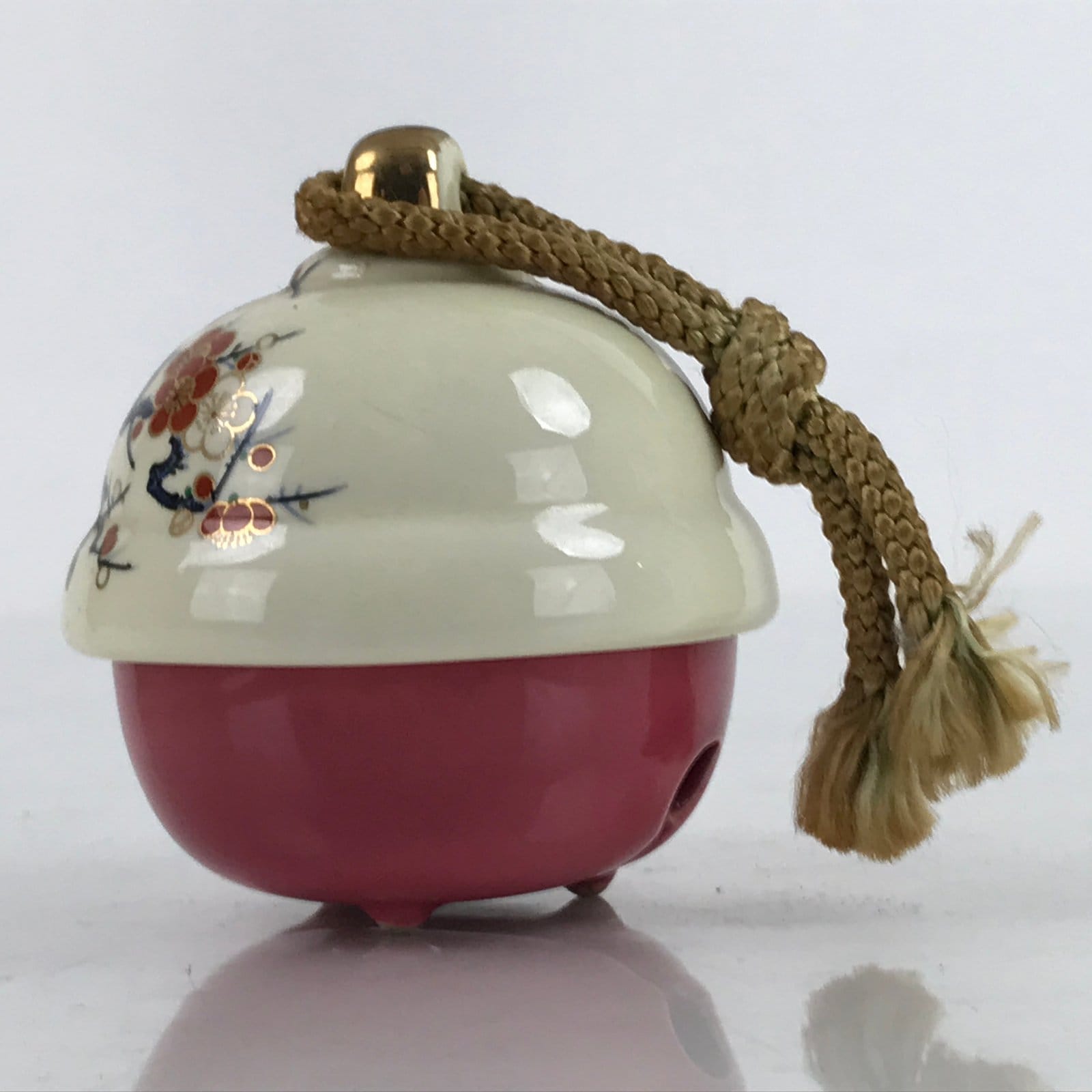This is a vintage Japanese porcelain bell, or dorei. This bell is made of kutani ware porcelain and is shaped like a classic bell in white and pink with painted flowers (plum blossom and chrysanthemum). It has a tan brown braided cord tied to the top loop. There are three small bumps for legs to allow the bell to stand.