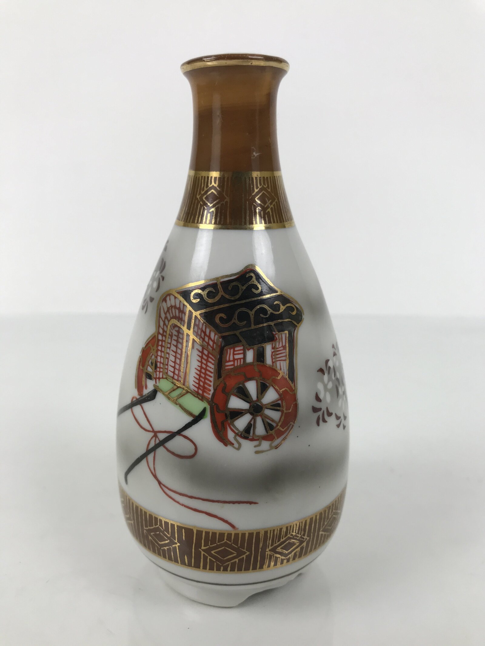 This is a Japanese vintage Kutani porcelain sake bottle or Tokkuri. This beautiful imari sake bottle is fully decorated with hand-painted, intricate gold linework and floral accents. The entire design features a decorated court carriage ox cart, also called gosho guruma. It has the Kutani marking on the bottom.