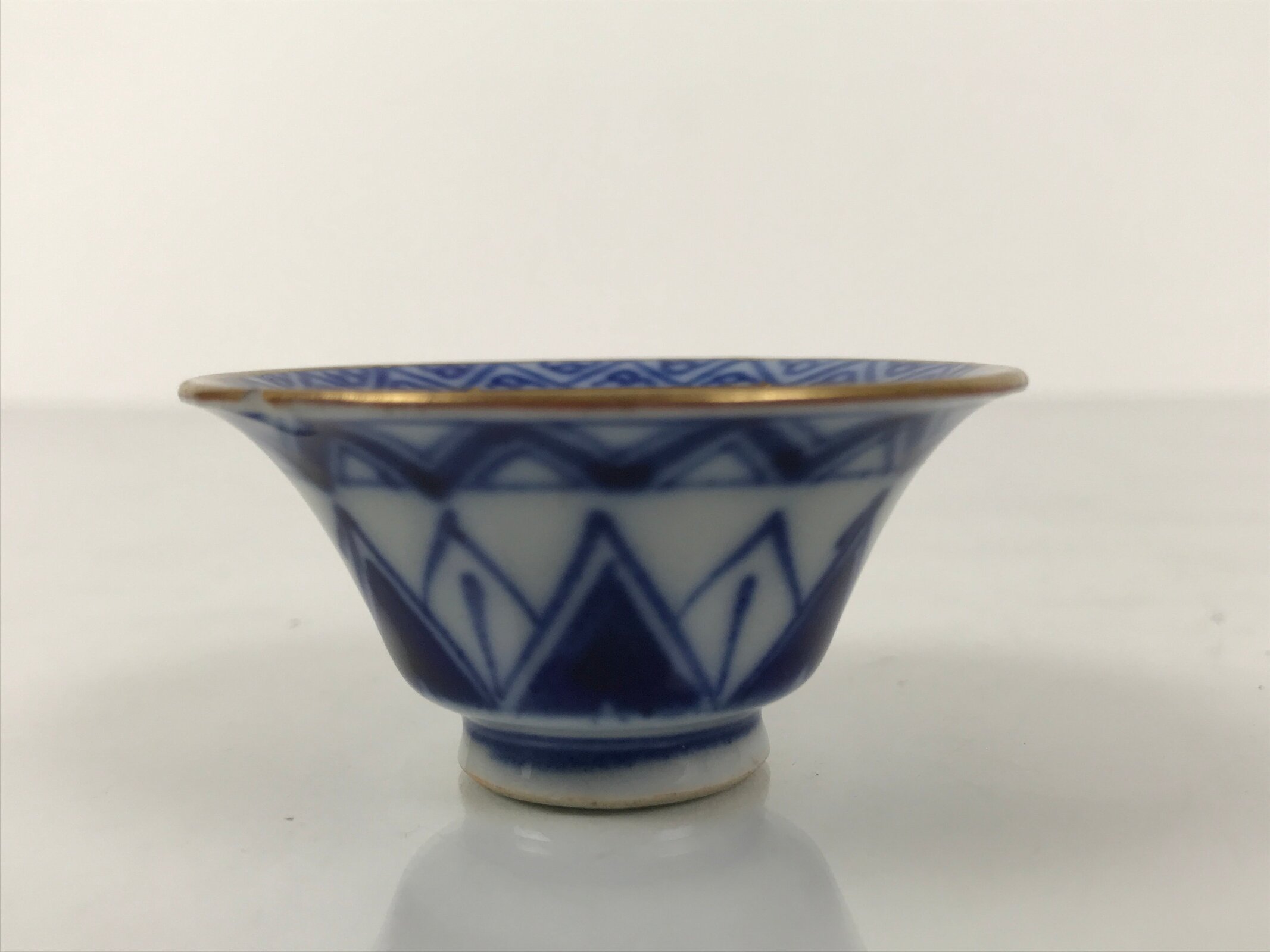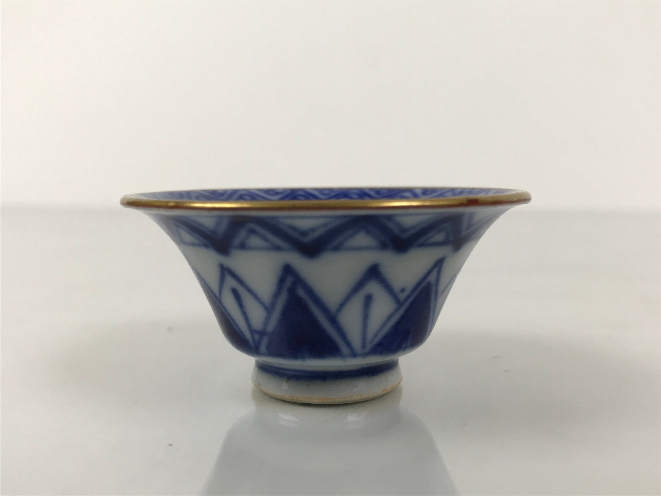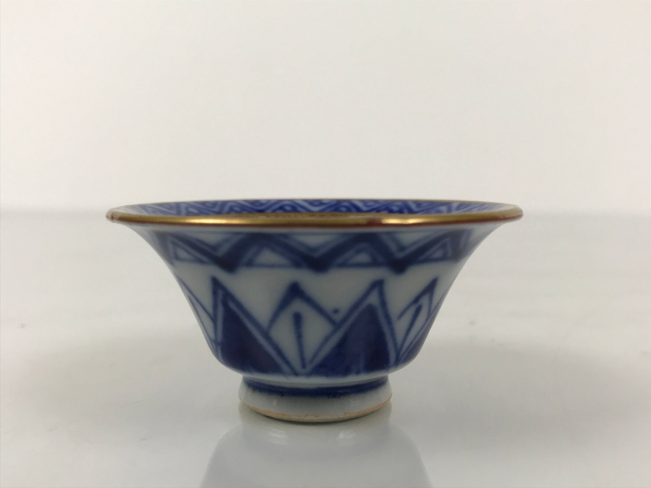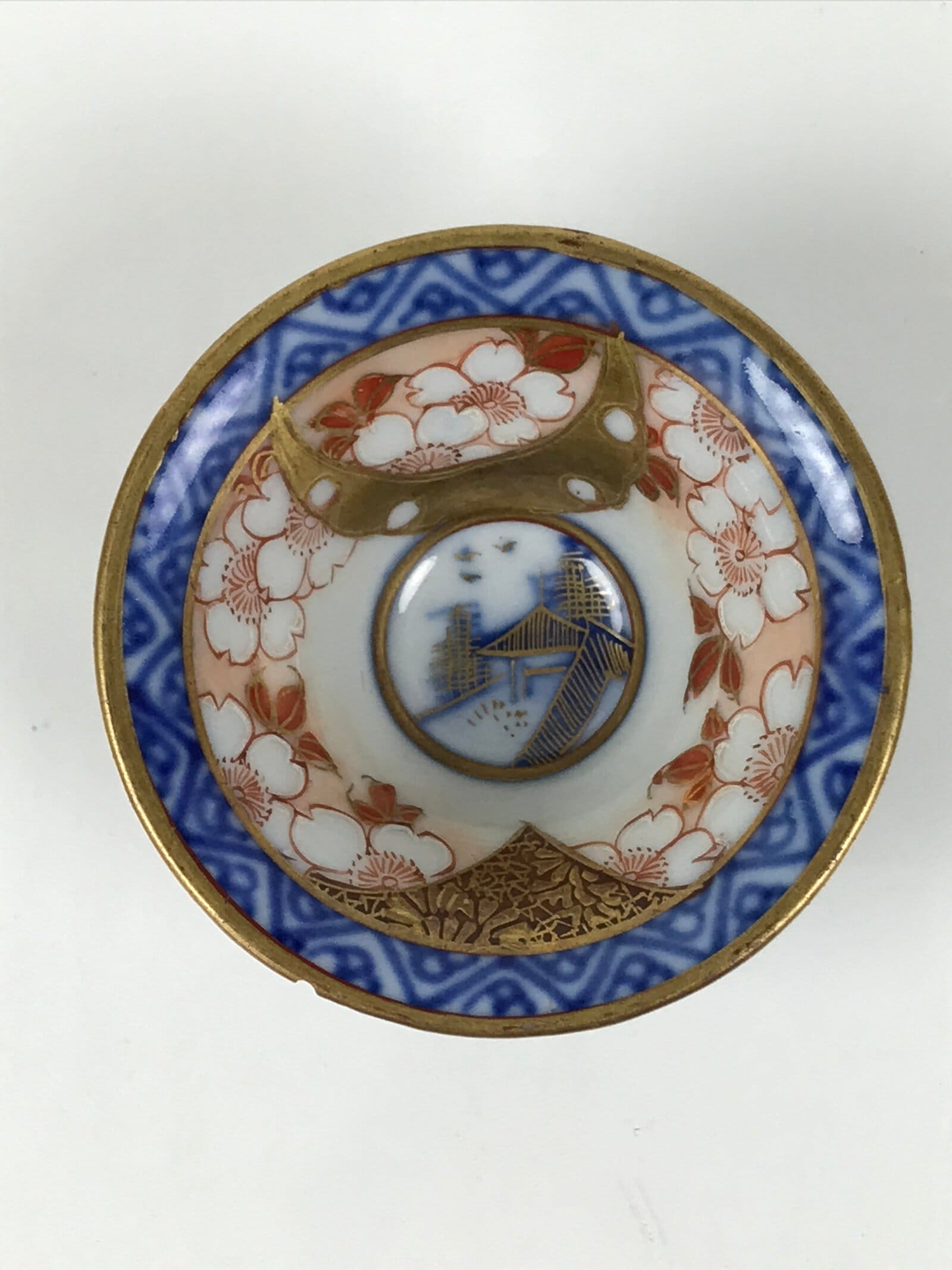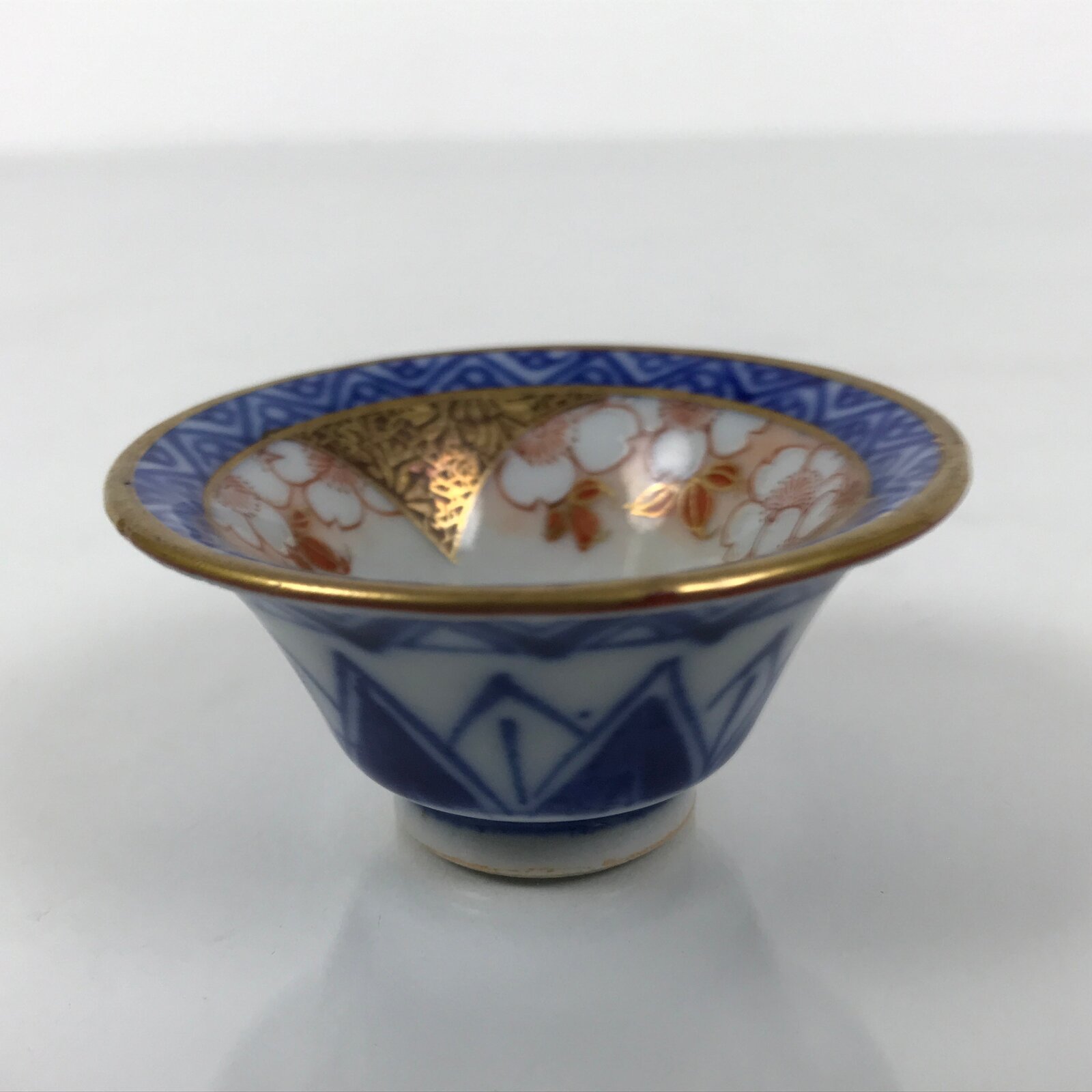 This is a vintage Japanese Kutani porcelain sake cup. This particular type of cup is called rappa or “trumpet type” due to its resemblance to the bell of a trumpet. In terms of size, it is also called ochoko. It features a gorgeous peachy pink cherry blossom (sakura) design on the inside with a simplistic temple image at the very bottom. The border around the rim is a triangular pattern with the actual rim being painted gold. The outside has a continuation of the triangular pattern in a stark indigo blue on white.