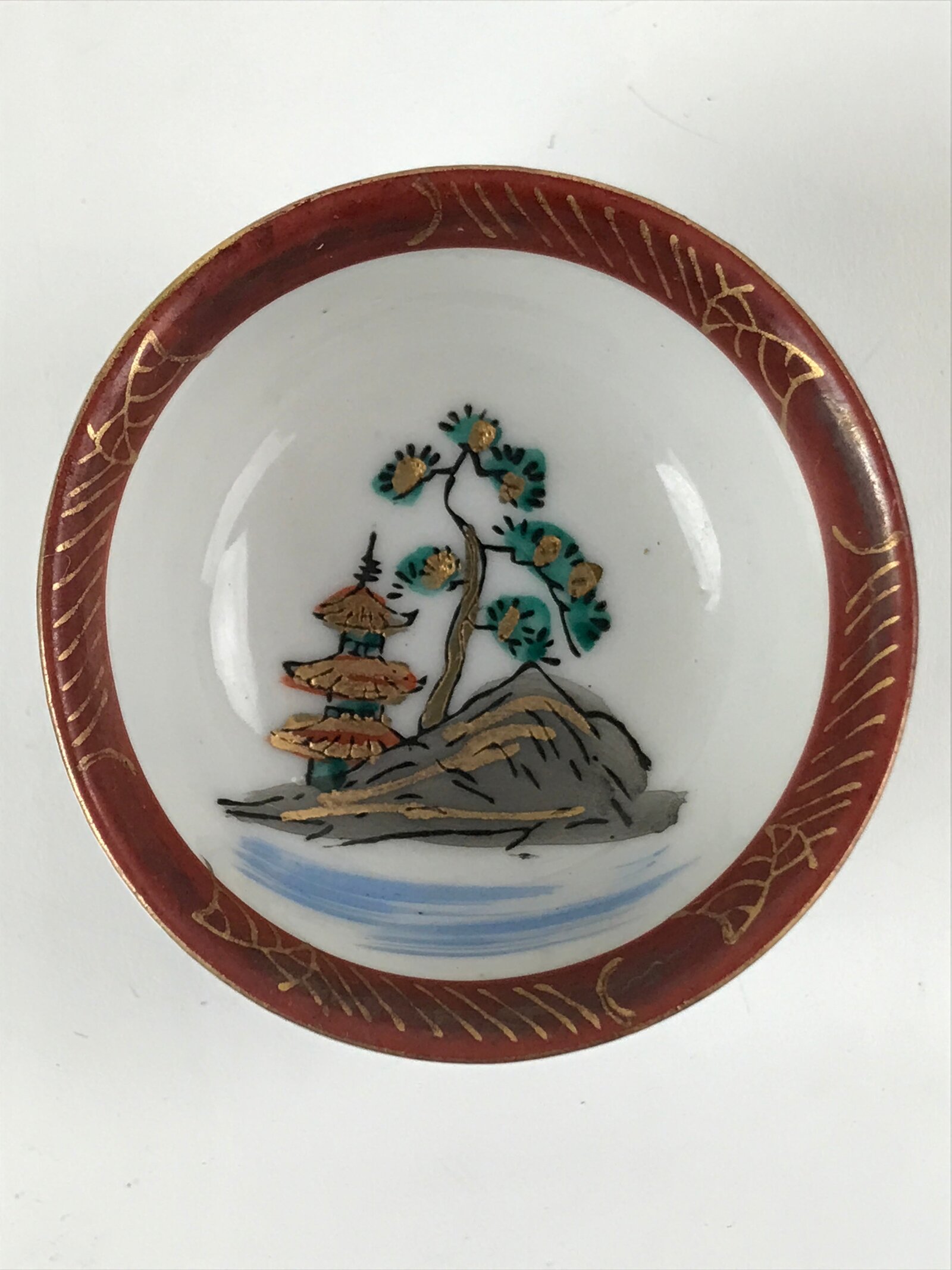 This is a vintage Japanese porcelain sake cup. This particular type of cup is called tsubomi or “bud type” due to its resemblance to a flower bud. In terms of size, it is also called ochoko. It has a hand-painted scene of a pagoda on a rock in the sea with a large pine tree in gray, red, gold, and green. There is a decorative red and gold inside rim. The blue design on the outside is another version of the image inside.