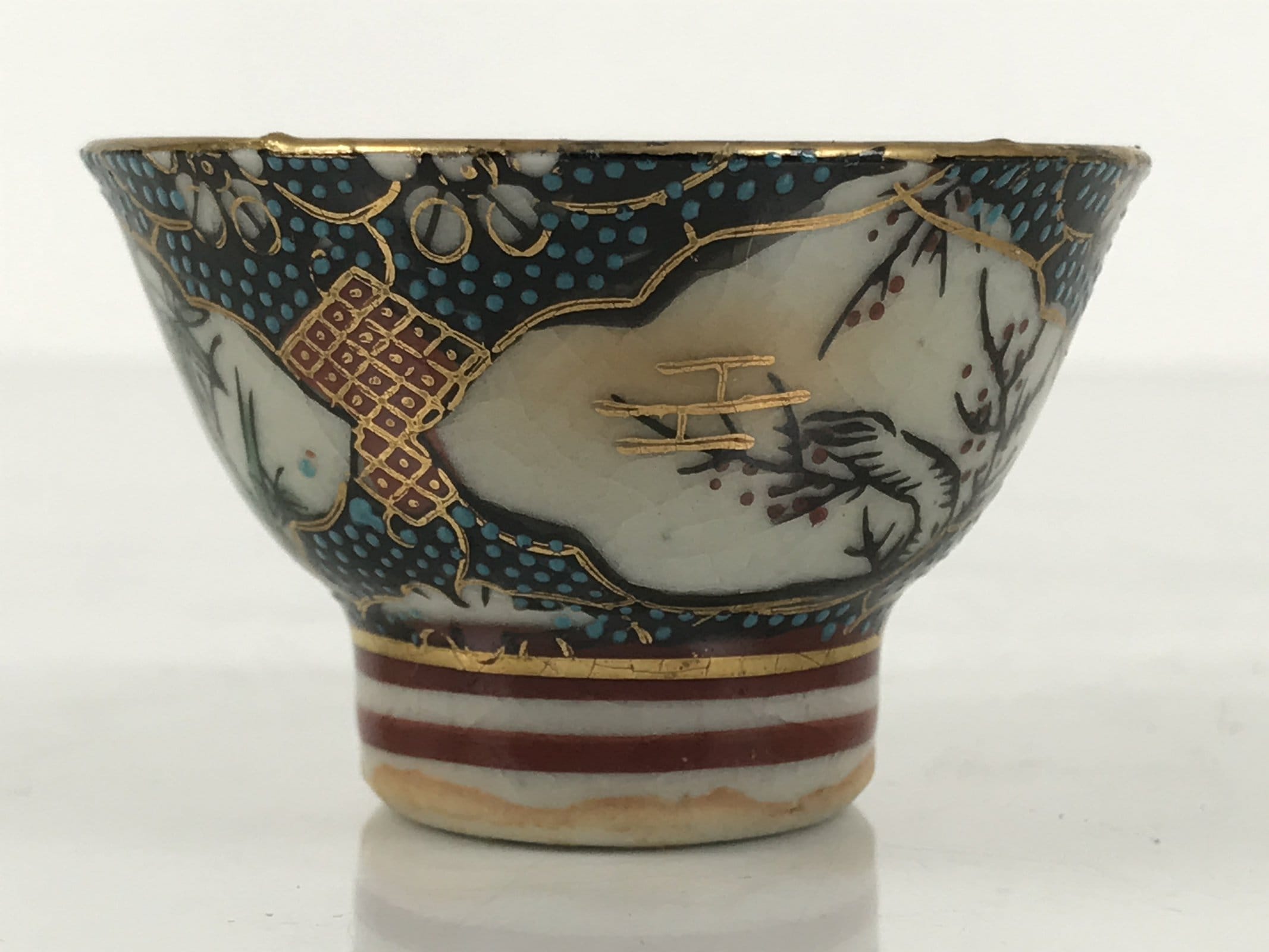 This is a vintage Japanese Kutani porcelain sake cup. This particular type of cup is called wan or “bowl type” due to its resemblance to a rice bowl. In terms of size, it is also called ochoko. This beautiful imari sake cup is fully decorated with precise gold linework surrounding a shochikubai (Pine, plum blossom, bamboo) motif on a raised-texture blue dotted background. Each scene is beautifully illustrated with green, gold, and red. The inside is a grayish-beige. It has a red Kutani marking on the bottom.