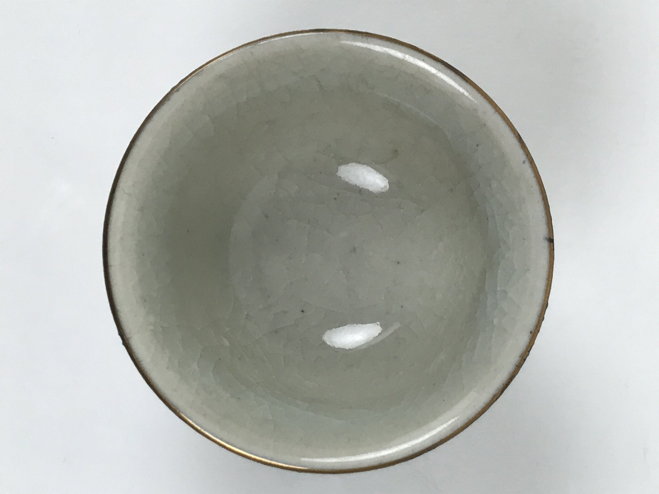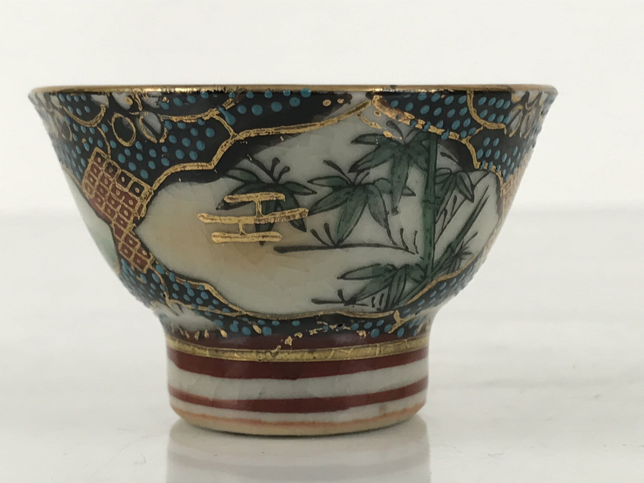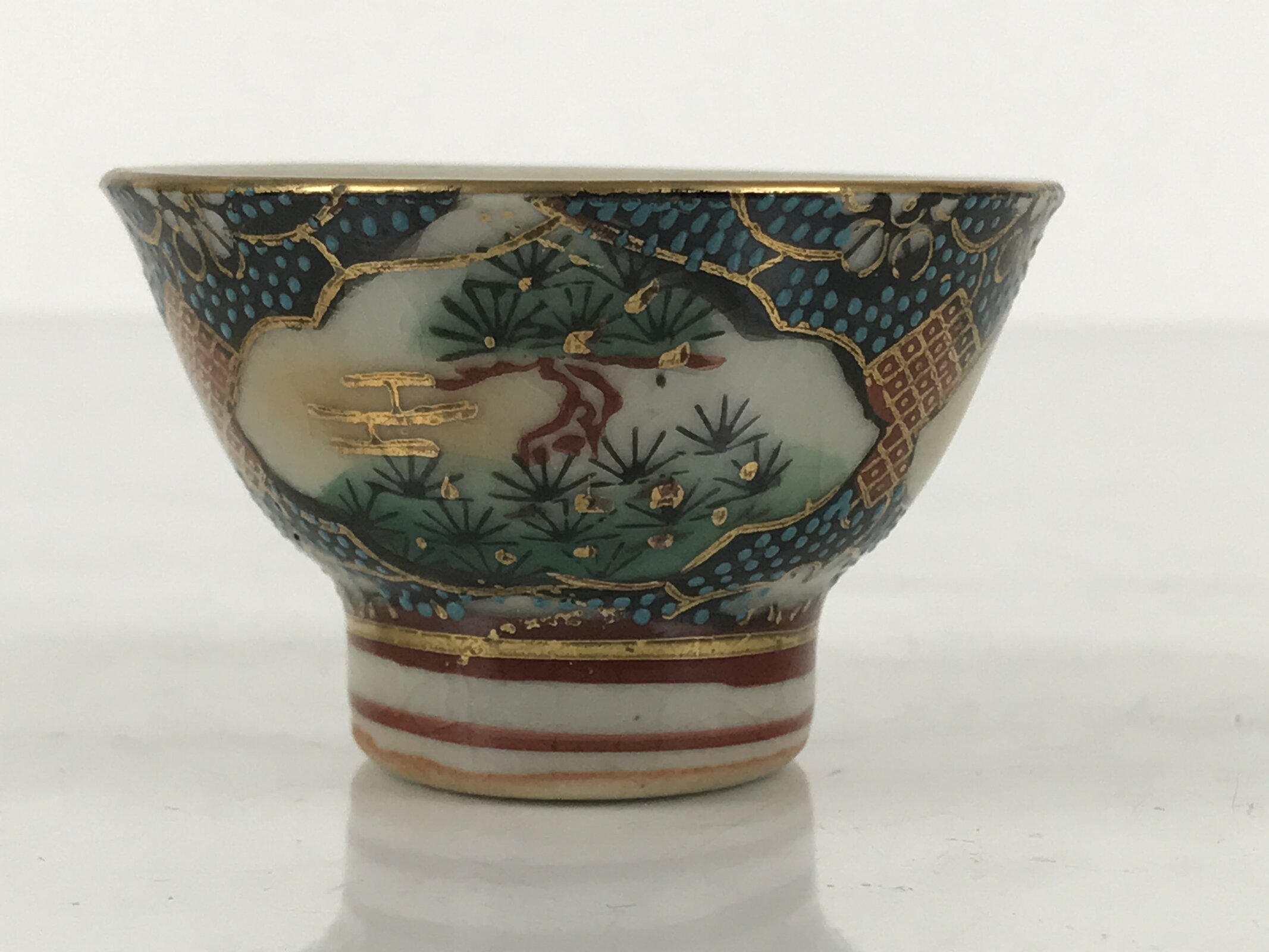 This is a vintage Japanese Kutani porcelain sake cup. This particular type of cup is called wan or “bowl type” due to its resemblance to a rice bowl. In terms of size, it is also called ochoko. This beautiful imari sake cup is fully decorated with precise gold linework surrounding a shochikubai (Pine, plum blossom, bamboo) motif on a raised-texture blue dotted background. Each scene is beautifully illustrated with green, gold, and red. The inside is a grayish-beige. It has a red Kutani marking on the bottom.
