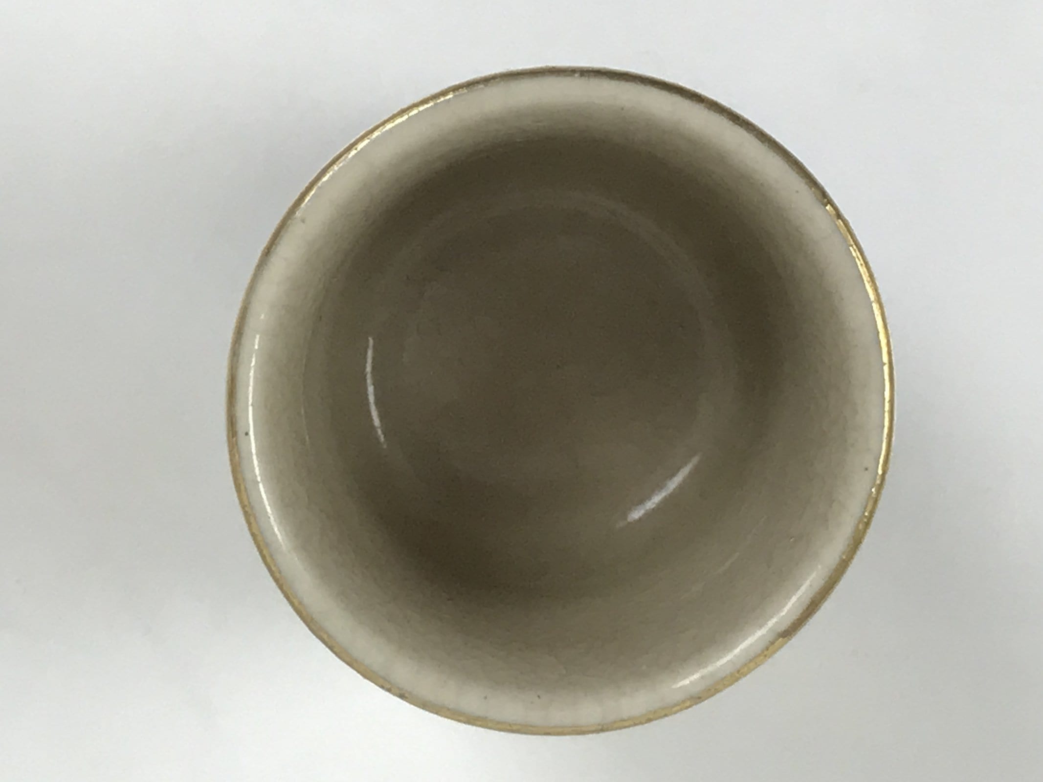 This is a vintage Japanese Kutani porcelain sake cup. This particular type of cup is the standard shape, also called straight-type. In terms of size, it is also called ochoko. This beautiful imari sake cup is fully decorated with precise gold linework as well as large, raised-texture, white blooming peony flower. It has the Kutani marking on the bottom.